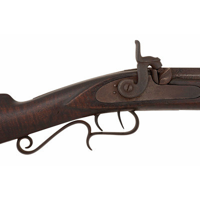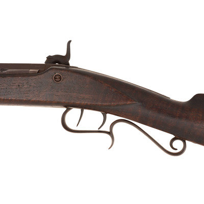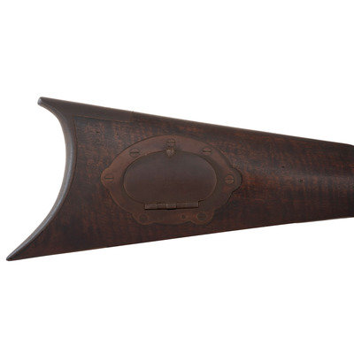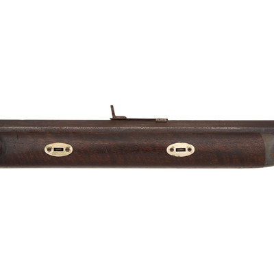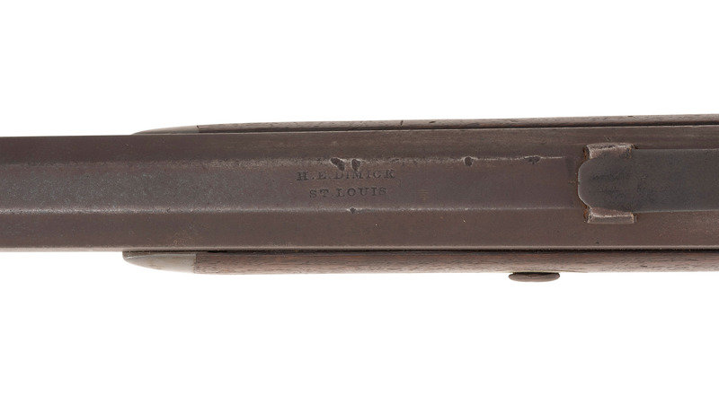 .50 caliber. 36" double-keyed hook breech octagonal barrel. SN: NSN. Browned finish, iron furniture, German silver escutcheons, walnut half-stock with pewter nose cap. Unmarked single screw percussion lock with double set triggers, barrel marked "H.E. DIMICK/ST LOUIS". Heavy barrel measures 1" across the flats at the muzzle with an exaggerated snail shaped bolster and a long wasp-waisted two-screw tang. Plain iron oval patchbox, scroll shaped triggerguard with finger extension, crescent iron buttplate and plain toe plate. Buckhorn rear sight, dovetailed German silver Rocky Mountain front sight blade. Ramrod an old wood replacement. A wonderful and essentially untouched example of a prototypical Plains Rifle by one of the most notable of the St. Louis makers.