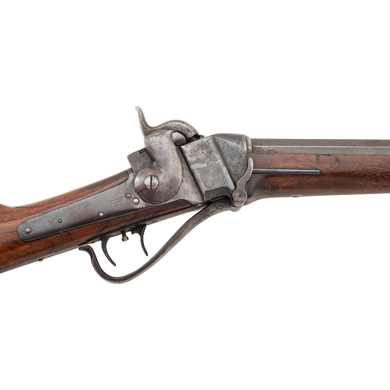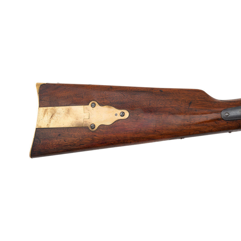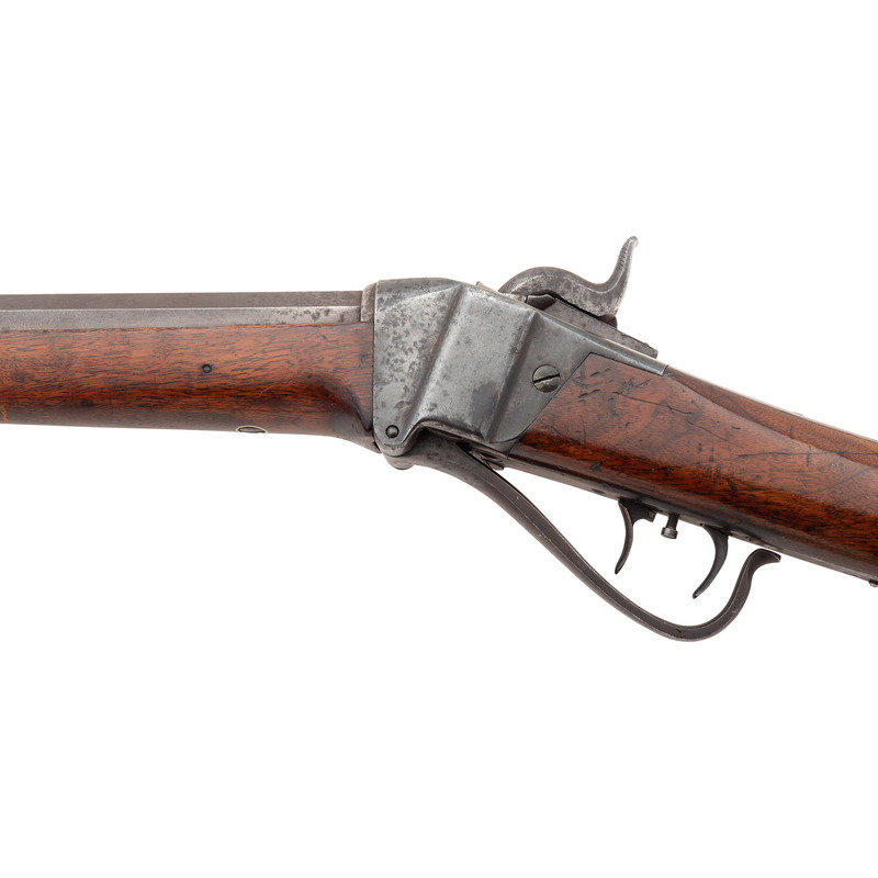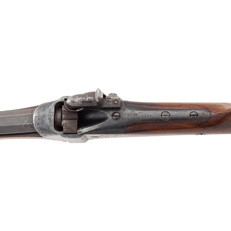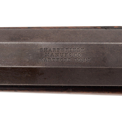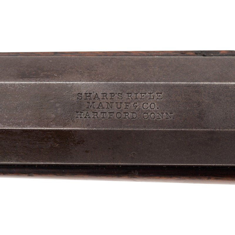 90-bore (.373 caliber). 27" octagonal barrel. SN: 3187. Browned and color casehardened finish, brass furniture, smooth, straight-gripped varnished walnut stock. Matching serial numbers on receiver tang, under barrel and in forend. Lock marked "C SHARPS'/PATENT/1852". Tang marked "C SHARPS/PATENT/1848" and with the serial number. Barrel marked "SHARPS RIFLE/MANUFG CO/HARTFORD, CONN". The Model 1852 was the first series of Sharps arms equipped with the Lawrence patent pellet primer system, as is this one. This one appears to be incomplete and is missing the feed spring and arm. Rifle is equipped with adjustable double-set triggers, standard "squirrel ear" leaf rear sight and dovetailed German silver front sight blade in brass base. Standard brass buttplate and patchbox, forend tip appears to be German silver, rather than the typical pewter. Sharps factory records indicate that roughly 600 Model 1852 Sporting Rifles were produced circa 1852-1854 and of those only 98 were 90-bore octagonal barrel "plain" guns that were not engraved. An attractive and not particularly common Sharps Sporting Rifle.