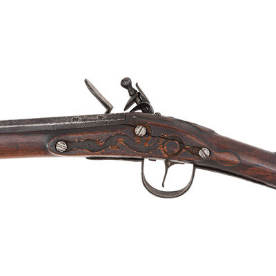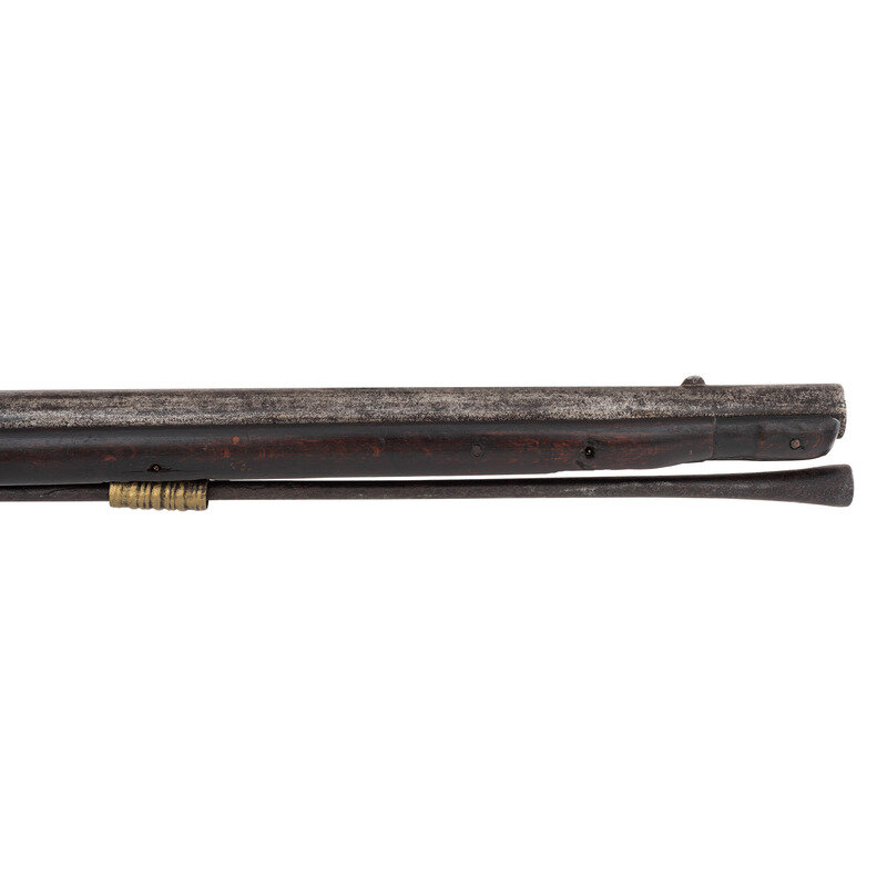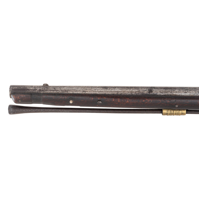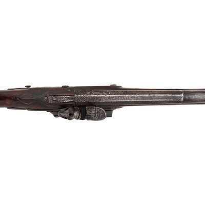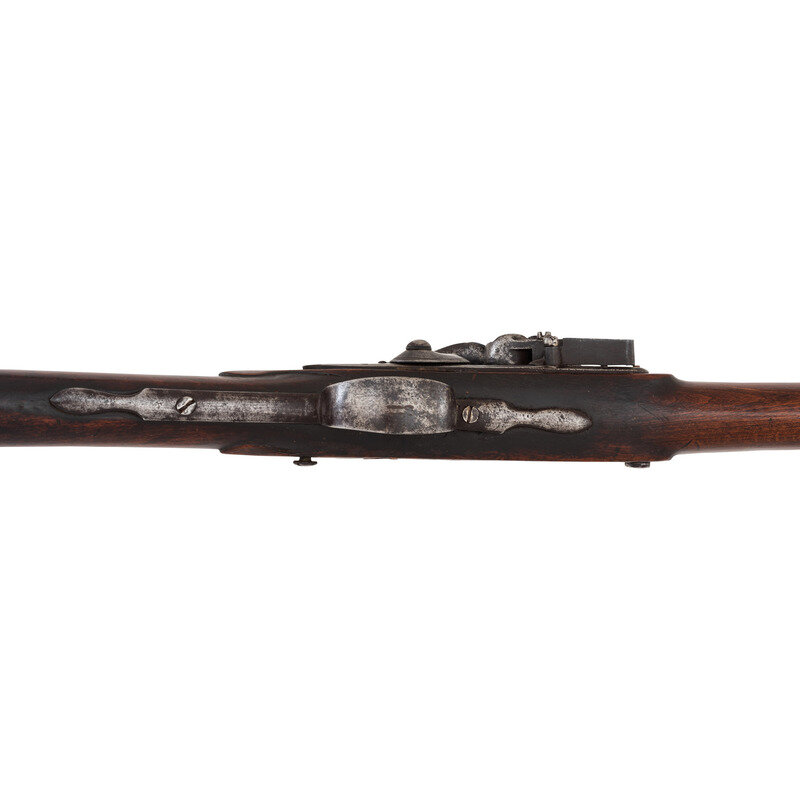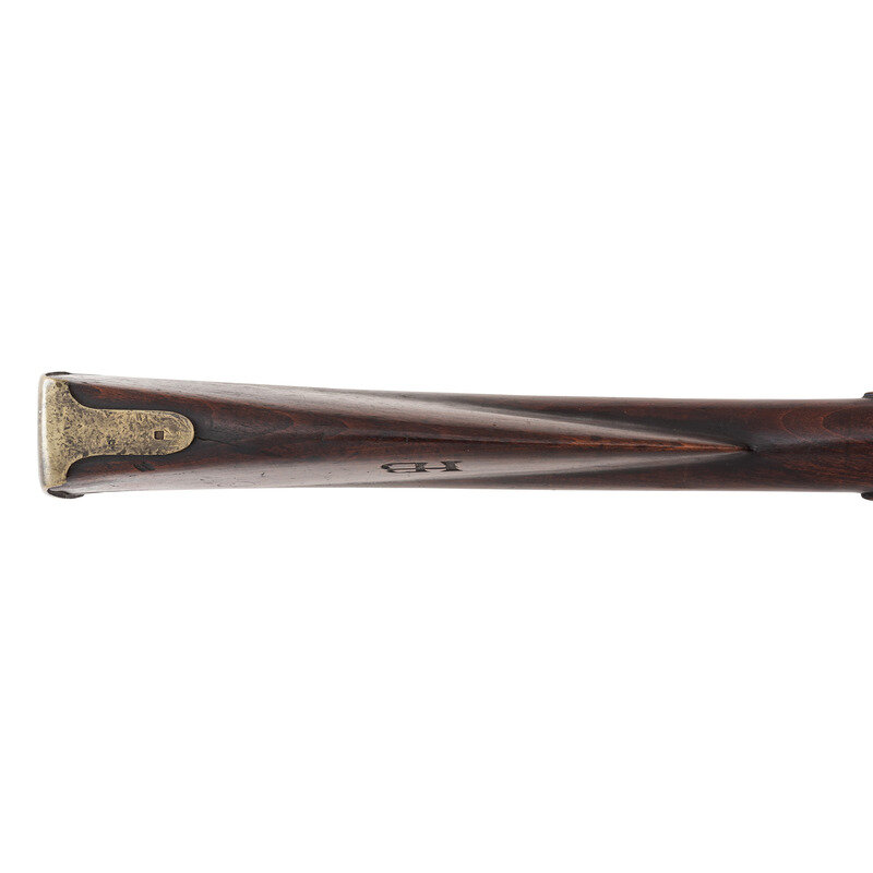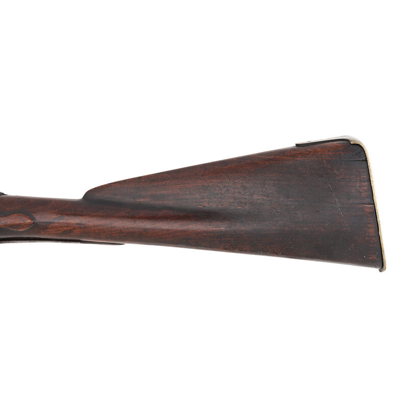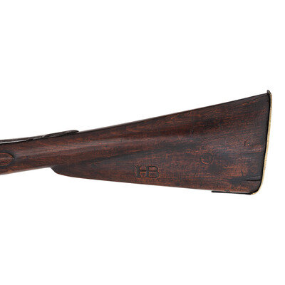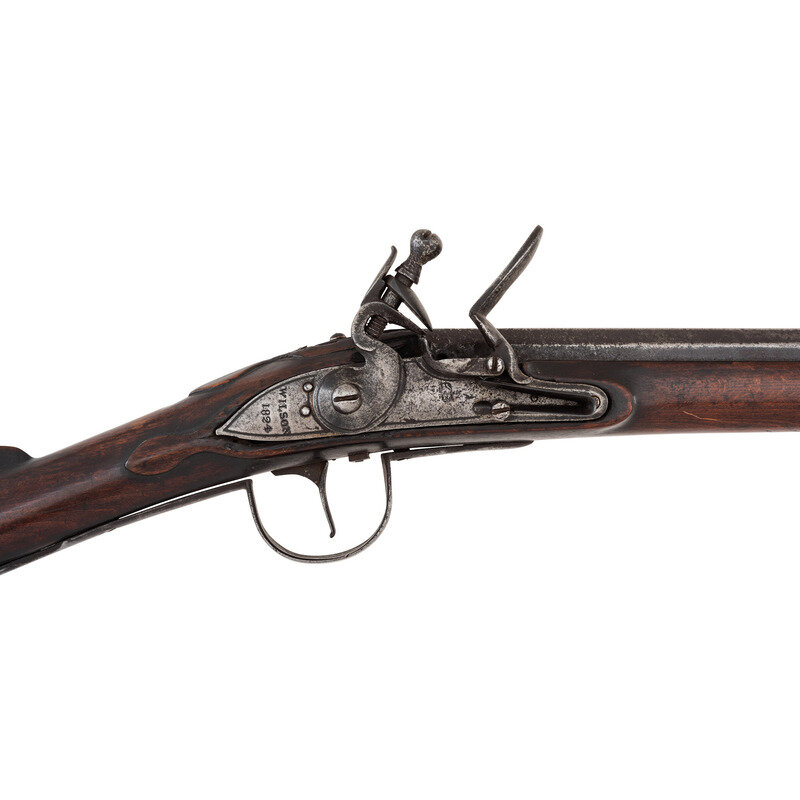 .58 caliber. 36.125" pinned three-stage octagon to round barrel with baluster turned rings at the transition. SN: NSN. Moderately oxidized barrel, brass and iron furniture, walnut stock. Original flint lock marked "WILSON" over "1824" vertically at the tail and with the Hudson's Bay Company trademark "{Tombstone Fox/EB}" mark under the bridled and fenced rounded iron pan. Rounded swan neck cock appears original. Breech with London commercial proof marks and a "*/TB" makers mark, indicating the barrel was produced by Thomas Barnett. Stock with "{Circle-Fox}" mark on obverse butt and carved "HB" as well, simple flat brass buttplate retained by seven square head nails. Ribbed brass pipes retain an old trumpet head iron ramrod. William Wilson (I) son of gunmaker Richard Wilson worked in London from the mid-18th century having been Freed of the Gunmakers Company in 1754, until his death in 1808. During that time he was a contractor for the Board of Ordnance, the East India Company and the Hudson's Bay Company. According to Jim Gordon's research it was Richard Wilson who establish the prototypical pattern of the Northwest Trade Gun, including the brass serpentine sideplate, the oversized large-loop triggerguard, the "double ring" barrel and the flat brass buttplate, all features that help to quickly identify a trade gun from this period.