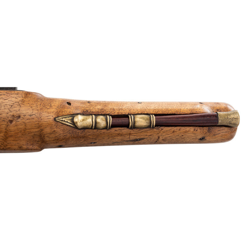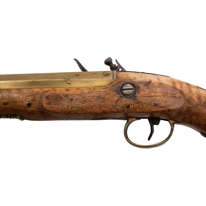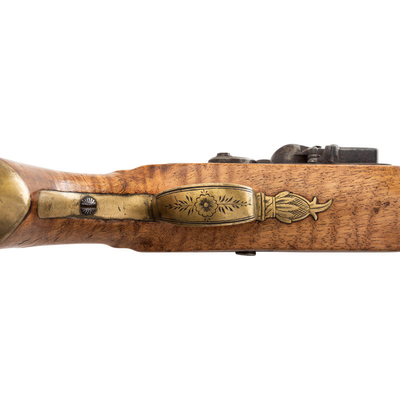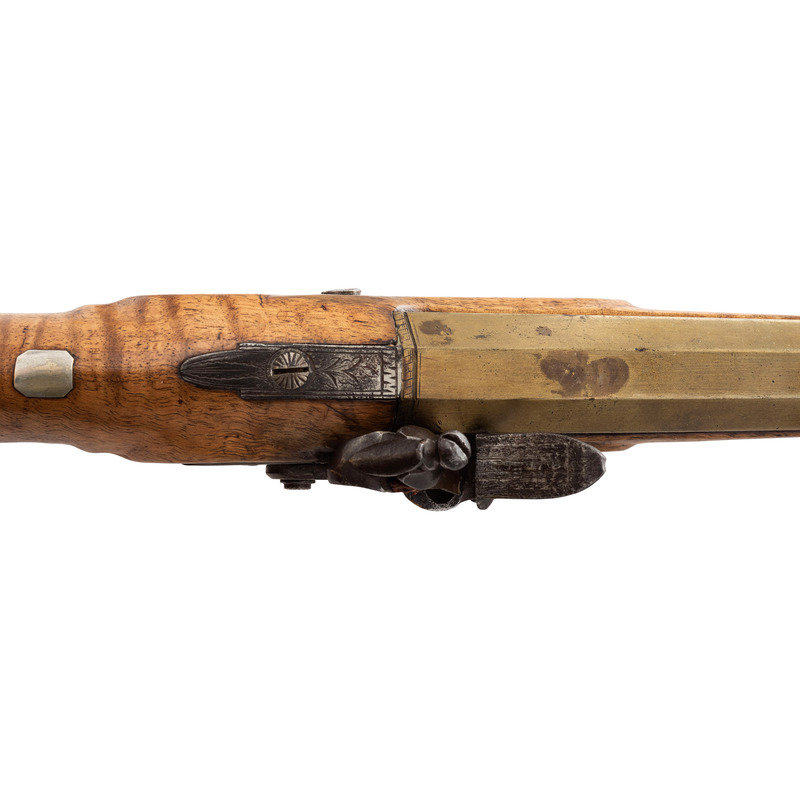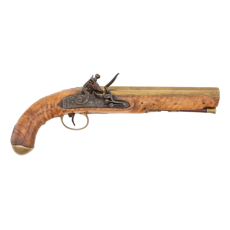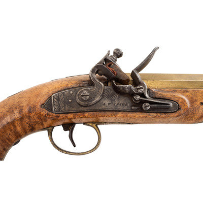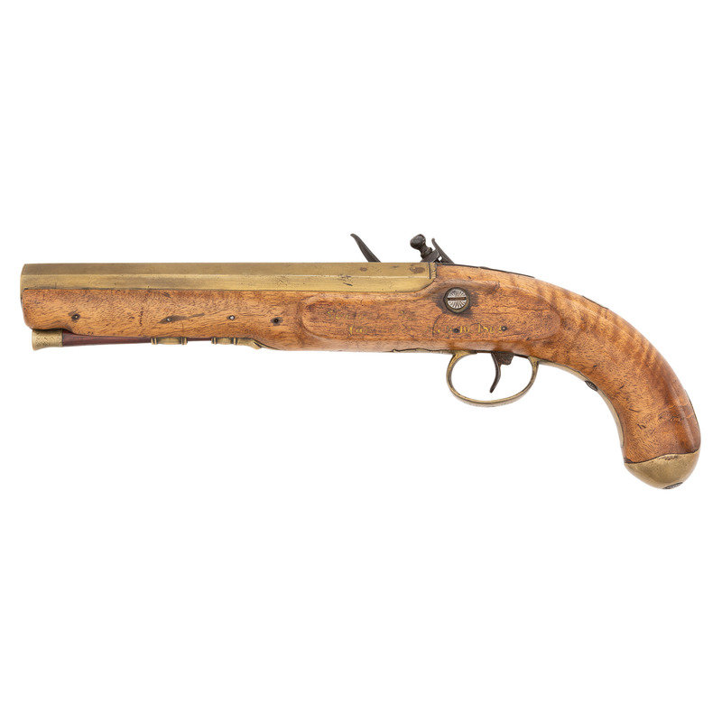 .72 caliber. 8.5" pinned heavy octagonal brass barrel. SN: NSN. Bright finish, brass furniture, hardwood stock. Single screw flint lock with fenced, waterproof, bridled pan and faceted flat cock is marked "A W SPIES" under the pan. Barrel with post-1813 Birmingham proofs. Engraved brass triggerguard with pineapple finial, small lozenge shaped German silver thumb piece on stock. Remnants of an old yellowish-gold painted label on the counterpane in a period hand appear to read "Norfolk Va/Captured May 10, 1862". This was the day that Federal forces took that Virginia port city from the Confederacy. While any sort of commemorative writing or painting on an item has to be viewed with a somewhat jaundiced eye, the remnants of this mark appear completely period and authentic. Pistol includes a brass tipped wood ramrod that is a replacement.