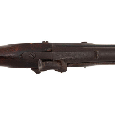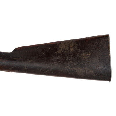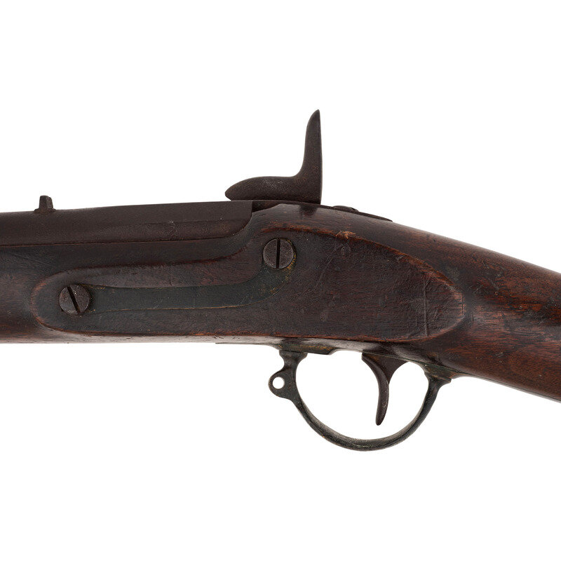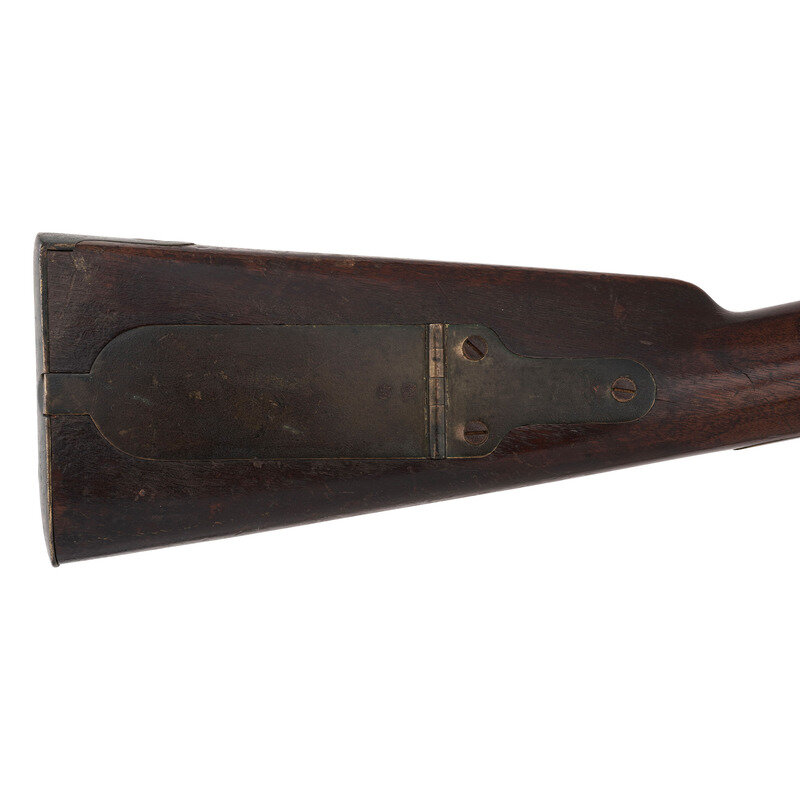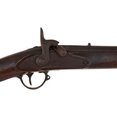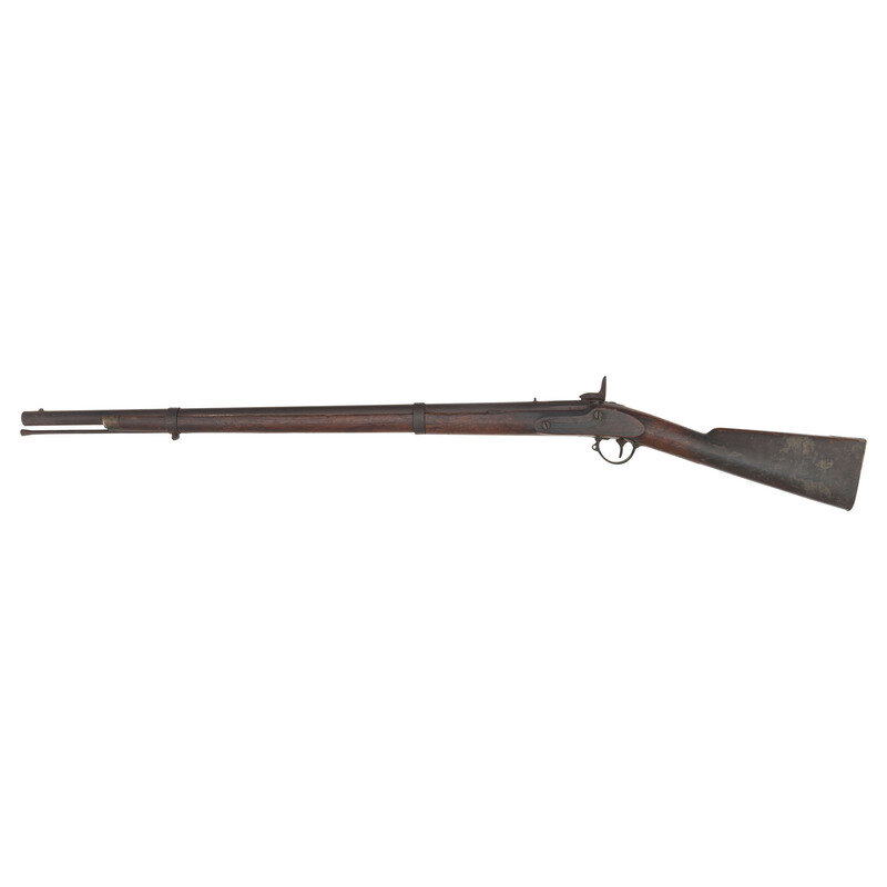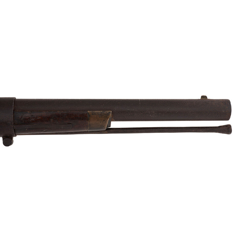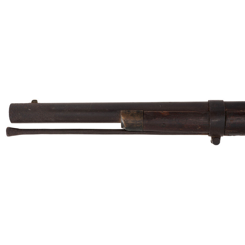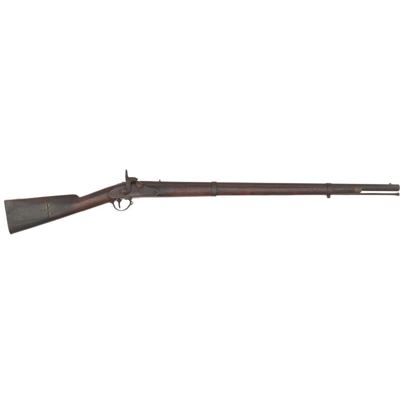 .58 caliber. 33" barrel secured by two flat, spring-retained iron bands. SN: NSN. Bright finish, brass and iron furniture, walnut stock. Flat military style percussion lock marked in two lines "LEMAN/LANCTR. PA" with nocksform of barrel marked similarly with lower line illegible due to pitting. Fixed notch rear sights, brass blade front sight, no provision for bayonet. Crudely made iron trumpet head ramrod appears to be a period of use replacement that is similar in appearance to the real Leman rod. Two-piece triggerguard, S-shaped side plate, buttplate and patchbox all of brass and US Model 1841 "Mississippi Rifle" style. These very scarce military pattern rifles were produced by Henry Leman of Lancaster and were really based on the US Model 1855 rifle, although as a simplified version. He hoped to acquire military contracts during the American Civil War to produce rifles and muskets for the US government. Less than 300 of these rifles were produced, and most references believe that the majority of the guns were re-sold to Pennsylvania arms makers J. Henry & Son and P.S. Justice, who then likely sold them to Pennsylvania militia units. In more than twenty years of collecting and dealing in Civil War long arms this is the only example this cataloger has handled with Mississippi Rifle style furniture and a Mississippi Rifle patchbox. A wonderful and very rare untouched Civil War militia rifle that may have been his original sample or prototype rifle for the run of militia rifles that he produced.