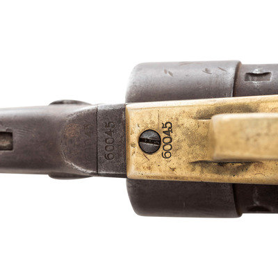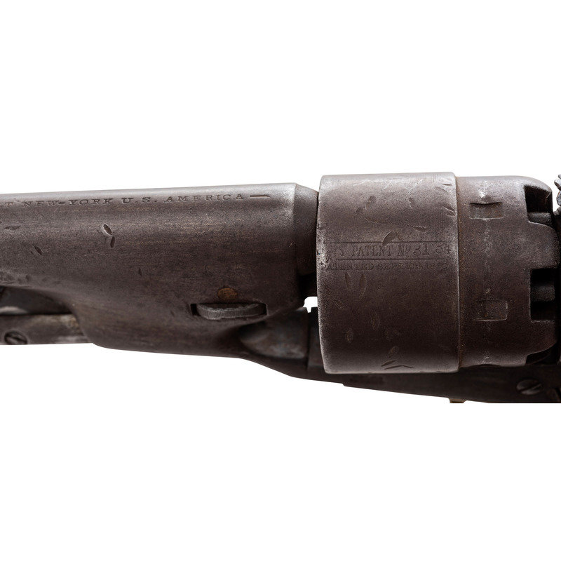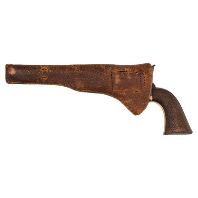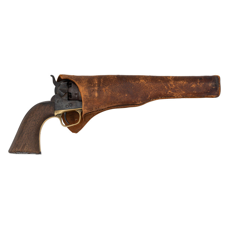 .44 caliber. 8" barrel length. SN: 60045. Heavily oxidized brown metal, brass triggerguard and grip frame, smooth one-piece walnut grip. Standard one-line New York barrel address. Visible numbers match except for cylinder which is #3134 and wedge which is an old replacement held in place with tape. Grip with weak shadows of cartouches on each side. Includes an old Slim Jim holster with moderate wear. A large format period image of the General is included as well.
