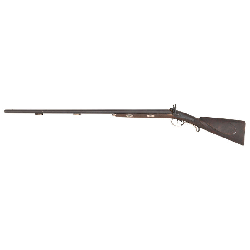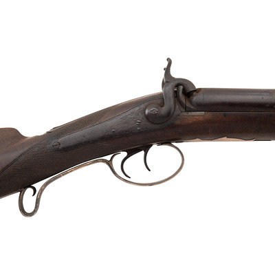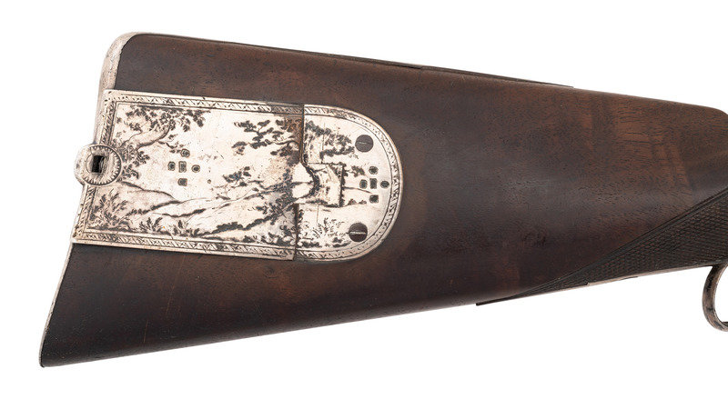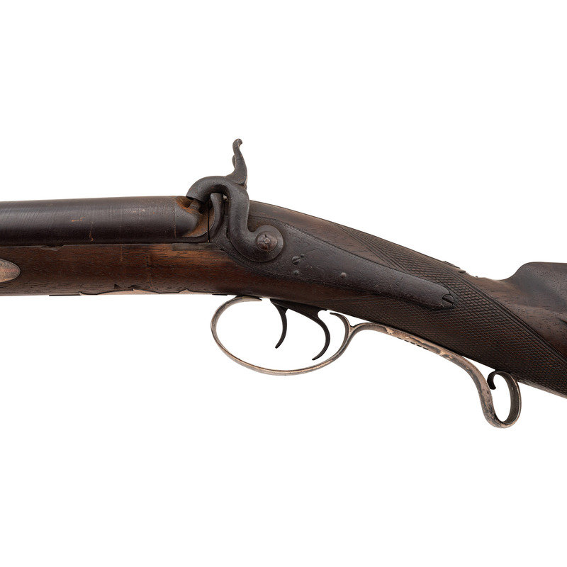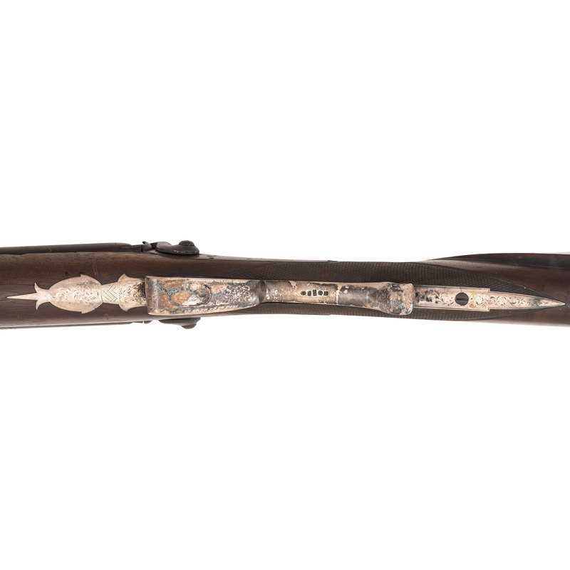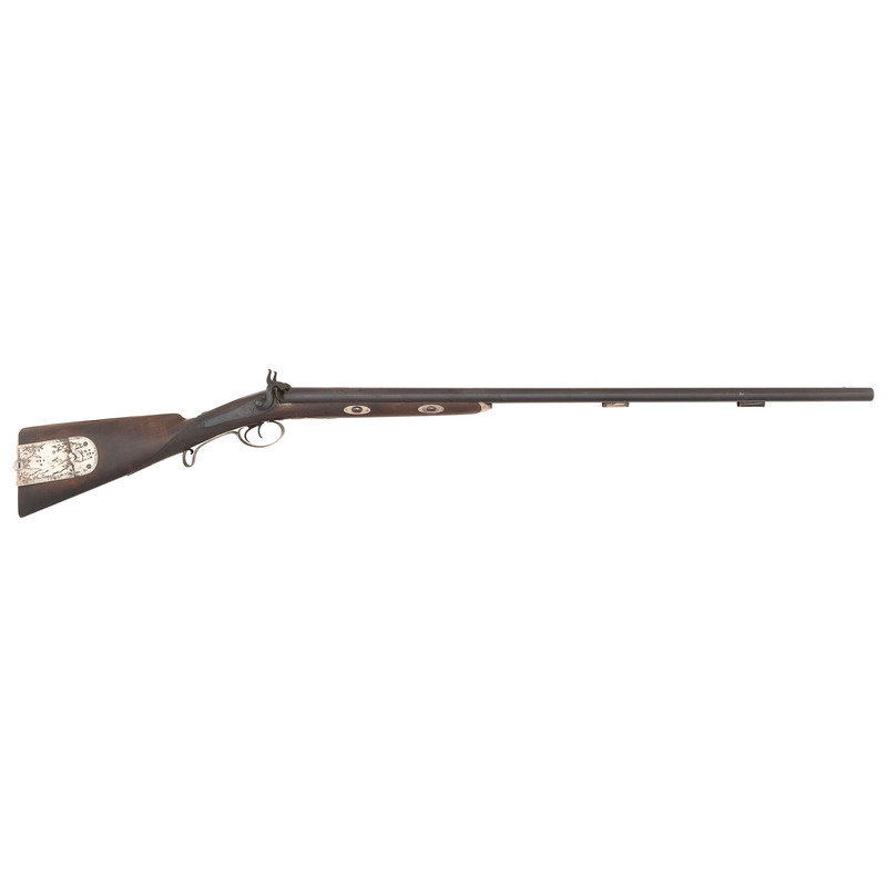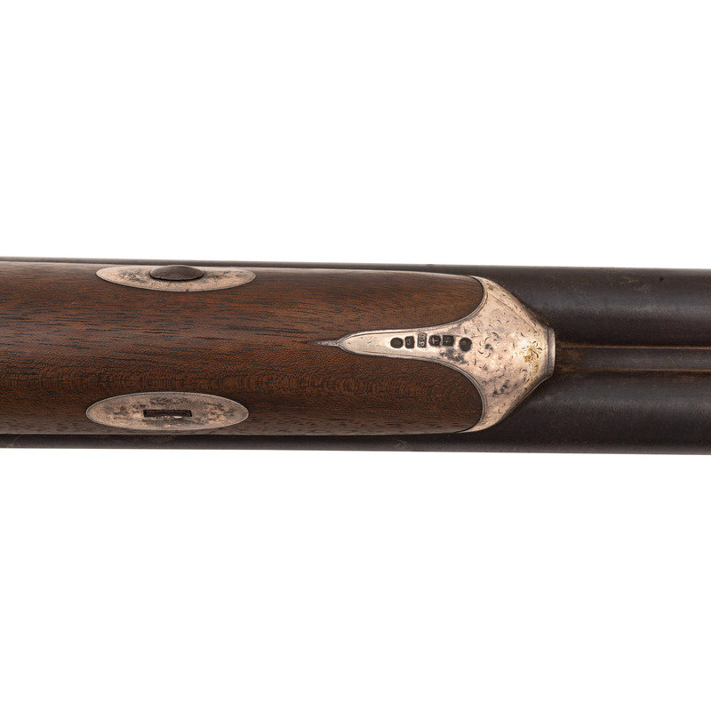 10-Gauge. 36" round Damascus barrels secured by two wedges. SN: NSN. Browned Damascus patterned barrels, engraved sterling silver furniture, checkered walnut straight-grip stock. Unmarked back action percussion locks and barrel rib, other than with inlaid silver arrow at muzzle. Birmingham commercial proof marks under the barrels. Double triggers, double hammers. Buttplate, triggerguard, combination nose cap and entry pipe and two-piece patchbox all marked with Birmingham Assay House silver hallmarks, including the assay house anchor, the lion passant, Queen Victoria, the maker mark "TP" and what appears to be a Gothic "R" date code, which would indicate 1840. Most of the silver fittings are engraved with forest and game scenes. A lovely, high grade mid-19th century English shotgun with sterling mounts. No ramrod.
