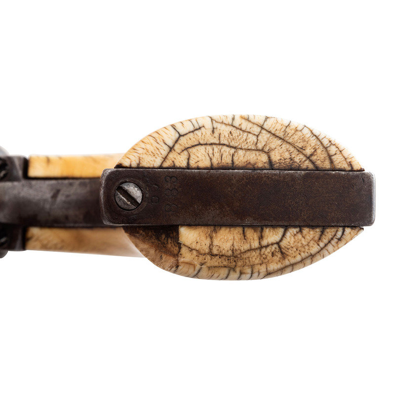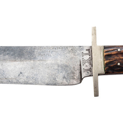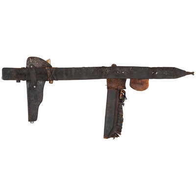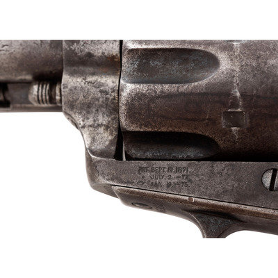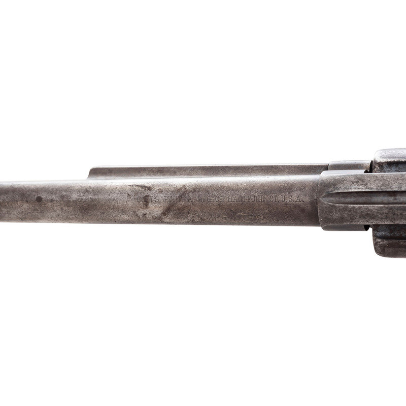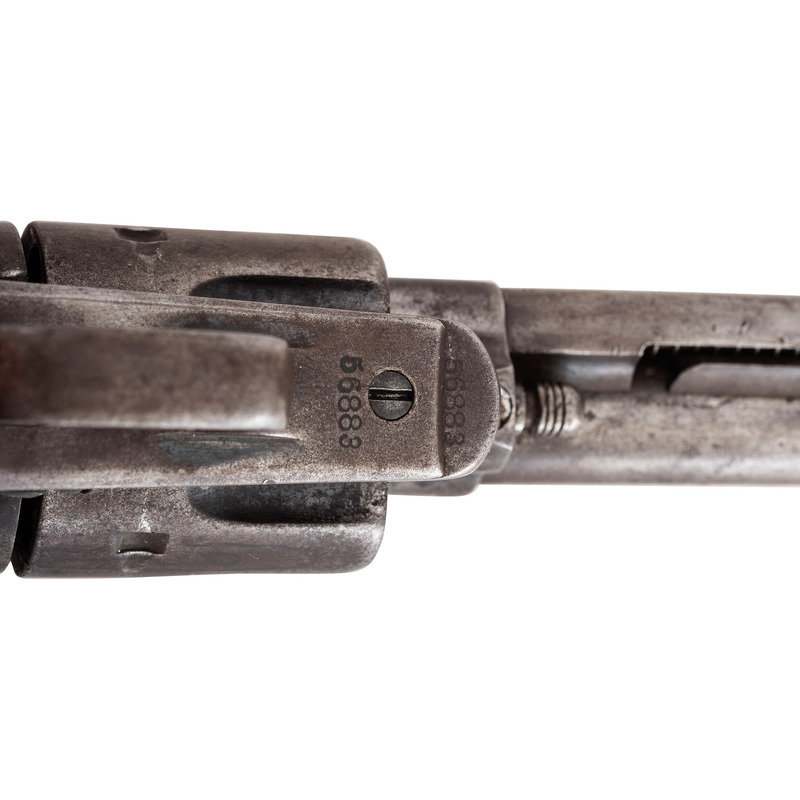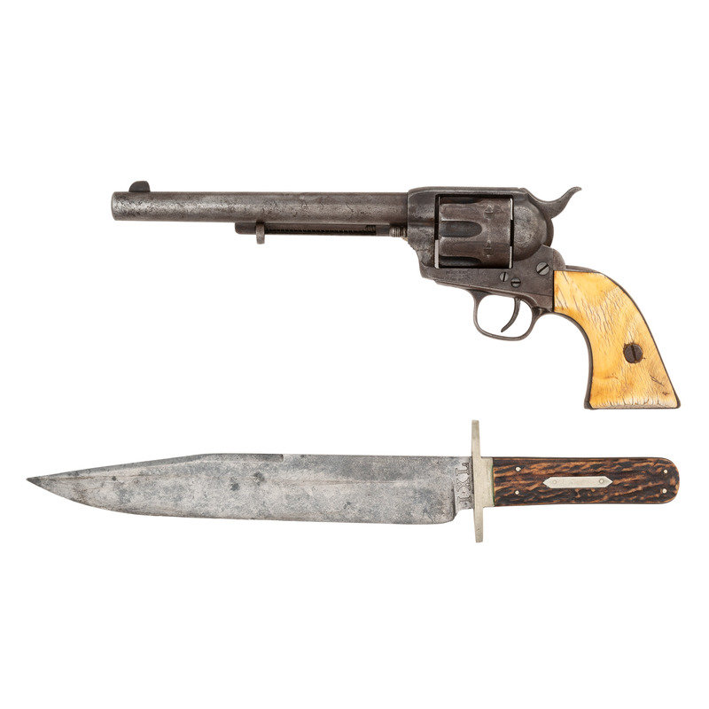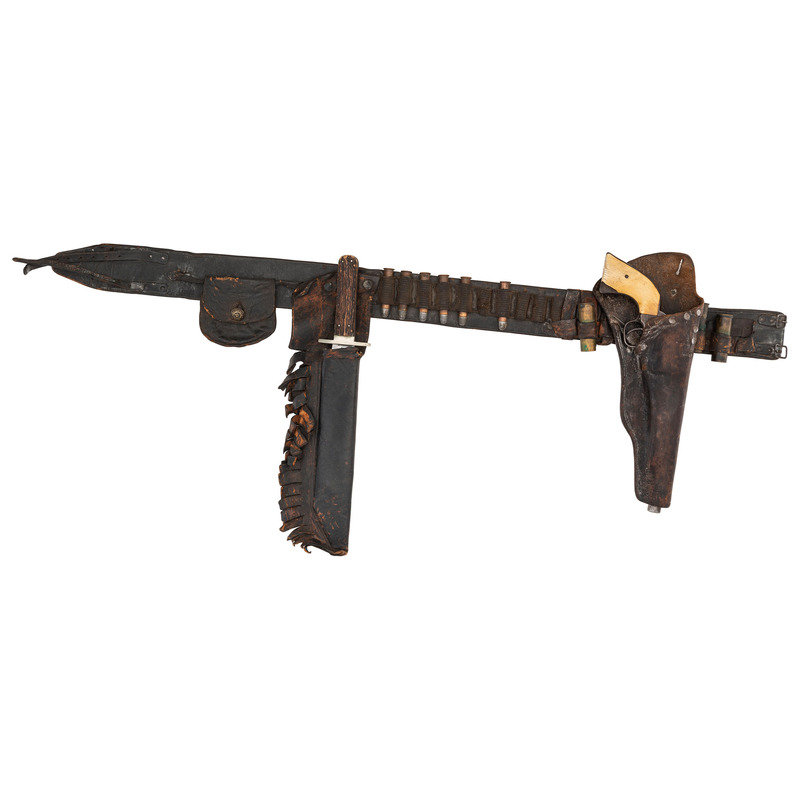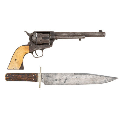 .44-40. 7.5" barrel length. SN: 56883. Manufactured in 1880. Blued and color casehardened finish, two piece bone grips. Weak one-line barrel address, three-date in three-line patent marking on lower left side of frame, "44" under barrel in front of cylinder pin. Matching numbers on frame, triggerguard, butt and barrel, no number visible on cylinder. Black powder frame, bullseye ejector rod head, firing pin missing from hammer. Grips apparently period of use replacements are two-piece bone secured with a single large head iron screw. Revolver is accompanied by a period assembled cartridge belt that has a 2.75" wide double-billet leather belt as its base, with a period modified civilian flap holster attached for the revolver, which has had the flap cut away. The belt includes 6 shotgun shell loops that contain 3 empty 12 gauge brass hulls, 10 .45 caliber loops that contain 6 copper cased .45-70 cartridges, a small, cap pouch style leather purse with brass button closure and a leather covered sheet tin knife sheath with fringe, which is secured to belt with iron rivets. The sheath contains a Sheffield Bowie knife marked IXL on the reverse ricasso and in three lines on the reverse of the blade at the spine: "G WOSTENHOLM & SON/WASHINGTON WORKS/SHEFFIELD". Knife measures 14.75" in overall length, with a 10" semi-clip point single edged bowie blade with a 6" false edge. 4.625" hilt with 3.875" German silver cross guard and pinned horn scales.
