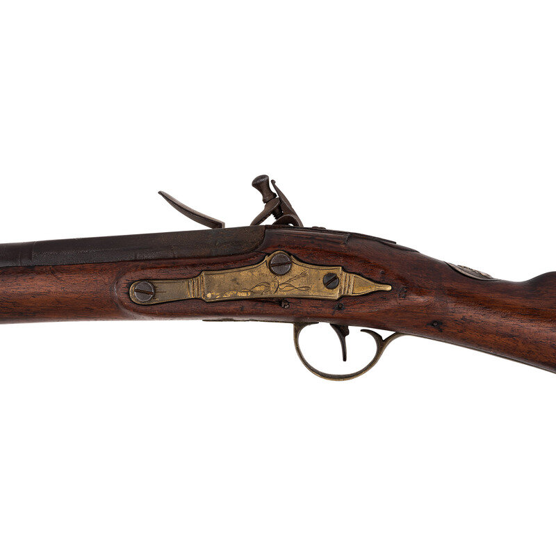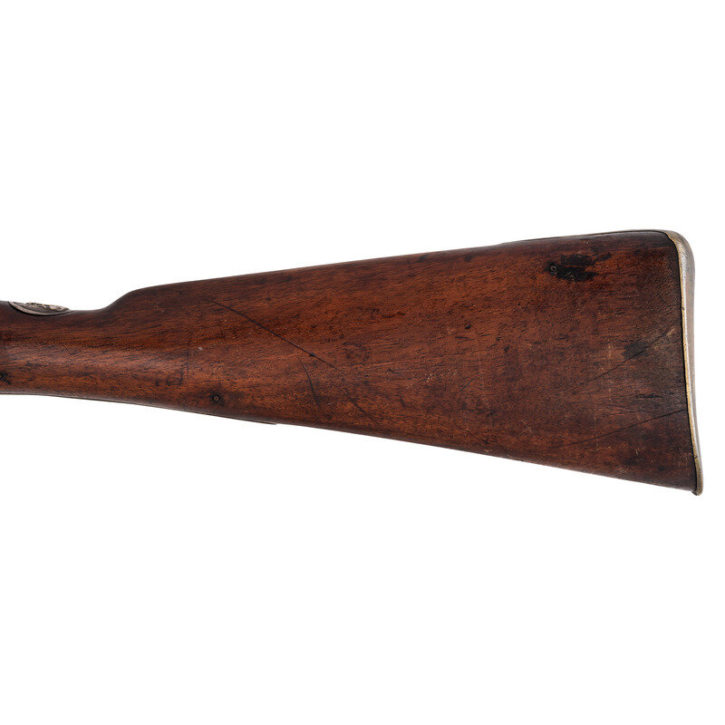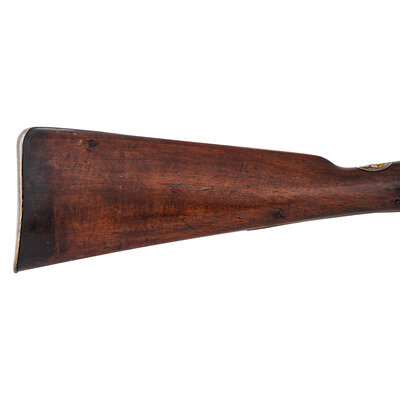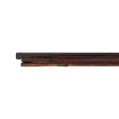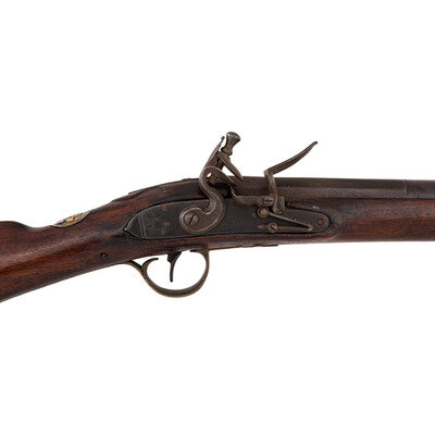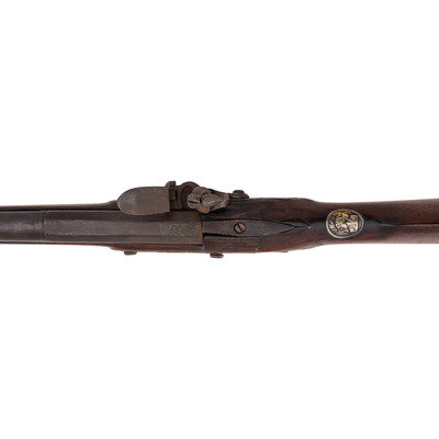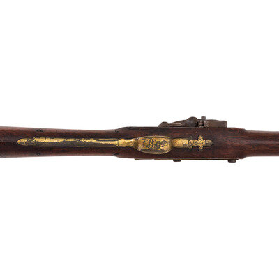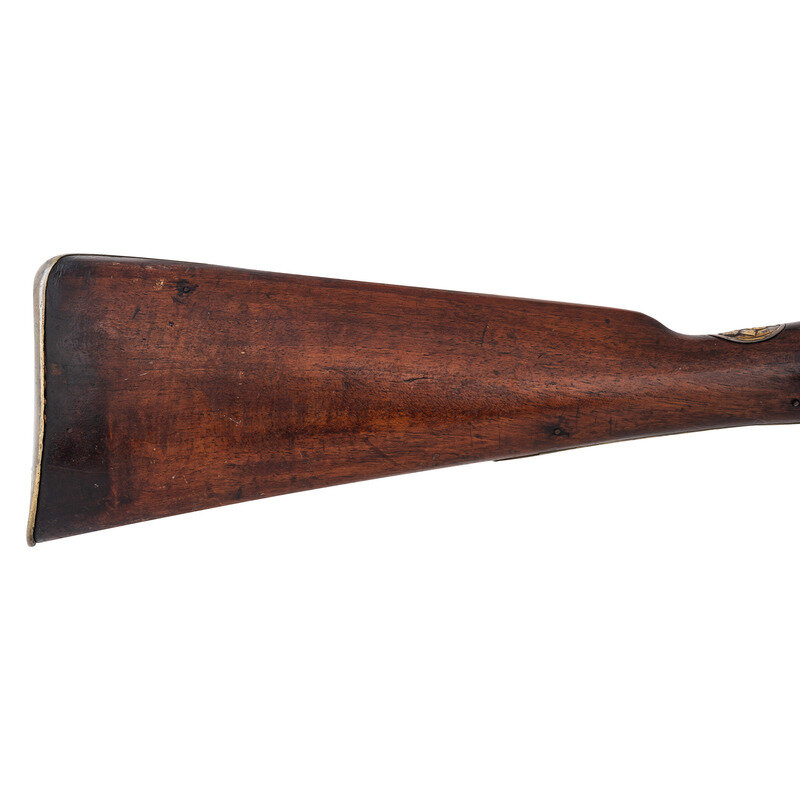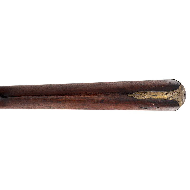 .60 caliber. 36" three-stage octagonal to round pinned barrel. SN: NSN. Browned finish, brass furniture, walnut stock. Lightly engraved reconverted flint lock marked "W. JACOT" under pan. Lock with roller frizzen and fenced and bridled rounded iron pan. Faceted swan neck cock a replacement. Barrel with weak "{CROWN}/GR/{BROAD ARROW}" Board of Ordnance inspection, but no accompanying "Broad Arrow" is present on the lock. Brass furniture lightly engraved with panoplies of arms on the triggerguard bow and simple martial motifs on the side plate and buttplate tang. Wrist with German silver Indian Chief thumb plate. This gun is a conundrum, as are the handful of other Jacot marked trade guns. William Jacot was Liverpool based, with Blackmore listing him as a "Merchant & Gun Manufacturer" and his working dates at 1847-1857. DeWitt Bailey lists him in Liverpool in 1847 and both note that he marked some guns "London". Jim Gordon, in Volume I of his three volume set Great Gunmakers for the Early West lists Jacot as working circa 1830-1857 and the two examples pictured in his book both appear to be the products of other makers, or at least assembled from parts made by Barnett and Ketland. This suggests that Jacot may have been much more of a "Merchant" than "Gun Maker". Gordon further notes that Jacot's first contract for trade guns was in 1837 with the American Fur Company. This one is interesting in that it utilizes a British military Board of Ordnance marked barrel. An attractive Chief's Grade trade gun from a scarce maker.