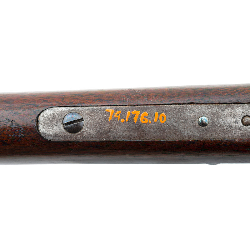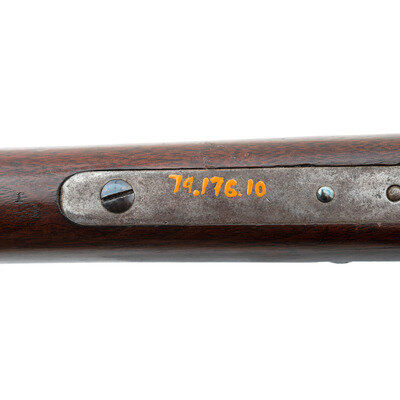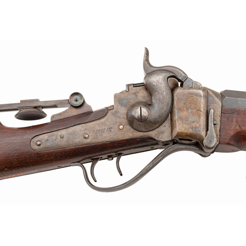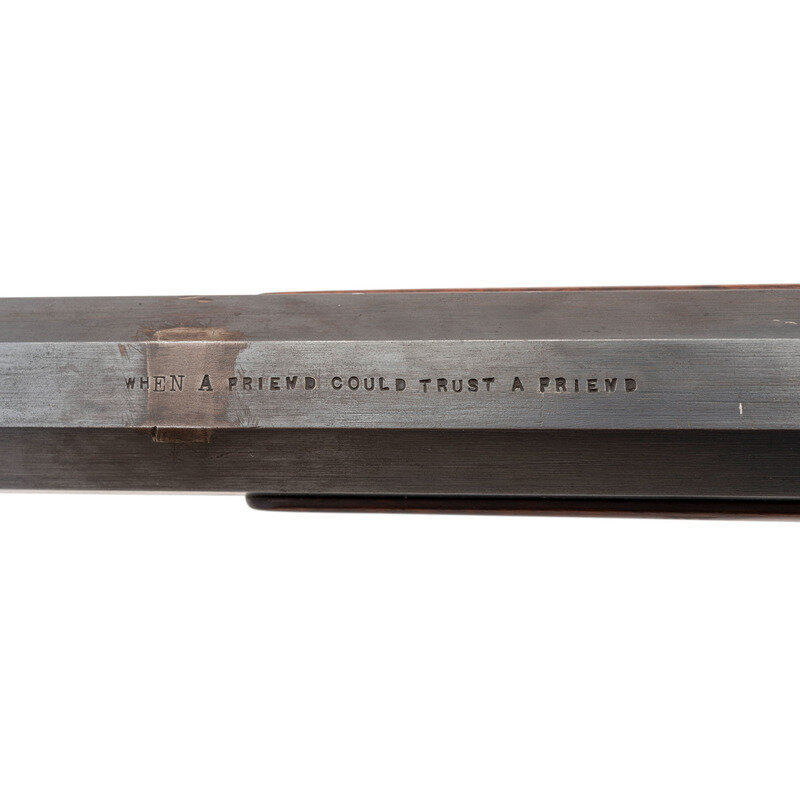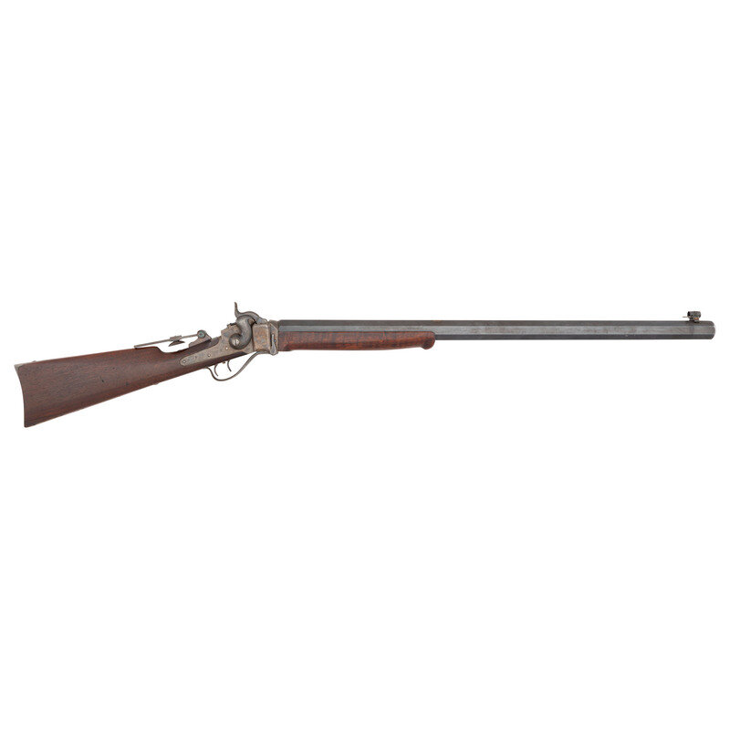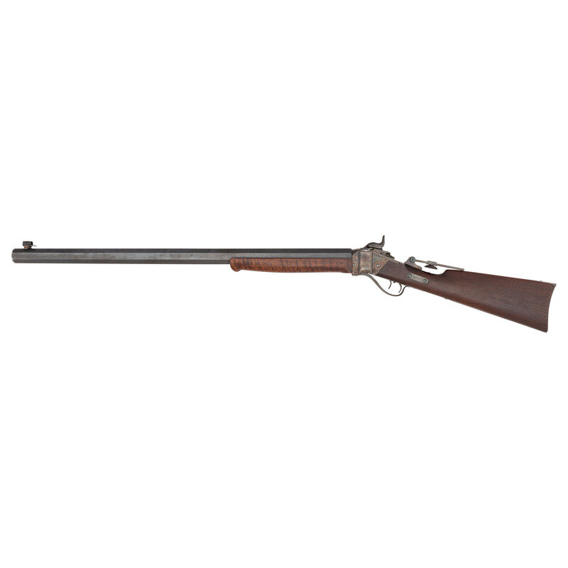 .45-100. 29.5" heavy octagon barrel. SN: 411?0. Blued and color casehardened finish, smooth straight-gripped walnut stock and Schanbel forend. Heavy barreled cartridge target rifle alteration of a Civil War period Sharps percussion carbine action. Unlike Meecham alterations which altered the percussion lock plates by cutting them down and removing the pellet priming system, this lock retains the basis of that mechanism, although the feed arm and spring have been removed. Standard Civil War era lock and receiver markings, top flat of barrel marked "WHEN A FRIEND COULD TRUST A FRIEND". Barrel measures 1.25" across the flats at the muzzle. Equipped with a Vernier tang sight, a globe front sight and double set triggers. Carbine sling bar recess in reverse stock filled with a blank plate. Triggerguard marked with the museum accession number "79.176.10". Consignor's notes indicate the gun was deaccessioned from the collection of the Western Reserve Historical Society in Cleveland, OH. The marking on the barrel could be a reference to the 1923 silent film The Covered Wagon which includes a scene where two drunk friends shoot tin cans from each other's heads at 100 yards to celebrate "the days when a friend could trust a friend". The film also includes a buffalo hunt scene, which would be appropriate for a heavy barreled Sharps.