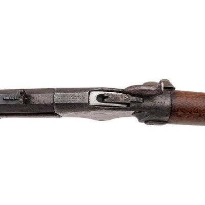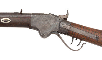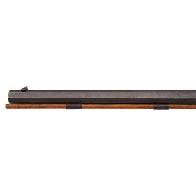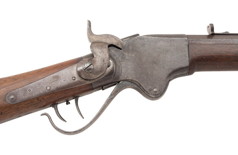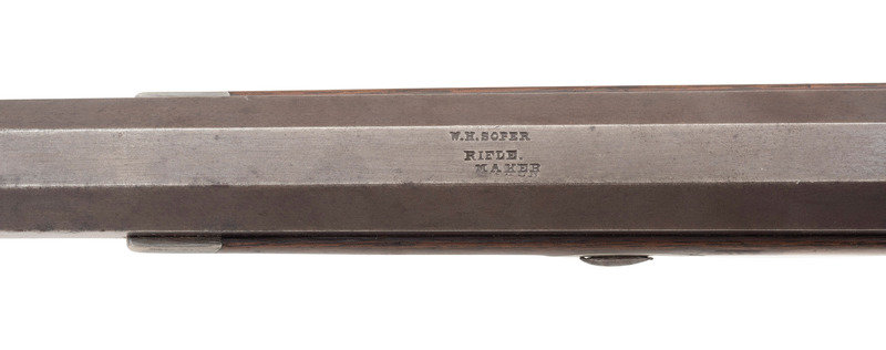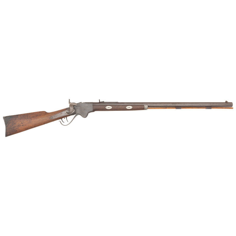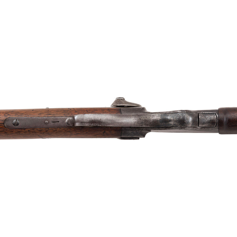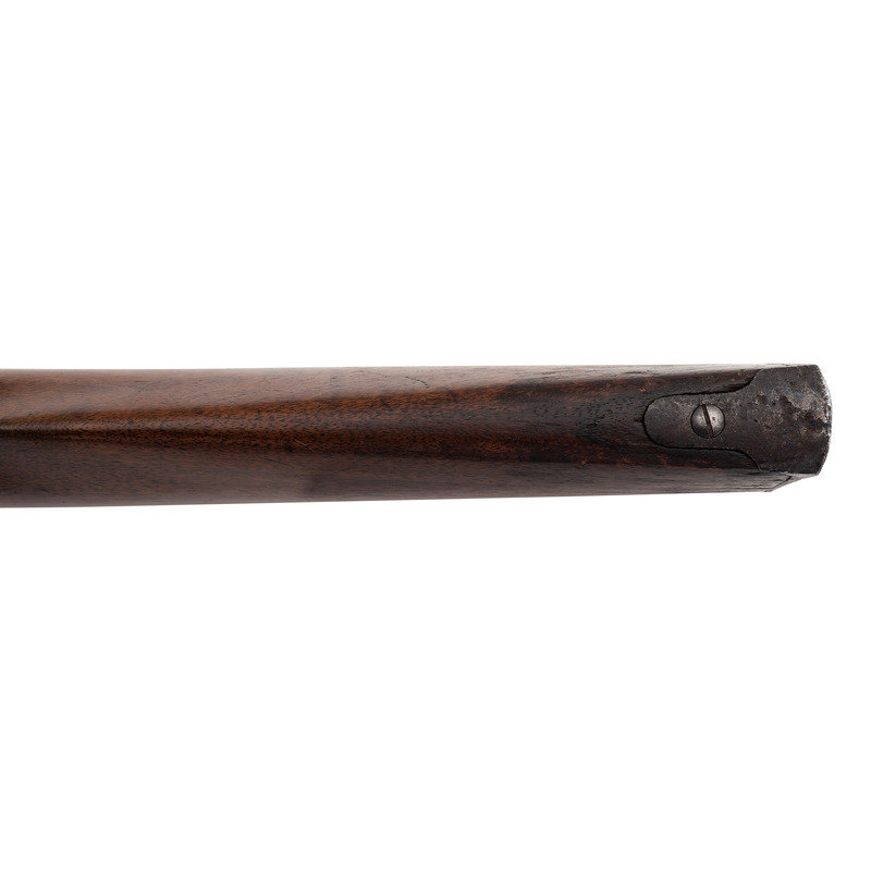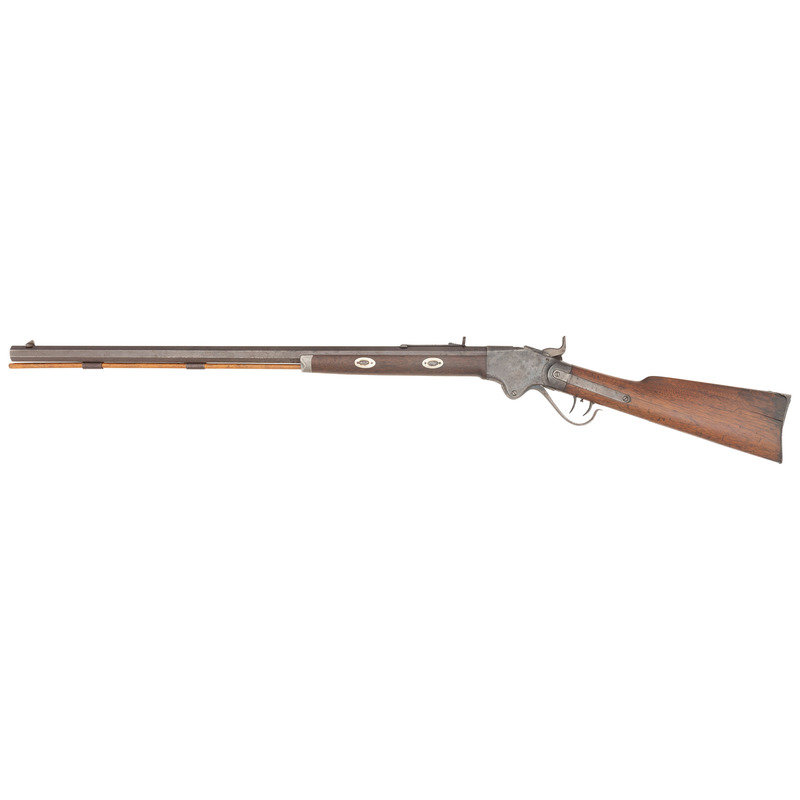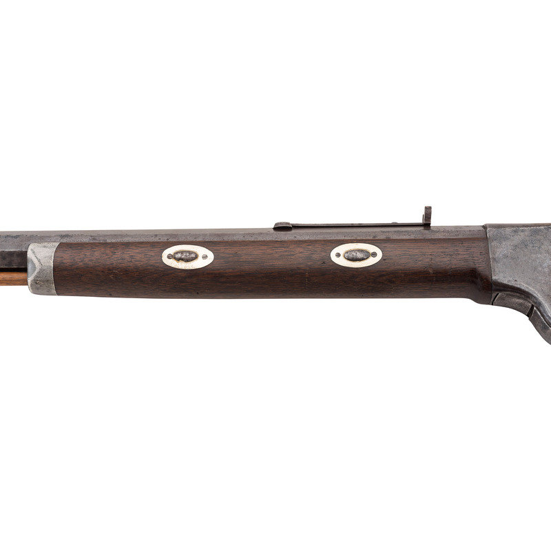 .45 caliber (cartridge unknown). 31.25" double keyed heavy octagonal barrel. SN: 96492. Browned and color casehardened finish, German silver, pewter and iron mountings, smooth walnut stock and forend. Standard 3-line Spencer markings on top of receiver. Heavy barrel measures 1" across the flats at muzzle and is marked "W.H. SOPER/RIFLE/MAKER". Spencer magazine cut off on top of action, elevation adjustable buckhorn rear sight, dovetailed blade front sight, double barrel wedges secure the Hawken style forend with German silver escutcheons and pewter nose cap. Sling bar and ring removed, with mounting plate in place. Model 1865 magazine follower tube with grooved base plate. William H Soper (1814-1888) worked as a gunmaker in London, Ontario (Canada) from circa 1858-1875 before moving to California and working in San Francisco, San Luis Obispo and Eureka. He worked for Liddle & Reading in San Francisco circa 1876 before working on his own and in a partnership with George Remington in San Luis Obispo circa 1879-1882. While Soper's conventional plains rifles are occasionally found for sale, a "Hawken-style" Spencer action Plains Rifle is a real rarity.