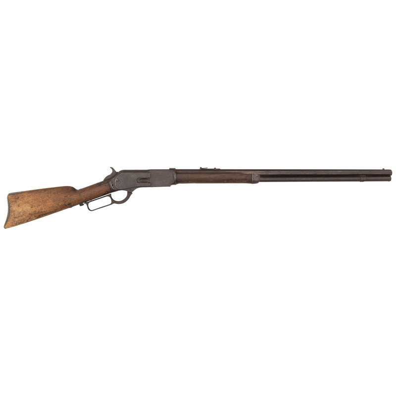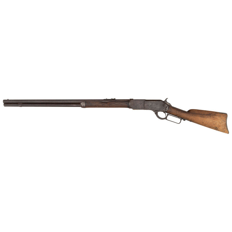 .45-60. 28" octagonal barrel with full-length magazine. SN: 16987. Manufactured in 1881. Blued and color casehardened finish, smooth straight-gripped walnut stock with old replacement lead buttplate, smooth forend. Two line barrel address reads "WINCHESTER'S-REPEATING-ARMS. NEW HAVEN, CT/KING'S-IMPROVEMENT-PATENTED MARCH 29, 1866 OCTOBER 16, 1860". Folding ladder rear sight with broken ladder, dovetailed blade front sight may be a very old replacement. Stock dry with a few old, empty tack holes and crudely cast lead cresent buttplate. Reverse of forend with some empty tack holes as well and stylized lighting bolt carved into it. Mr. Ness' tag say that this rifle was collected on the Standing Rock Hunkpapa Sioux reservation.