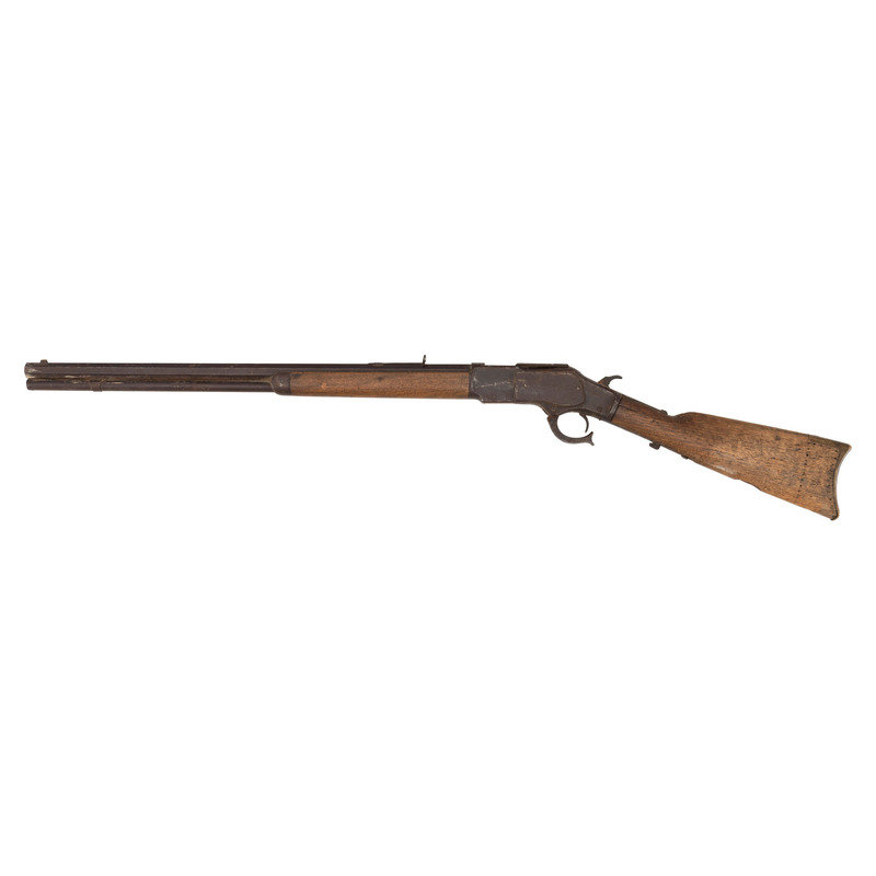 .44-40. 24" octagonal barrel with full-length magazine. SN: not legible. Blued finish, smooth straight-gripped walnut stock and forend. Markings essentially illegible on barrel and tang due to wear, no visible serial number. Butt replaced with one from a Winchester 1866 with brass crescent buttplate and with wood showing some 50 empty tack holes with a few broken brass shanks remaining. Buttstock missing the original sling swivel and the trapdoor in the buttplate. Buckhorn rear sight a replacement, dovetailed blade front sight. Lever loop broken, firing mechanism not functional, rifle in about relic condition. Mr. Ness' tag notes that this rifle was found in the "Sand Hills" of Saskatchewan, Canada along with a Northwest Trade Gun. Many of Hunkpapa Sioux under Sitting Bull as well as other Sioux and Cheyenne took refuge in Canada in the aftermath of the Battle of the Little Bighorn, in an attempt to avoid US military reprisals. It seems quite possible that this hard used and period composite Winchester was utilized by one of those Native Americans either at the battle or in the period immediately after it. An honest and real "Indian Gun" from the period.
