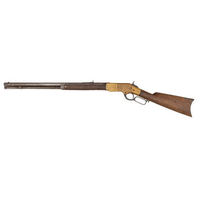 .44 Henry. 24" octagonal barrel with full-length magazine. SN: 152560. Manufactured circa 1880. Blued finish, color casehardened lever and hammer, brass receiver, smooth walnut straight gripped stock with crescent steel buttplate, smooth walnut forend with steel forend cap. Two line barrel address reads "WINCHESTER'S-REPEATING ARMS NEW HAVEN CT./KING'S-IMPROVEMENT-PATENTED-MARCH 29, 1866. OCTOBER 16, 1860". Italics serial number on triggerguard tang. Buckhorn rear sight is an incorrect replacement, dovetailed German silver front sight blade on steel base. Stock with numerous old square shank tack holes around the periphery of the buttplate, two brass tacks still present in forend, behind steel cap. Butt trap void of cleaning rods. A well worn and salty example of an apparently real frontier and potentially Native American used "Yellow Boy".