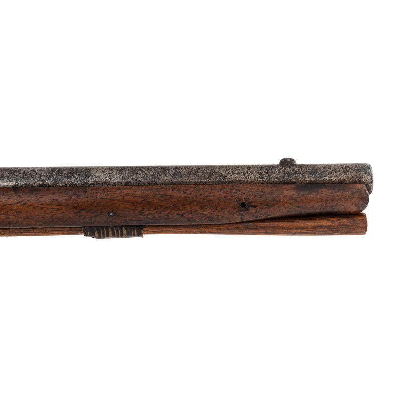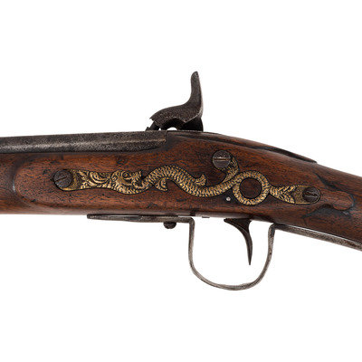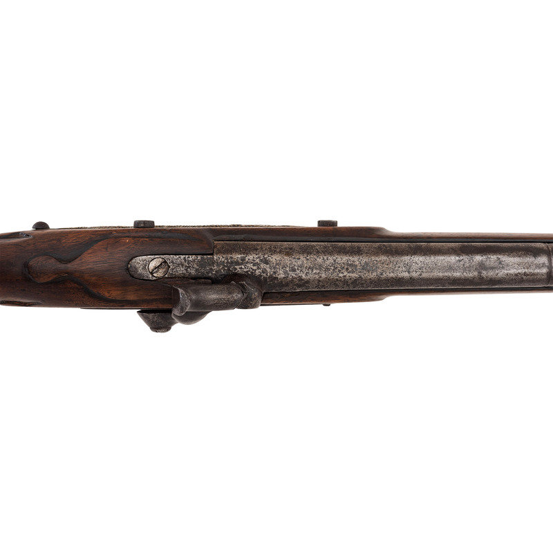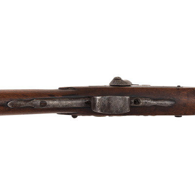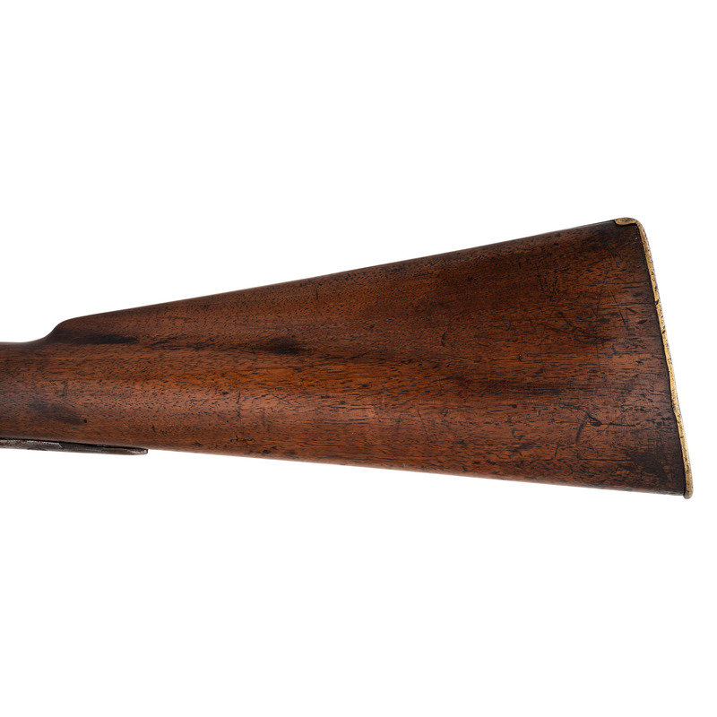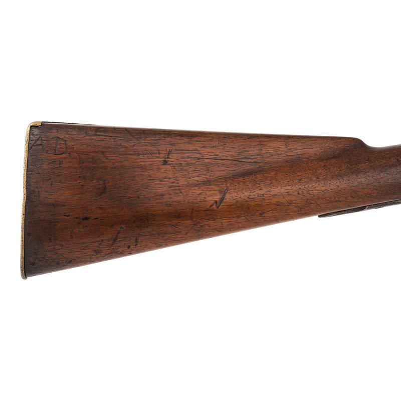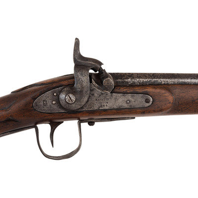 .56 caliber. 36" three-stage octagon to round barrel. SN: NSN. Bright finish, brass and iron furniture, full-length walnut stock. Enfield style percussion lock marked "BARNETT/LONDON/1884" in three lines forward of the hammer and with the Hudson Bay Company's "{Tombstone Fox/EB}" trademark at the tail. Brass dragon motif 3-screw serpent side plate, flat brass 5-screw buttplate, oversized iron triggerguard, corrugated brass ramrod pipes secure an old wood ramrod. Stock with simple raised carved aprons around the tang, at the tail of the lock and at the tail of the counterpane. The initials "A.D." are weakly carved into the upper obverse corner of the butt. A solid example of a late production Barnett trade gun from the last days of freedom for Native American people on the Great Plains.