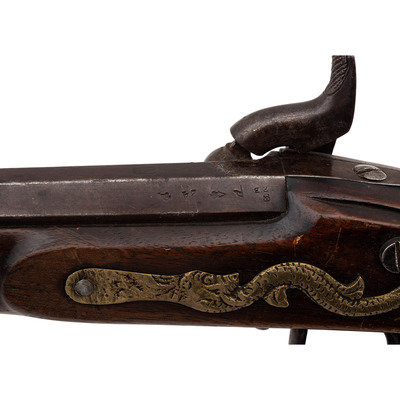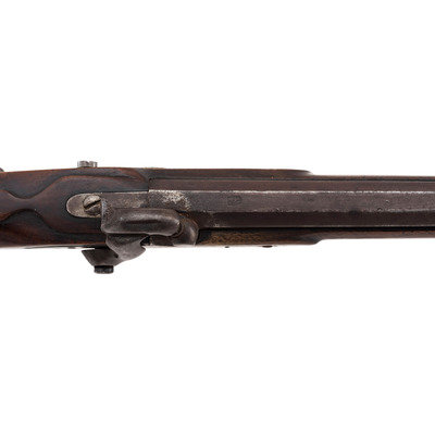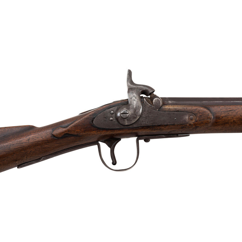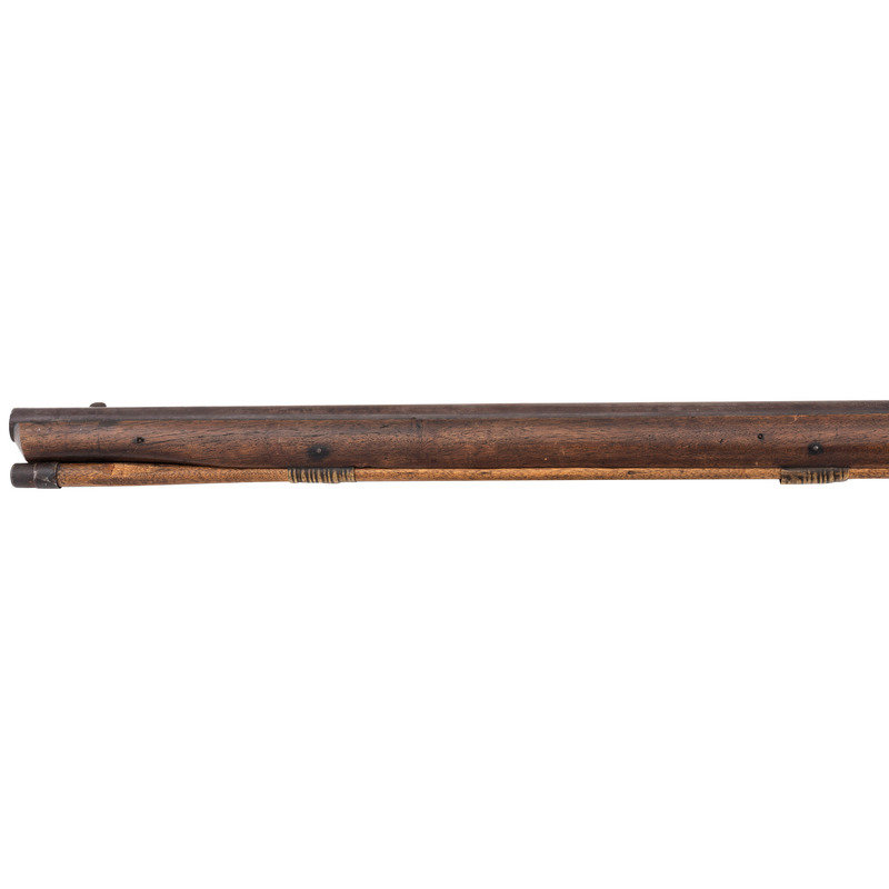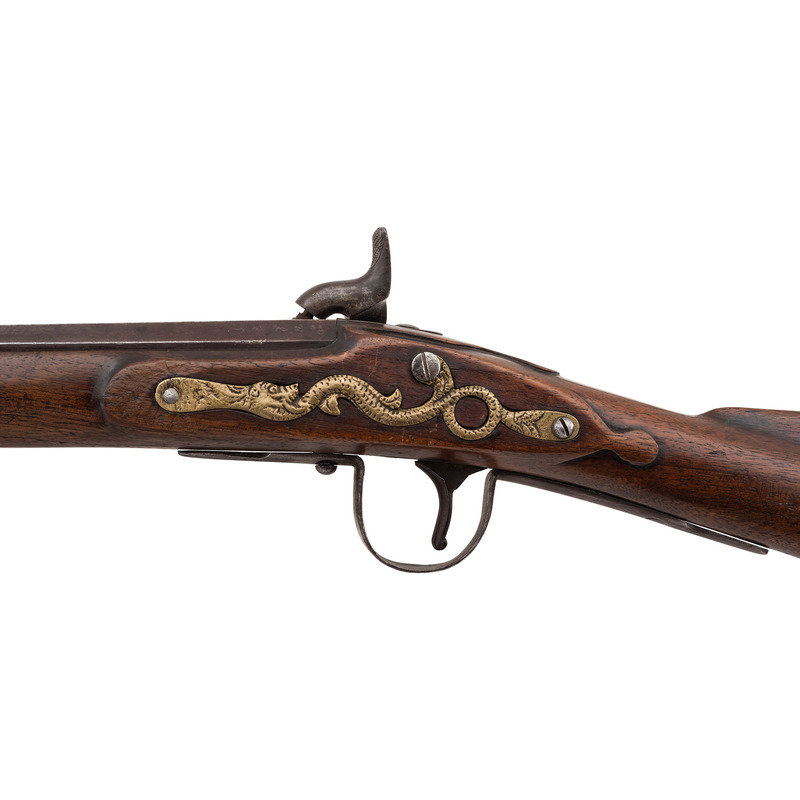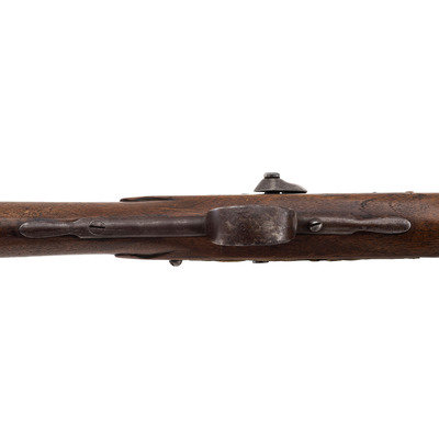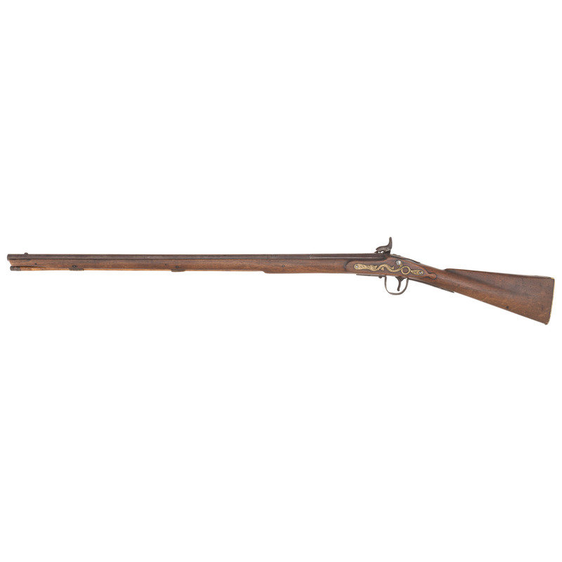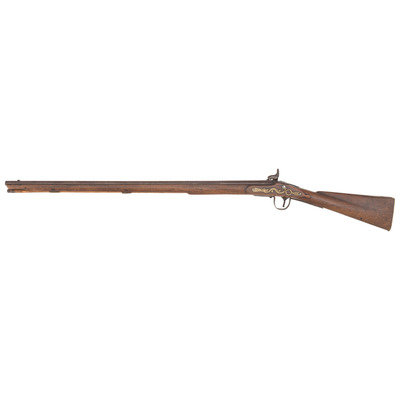 .58 caliber. 36" three-stage pinned octagon to round barrel. SN: NSN. Lightly oxidized metal, brass and iron furniture, full-length walnut stock. Percussion lock marked with the "{Tombstone-Fox/EB}" Hudson's Bay Company trademark at the tail and in three lines forward of the hammer "BARNETT/LONDON/1887". Barrel with London commercial proof marks and a "24" gauge mark, indicating .58 caliber. Three-screw brass serpent side plate, oversized iron triggerguard, flat brass buttplate, raised carved aprons at tang and rear of lock mortise and rear of counterpane. Corrugated brass thimbles retain an old brass tipped wood ramrod. A nice example of a late production trade gun from the closing days of the "old west" period.