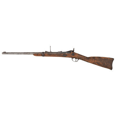 .45-70. 22" barrel length. SN: 15509. Blued and color casehardened finish, smooth walnut short-comb, long-wrist stock. Lock marked weakly with the "{US SPREAD-WINGED EAGLE}" and in three lines "US/SPRINGFIELD/1873". Trapdoor marked "MODEL/1873/{EAGLE HEAD}/{CROSSED ARROWS}/US". Serial number at rear of receiver. No barrel proofs as is correct. No visible inspection marks in wood due to wear. Narrow receiver, two-click tumbler, high-arch breech, spring-loaded steel firing pin, coarse checkered hammer without lip, smooth trigger, two-piece triggerguard, barrel band without stacking swivel. 1873 pattern rear sight numbered 1 to 5 on the side walls and 6 to 12 on the ladder, sight blade in original steel base is an old, period of use replacement. Correct solid buttplate marked "US" without implement hole in stock. Carbine has none of the 1877 upgrades and remains in its original “Custer Era” configuration. Sling bar cut from mounts, typical of Native used guns.