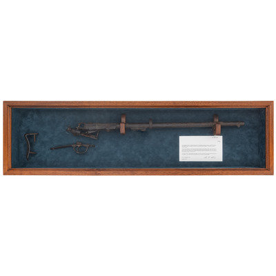 .45-70. 22" barrel length. SN: 21783. Heavily oxidized metal exposed to the elements, potentially after a fire with no stock present. Lock marked with the "{US SPREAD-WINGED EAGLE}" and in three lines "U.S./SPRINGFIELD/1873". Trapdoor marked "MODEL/1873/{EAGLE HEAD}/{CROSSED ARROWS}/US". Serial number at rear of receiver. No barrel proofs as is correct, with no visible sub-inspection marks as gun could not be removed from the display case to examine it more closely. 1873 pattern rear sight, musket style front sight. Relic components include the complete barreled action with barrel band, complete lock, lock screws and sling bar, triggerguard with trigger and solid buttplate. The carbine is accompanied by a notarized letter starting that the grandfather of the letter's writer, one Elisha L. Olmstead (1876-1942) found the gun in the Black Hills, a region he was familiar with due to living much of his life in Rapid City, SD and a region in which he trapped and hunted. The letter further notes that the gun had been through a forest fire. The 21,000 range of Springfield Model 1873 Trapdoor Carbine serial numbers is a prime range for 7th Cavalry and Custer related guns. A search of the rather limited numbers available in the Springfield Research Service four volumes of serial number books reveals the following guns in close proximity to #21783. #21685 & #21841 were both turned in as damaged by H troop of the 7th Cavalry on June 25, 1876 the date of the Battle of the Little Bighorn. Carbine #21725 was turned in by the native Left Handed Bear on September 5, 1876 indicating it was almost certainly a Custer captured gun. Additionally carbines #21811 and #21880 were both turned in at Tongue River by natives on April 25, 1877 and April 8, 1879 respectively. Given the proximity of these guns to this one and notarized letter it seems quite likely that this is what remains of a Model 1873 carbine that was captured at The Little Bighorn.
