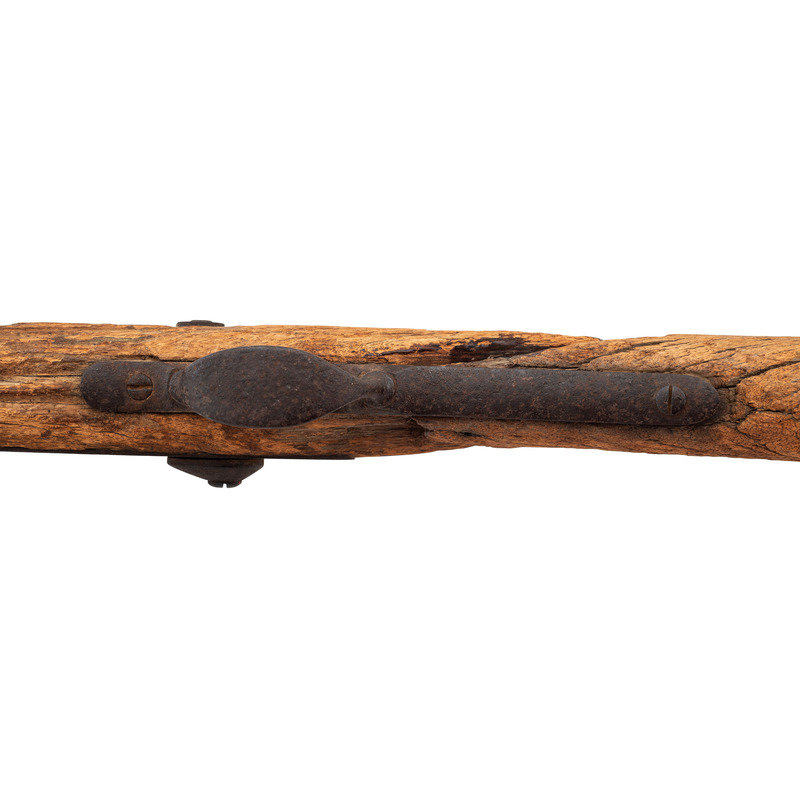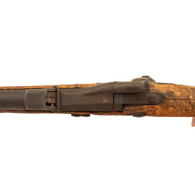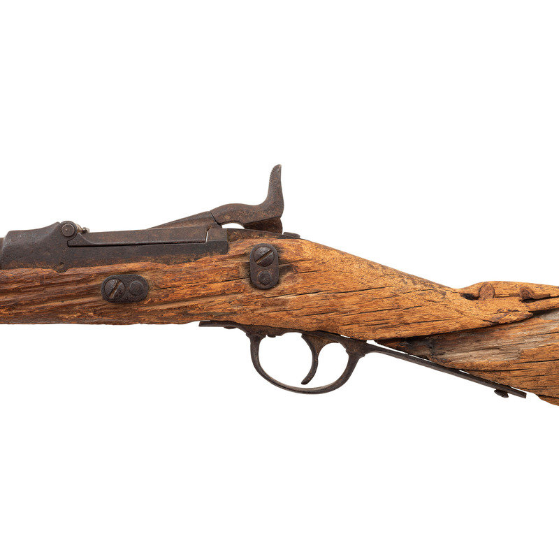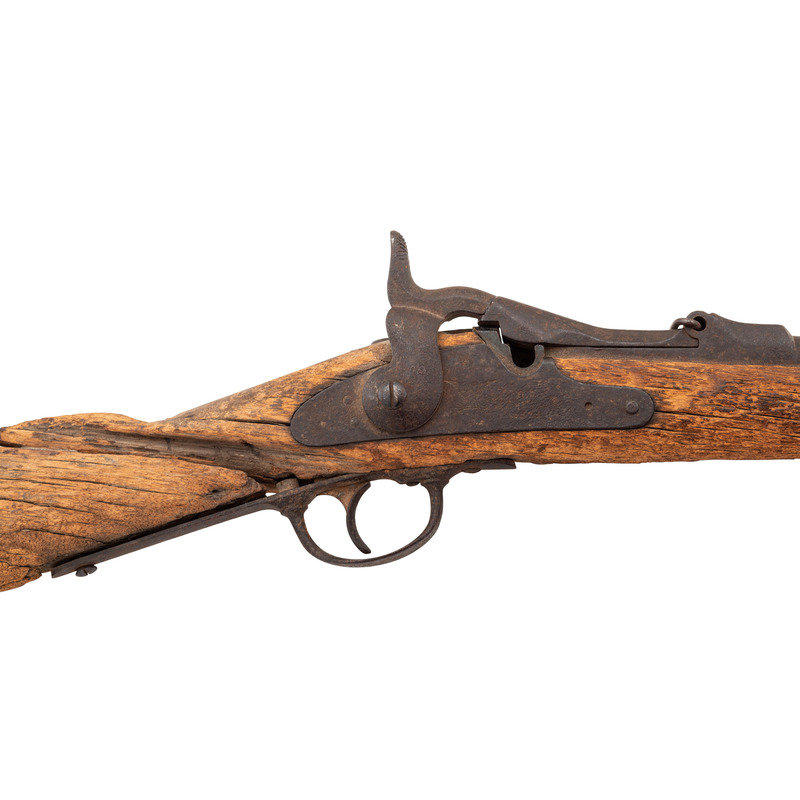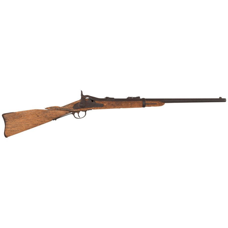 .45-70, 22" barrel, S/N 17994 (mfg. ca1874). Heavily oxidized relic condition metal with relic condition wood. Many of the parts are missing and essentially no markings are visible. Serial number is still present on rear of receiver and the {Crossed Arrows} are still present on the high arch breech block, which is secured to the receiver with an old nail. Other salient features are the correct single barrel band without stacking swivel, sling bar mounts with sling bar cut away, two click tumbler, two-piece triggergaurd with smooth trigger, solid buttplate, 1873 pattern rear sight, one-piece front sight base and blade and no proofs on the barrel. The stock appears to be as shortened early production short comb/long wrist rifle stock with an apparent ramrod channel present in the forend tip, suggesting that metal for this gun was moved to this stock during the period of use, before the gun was discarded due to an apparent broken wrist. The condition of the metal suggests long term exposure to the elements with the wood condition suggesting the gun was quite wet for at least some period of time, possibly in a ditch or wadi that filled with water from time to time. The overall appearance of the gun is that of an absolutely authentic early production Model 1873 Carbine that was restocked in a shortened Model 1873 rifle stock during the period of use. The serial number is very close to a number of 7th Cavalry issued carbines as well as a number of carbines turned in or captured from the Native Americans. A review of the relatively incomplete Springfield Research Service serial number records reveal that M1873 Carbine #17940 was "captured from Indians" on October 1, 1879, as were carbines #17483, #18137, 18141 and 18202, all presumed to have been 7th Cavalry guns. Carbines #17497, #17781 and #18006 were issued to the 7th Cavalry and #17895, #18232 and #18714 are in the Springfield Armory Museum and believed to have been Custer guns. #17914 was a Model 1873 Carbine surrendered by Crow King's band of Indians on 24 February 1881 as were carbines #17675 and #18489. However, #17986 is listed as an 1873 Rifle in the Smithsonian's collection and #17814 is also a rifle. Based upon serial number is seems almost certain that this receiver was from an 1873 carbine and barrel appears to be a correct carbine barrel measuring .725" in diameter at the muzzle, with correct carbine furniture that was at some point very long ago placed in a shortened rifle stock, almost certainly done by an armorer at a western post in the field. This is a great looking Custer range relic that will look wonderful in your Indian Wars display.