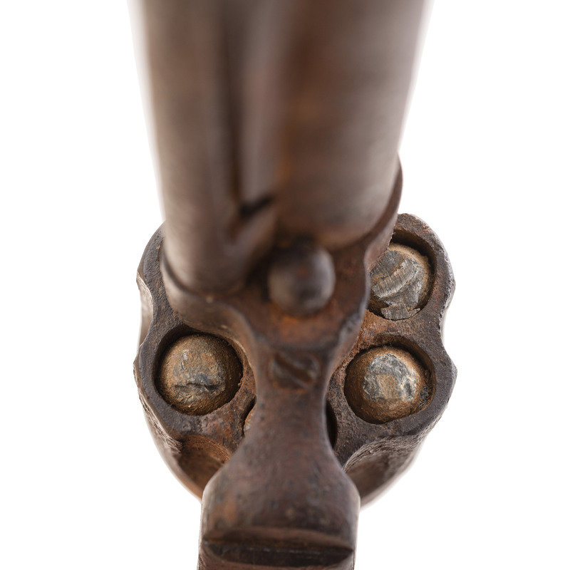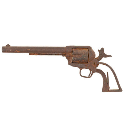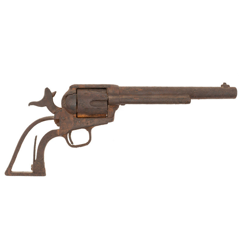 .45 Colt. 7.5" barrel. SN: 5387. Manufactured in 1874. Relic condition with no finish, no grips and frozen action. No visible barrel address, weak serial numbers appear to match on frame and triggerguard, with no visible numbers on butt or cylinder. Ejector housing could not be removed for inspection of barrel due to relic condition. Frame with still legible, correct style two-date in two-line patent information and small "U.S." marking. Revolver appears to be in its original, "as issued" configuration, with the exception of a period modified front sight that includes a small copper blade. Revolver's action is frozen, chambers are fully loaded and the mainspring is broken. There are a significant number of pry and tool marks on the frame near the loading gate, as if someone had used a knife to try to pry the gate open. Possibly when the mainspring broke the user was hoping to retrieve the cartridges from the cylinder chambers and since the hammer was cocked, the loading gate would not open. This is pure conjecture, but the obvious damage makes it clear why the revolver was discarded to be found at some point in time many years later. According to research published by Kopec & Fenn, this revolver's serial number falls in the range of Lot Five that was delivered to the U.S. military with guns numbered from #4500 to #5504. According to their research, 600 of those guns were issued to Custer's 7th Cavalry, slightly more than half of the total delivery. Mr. Ness' notes regarding the gun additionally mention that he feels the gun is associated with Troop M which was under Marcus Reno's command at the Battle of the Little Bighorn. He references Single Action #5337 which is in the range of Reno issued Model 1873 revolvers, and further notes indicate that at least 6 guns in the 5100 range have direct Little Bighorn association. Very few 7th Cavalry single action serial numbers are found in the Springfield Research Service serial number books, but they do list #5637 as having been lost by the 7th in November of 1875. Other guns close to this one listed in the books included #5360 issued to G troop of the 3rd Cavalry and #5542 which was stolen by a deserter from H troop of the 2nd Cavalry on April 5, 1878. A really interesting, untouched relic condition Colt single action in a prime serial number range to have seen use at the Little Bighorn, which was clearly discarded for a catastrophic failure in the heat of battle.