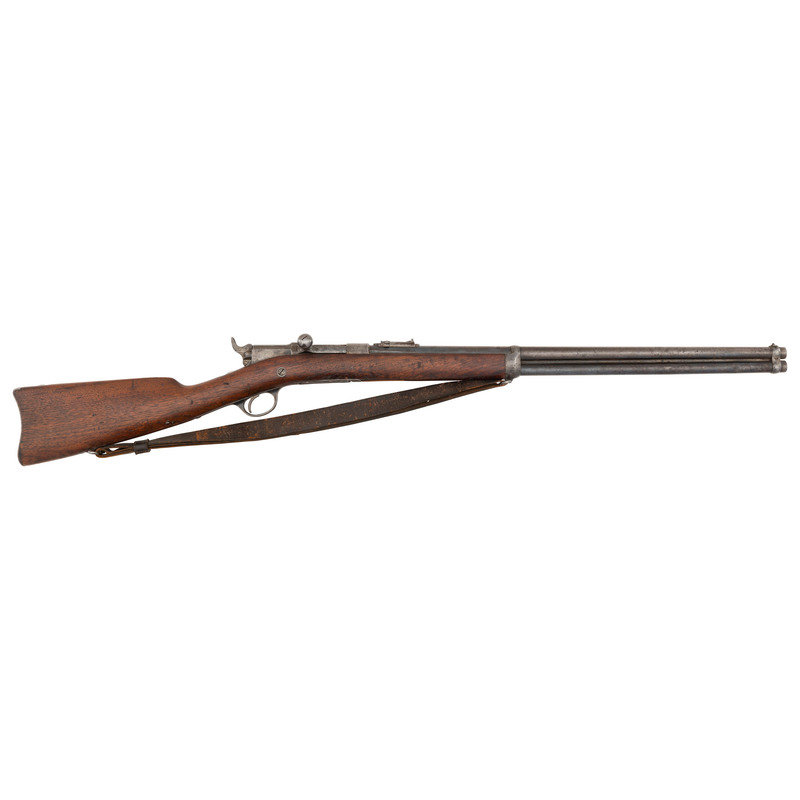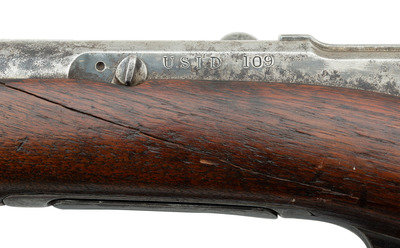 .45-70. 24" round barrel with full length tubular magazine under barrel. SN: 109. Manufactured in 1880. Blued finish, smooth walnut stock and forend, carbine butt. Bolt action, tubular feed repeating rifle with exposed hammer. Adjustable ladder rear sight, front sight blade on carbine style barrel band. Standard three-line Remington address and patent markings on top rear of bolt. Top of chamber marked with an "{ARROW}" motif indicating Indian Police along with "WWK/P" inspection. William W Kimball was a civilian armory employee who primarily inspected U.S. Navy contract arms for the government during this period, including the Navy Rifle version of the Remington-Keene, Remington Model 1879 Navy Rifles and Hotchkiss 2nd Model Navy Rifles. The left barrel flat and receiver are also marked with the sub-inspection "HN" mark of Henry Nettleton, whose script cartouche was also applied to the wrists of these guns, although it is often worn away as it is on this one. Left side of receiver correctly marked in individual dies "U.S.I.D. 109", for "U.S. Interior Department" and gun #109. The U.S. Interior Department administered the Bureau of Indian Affairs during this period, which controlled all aspects of Native American life, particularly on reservation land. In 1878 the Bureau of Indian Affairs established the Tribal Police to enforce the law on reservation land, hoping for better results than those obtained by using the military to enforce the law, as the army often operated as oppressors rather than lawmen. In 1880 the U.S. Department of the Interior contracted with Remington Arms to deliver 650 Model 1875 Revolvers and 600 Remington-Keene Frontier Rifles in .45-70 for the use of the Tribal Police. These are extremely rare firearms in their own right, but due to the fact that they saw heavy use, often in harsh conditions, their survival rate is rather low and extant examples tend to be well-worn and heavily used. Includes a leather Pattern 1887 leather sling for use on a Trapdoor or Krag rifle.
