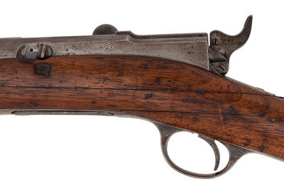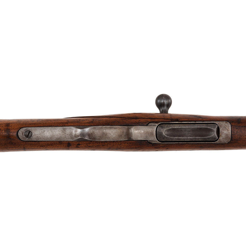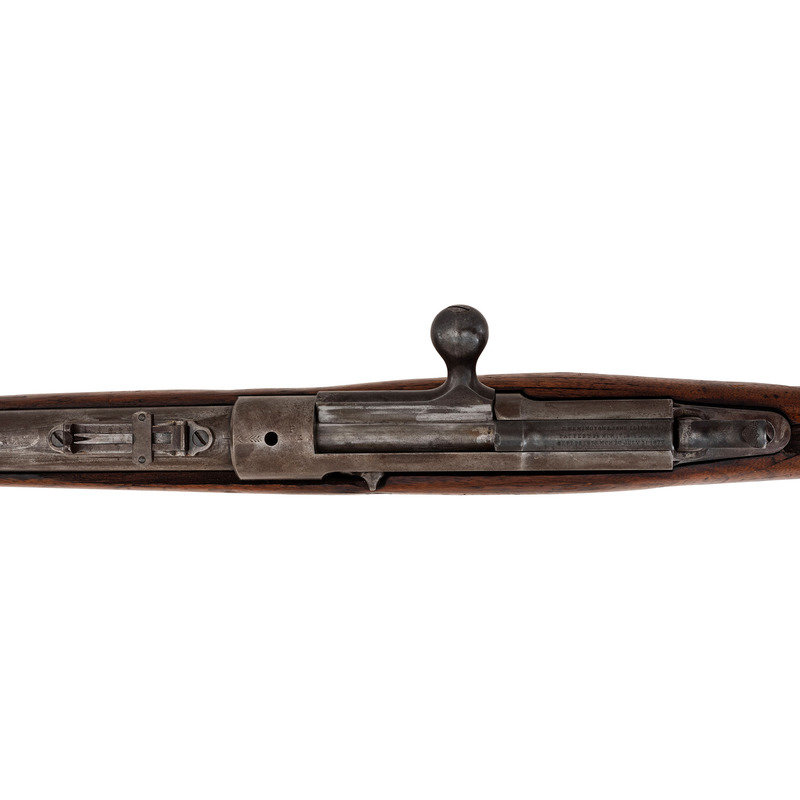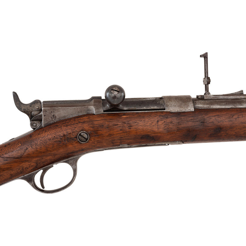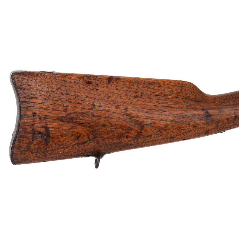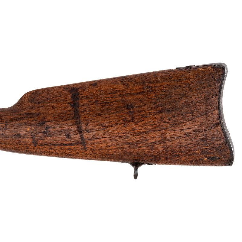 .45-70. 24" round barrel with full length tubular magazine under barrel. SN: 287. Manufactured circa 1880. Blued finish, smooth walnut stock and forend, carbine butt. Bolt action, tubular feed repeating rifle with exposed hammer. Adjustable ladder rear sight, front sight blade on carbine style barrel band. Standard three-line Remington address and patent markings on top rear of bolt. Top of chamber marked with an "{ARROW}" motif indicating Indian Police along with "WWK/P" inspection. William W Kimball was a civilian armory employee who primarily inspected US Navy contract arms for the government during this period, including the Navy Rifle version of the Remington-Keene, Remington Model 1879 Navy Rifles and Hotchkiss 2nd Model Navy Rifles. The left barrel flat and receiver are also marked with the sub-inspection "HN" mark of Henry Nettleton, whose script cartouche was also applied to the wrists of these guns, although it is often worn away as it is on this one. Left side of receiver correctly marked in individual dies "U.S.I.D. 287", for "US Interior Department" and gun #287. The US Interior Department administered the Bureau of Indian Affairs during this period, which controlled all aspects of Native American life, particularly on reservation land. In 1878 the Bureau of Indian Affairs established the Tribal Police to enforce the law on reservation land, hoping for better results than those obtained by using the military to enforce the law, as the army often operated as oppressors rather than lawmen. In 1880 the US Department of the Interior contracted with Remington Arms to deliver 650 Model 1875 Revolvers and 600 Remington-Keene Frontier Rifles in .45-70 for the use of the Tribal Police. These are extremely rare firearms in their own right, but due to the fact that they saw heavy use, often in harsh conditions, their survival rate is rather low and extant examples tend to be well-worn and heavily used. A note on the collector's tag for this gun says "Rosebud", suggesting the gun was associated with that reservation, but no file was present to provide provenance for this particular gun.