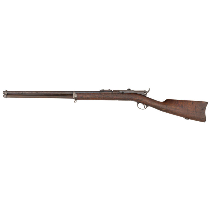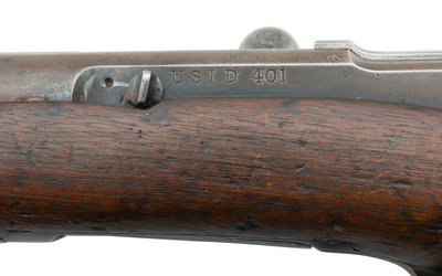 .45-70. 24" round barrel with full length tubular magazine under barrel. SN: 401. Manufactured in 1880. Blued finish, smooth walnut stock and forend, carbine butt. Bolt action, tubular feed repeating rifle with exposed hammer. Adjustable ladder rear sight, front sight blade on carbine style barrel band. Standard three-line Remington address and patent markings on top rear of bolt. Top of chamber marked with an "{ARROW}" motif indicating Indian Police along with "WWK/P" inspection. William W Kimball was a civilian armory employee who primarily inspected U.S. Navy contract arms for the government during this period, including the Navy Rifle version of the Remington-Keene, Remington Model 1879 Navy Rifles and Hotchkiss 2nd Model Navy Rifles. The left barrel flat and receiver are also marked with the sub-inspection "HN" mark of Henry Nettleton, whose script cartouche was also applied to the wrists of these guns, although it is often worn away. It is visible on this gun but weak. Left side of receiver correctly marked in individual dies "U.S.I.D. 401", for "U.S. Interior Department" and gun #401. The U.S. Interior Department administered the Bureau of Indian Affairs during this period, which controlled all aspects of Native American life, particularly on reservation land. In 1878 the Bureau of Indian Affairs established the Tribal Police to enforce the law on reservation land, hoping for better results than those obtained by using the military to enforce the law, as the army often operated as oppressors rather than lawmen. In 1880 the U.S. Department of the Interior contracted with Remington Arms to deliver 650 Model 1875 Revolvers and 600 Remington-Keene Frontier Rifles in .45-70 for the use of the Tribal Police. These are extremely rare firearms in their own right, but due to the fact that they saw heavy use, often in harsh conditions, their survival rate is rather low and extant examples tend to be well-worn and heavily used.