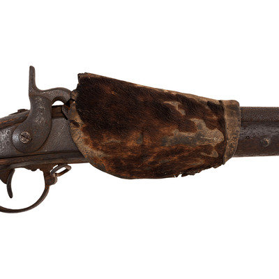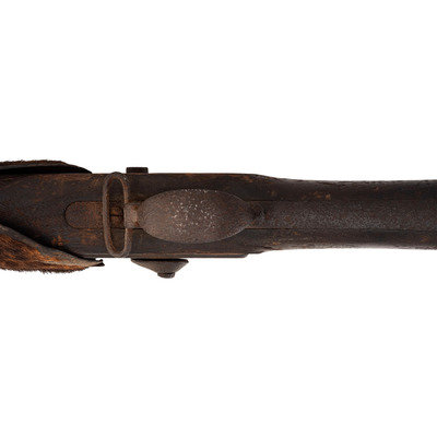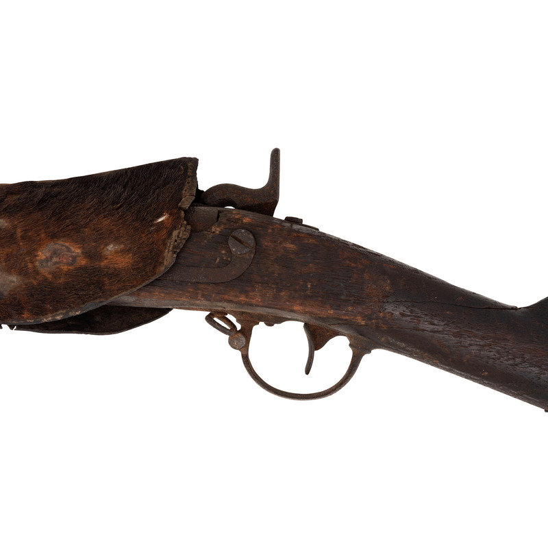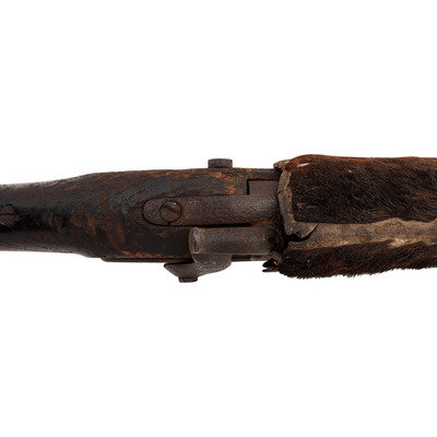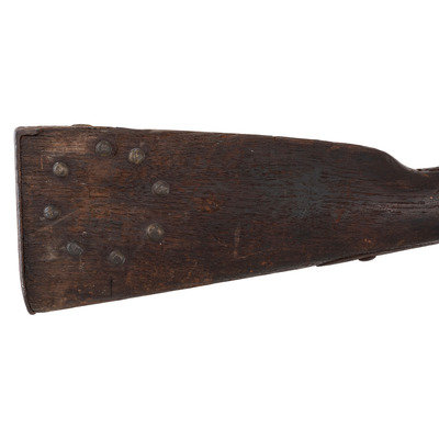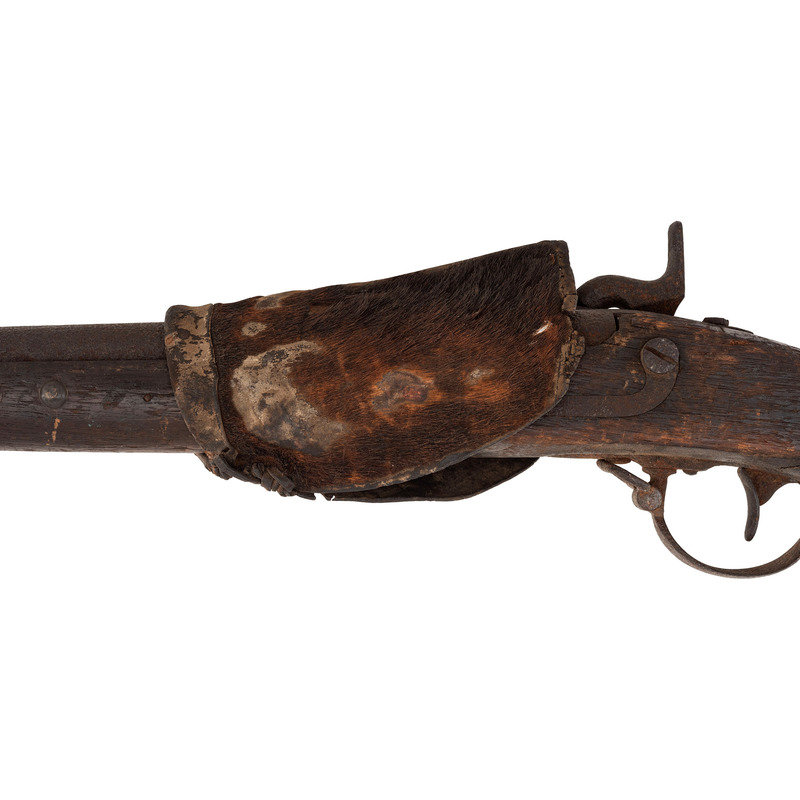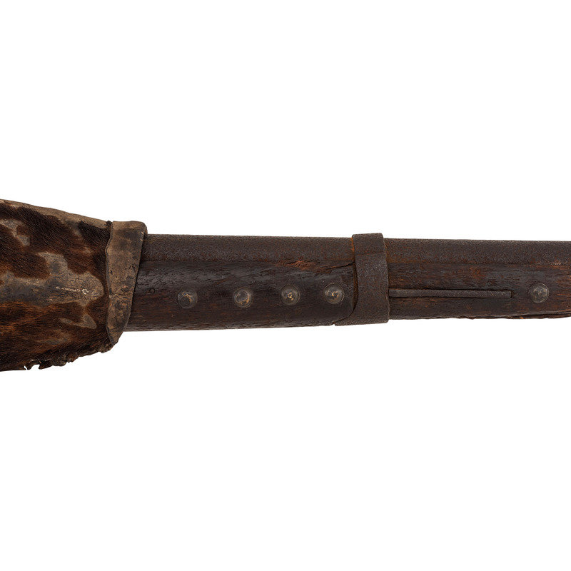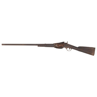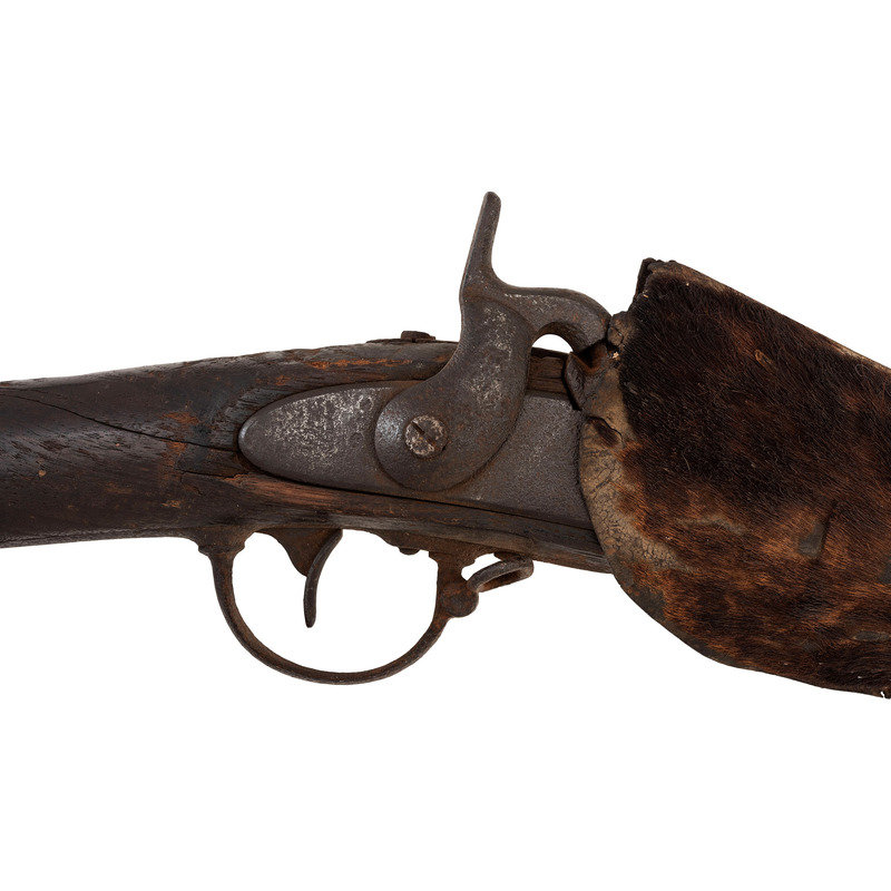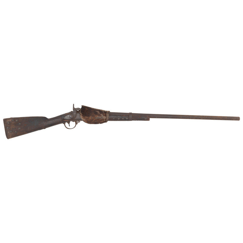 .69 caliber. 34.5" barrel length. SN: NSN. Relic condition metal, iron mountings, walnut stock. Altered from full-length 42" barrel to 34.5", stock forend shortened to half-stock configuration roughly 3.5" in front of the rear barrel band, which is installed backwards. Lock markings mostly obscured by pitting but the three line marking at the tail can just barely be discerned reading "SPRING/FIELD/1847". Musket decorated with numerous brass tacks in the obverse butt and forend. Obverse butt is rack numbered "2/16". An animal hide lock cover with some of the hair still present, has been fashioned that surrounds the lock to protect it from the elements, which can slide forward to operate the lock. Mr. Ness' notes indicate that this musket was one of the guns collected in the aftermath of the Wounded Knee Massacre on December 29, 1890. Many of those collected guns became part of the Rock Island Arsenal collection. In the auction catalog from Historical Collectible Auctions, where this gun was purchased in September of 2000, the description identifies the gun as having been surrendered at Wounded Knee by Good Lance with an accompanying tag that identified the gun as having been his property. However, that tag appears to be missing, although the auction catalog clearly pictures this gun. Eight of the Wounded Knee guns from the Rock Island Arsenal collection were deaccessioned to Professor James W Ellis on May 18, 1897. Copies of the various correspondence and notes relating to their release are included with the gun along with a copy of the auction catalog and documents related to other Wounded Knee provenance guns collected from and released by the Rock Island Arsenal.