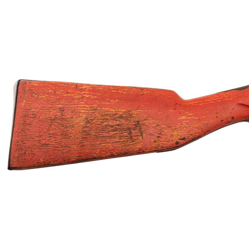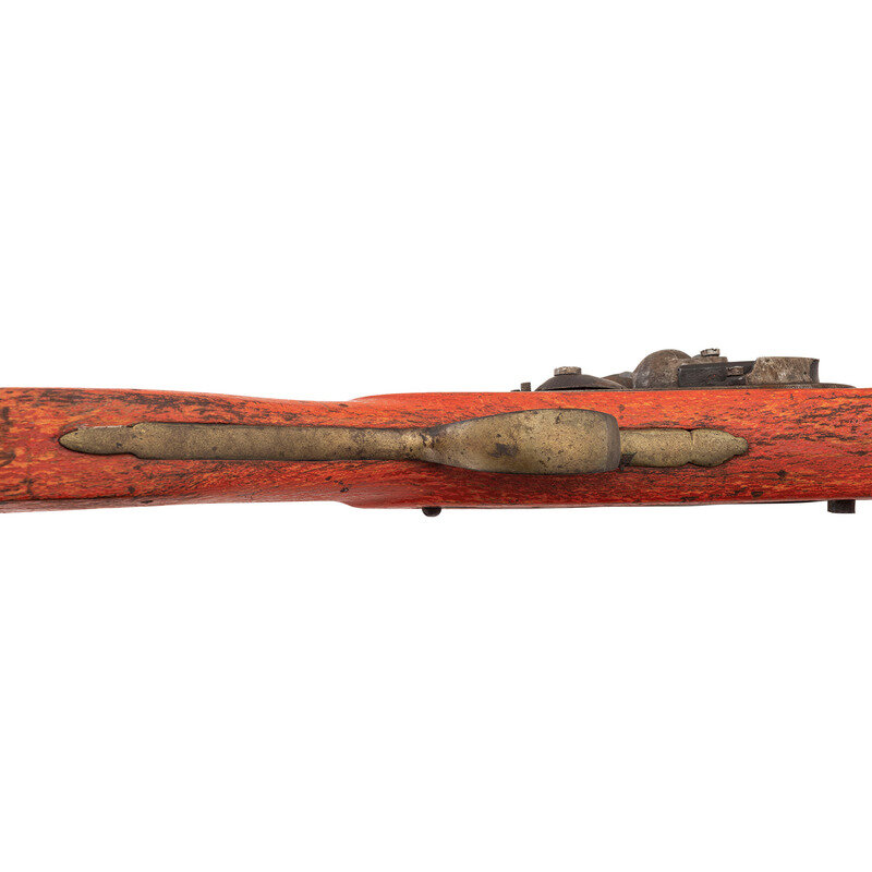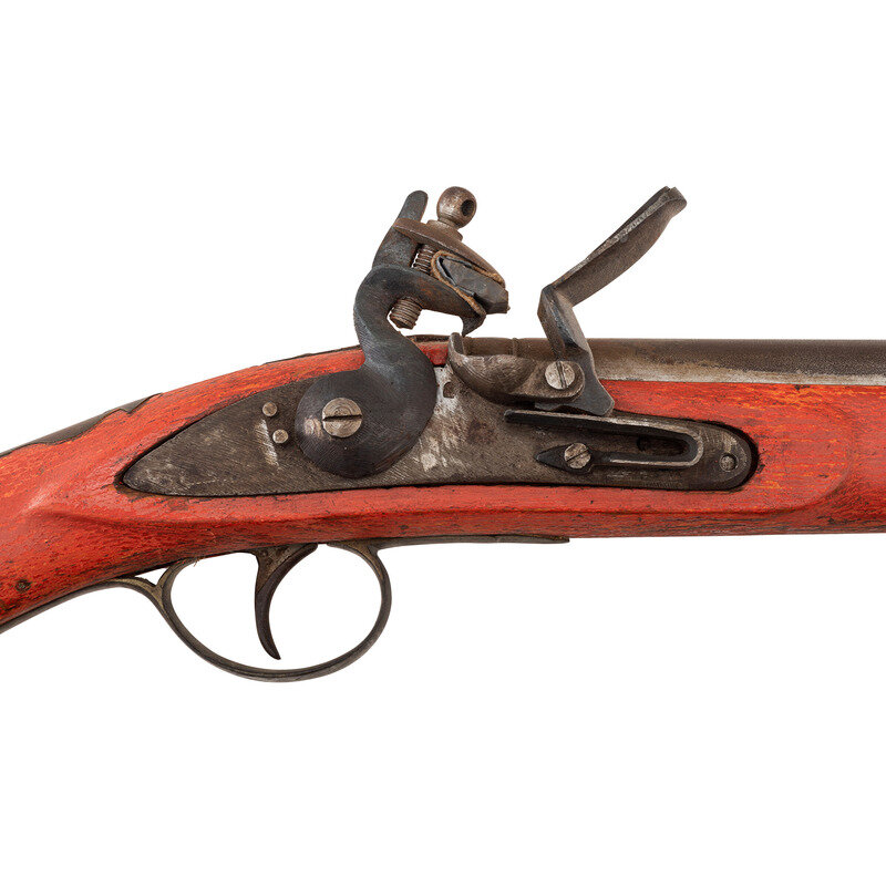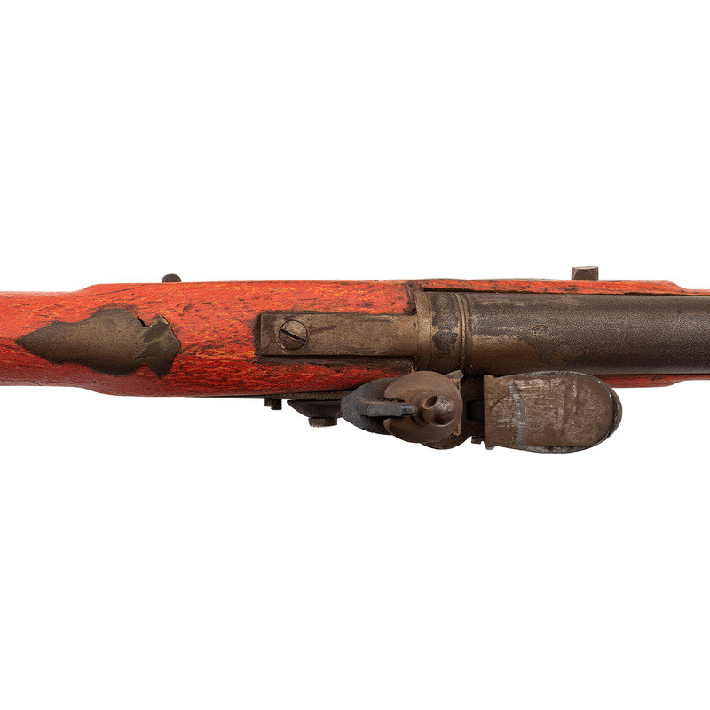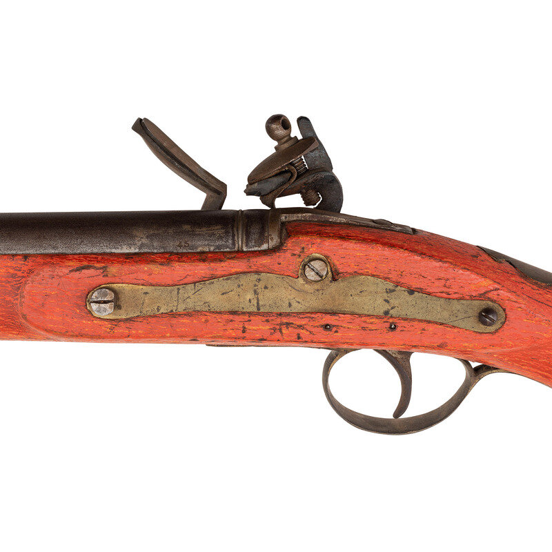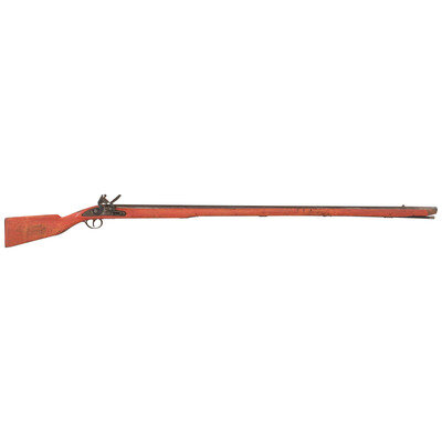 .72 caliber. 51.5" pinned round barrel with baluster turned rings at the breech. SN: NSN. Bright finish, brass furniture, hardwood stock with applied red paint. Unmarked except for a Liege "E/LG/*" in an oval proof on the barrel, the number "45" and initials "GC" at the left breech and a deep, indistinguishable touch mark on the lock under the pan. Crudely executed flint lock appears to be in original flint configuration. The massive trade gun is 87.25" in overall length and is a cheap, highly stylized gun that harkens back to the form of the Brown Bess with the similarly shaped lock, shield shaped thumb piece at the wrist and the baluster turned rings at the breech. Simple brass trade gun furniture includes a flat sideuplate, flat buttplate, simple flat triggerguard with rudimentary finials at its ends and two round ramrod thimbles and an entry pipe that also resemble India Pattern Brown Bess furniture. The overly heavy stock has an exaggerated perch belly profile with that makes the 1.5" wide butt look more like a paddle than a gun butt, reminiscent of some Dutch muskets from the 1600s. The strong resemblance to the India Pattern Bess in the furniture and features suggests the gun was destined for trade in an area where English traders would have been common 100 or more years earlier. While guns of this style are most often associated with the African trade of the late 19th and early 20th century, the consignor notes that trade guns painted red in a similar fashion have been noted in the camps of Alaskan Natives. An interesting, late production trade gun.