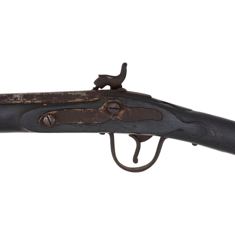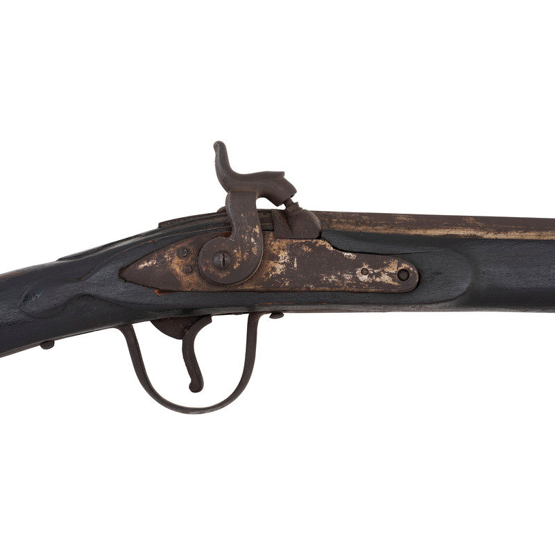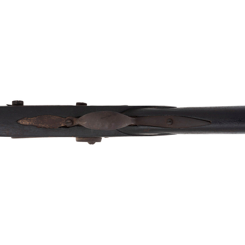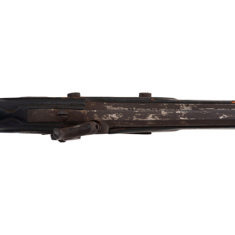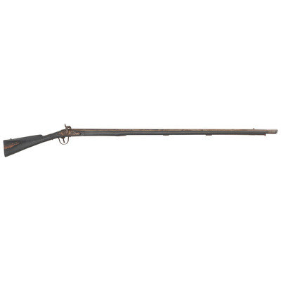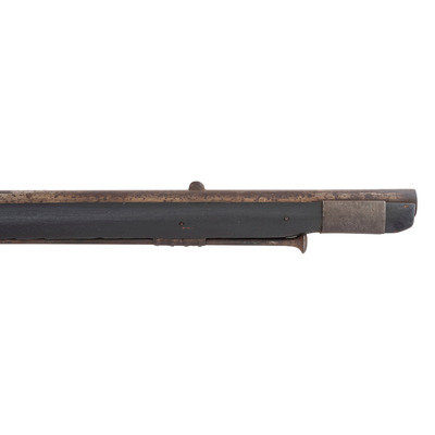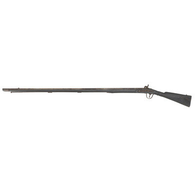 .60 caliber. 51" pinned two-stage octagon to round barrel. SN: NSN. Bright finish, iron furniture, full-length hardwood stock. Unmarked percussion lock, top barrel flat marked with an oval "E/LG/*" Liege proof mark and numbered "105". Additional Belgian proofs are present near the bolster. Simple iron furniture includes a flat two-screw side plate, oversized triggergaurd, plain buttplate, nose cap and corrugated ramrod pipes which secure an iron button head ramrod. Stock with rudimentary raised, carved aprons around the tang and at the tails of both the lock and counterpane. While these long barreled, simple percussion trade guns saw use around the world from the latter part of the 19th century through the early 20th century, this form is most associated with the African trade.