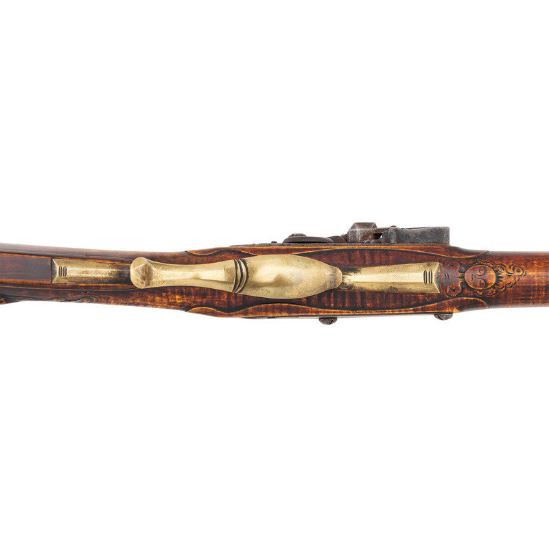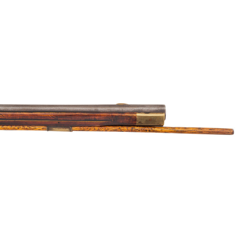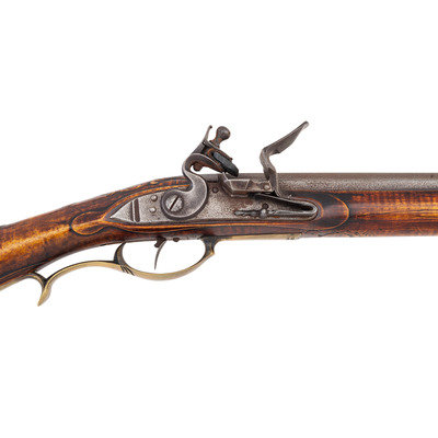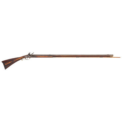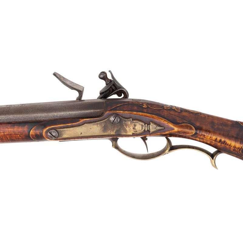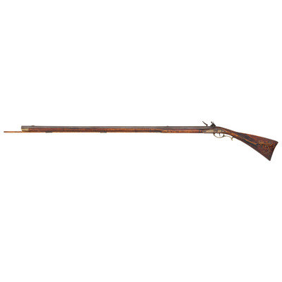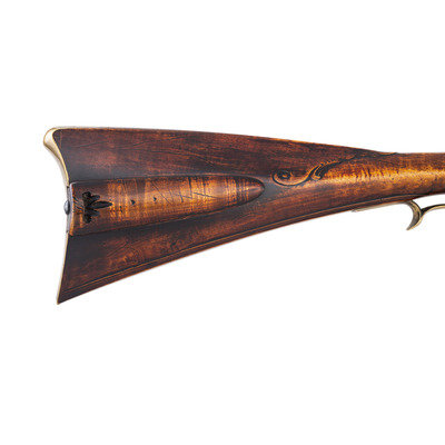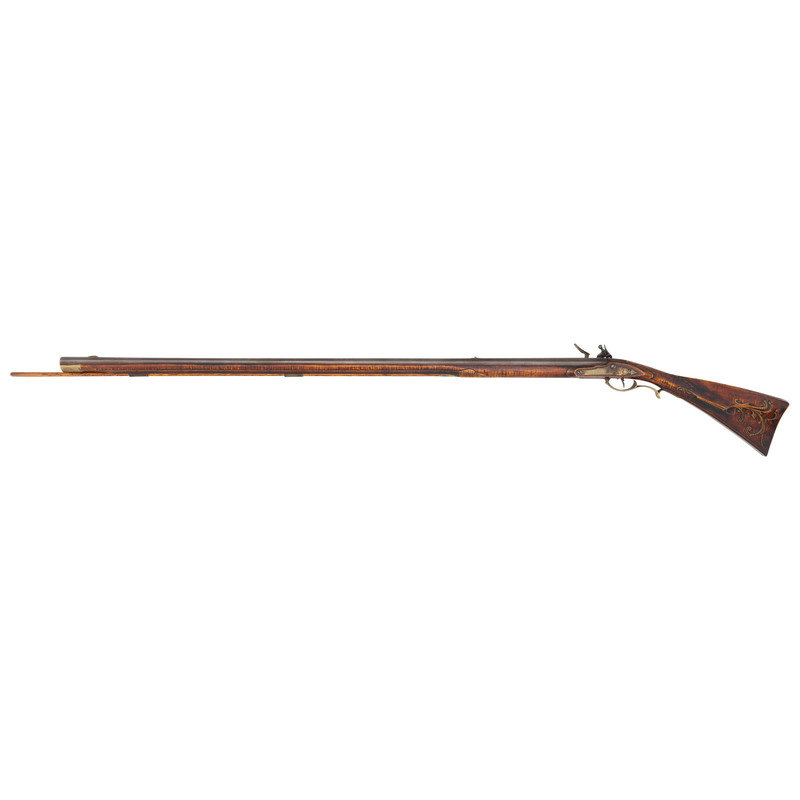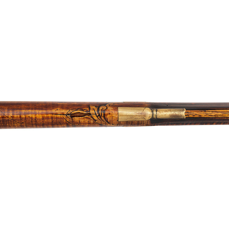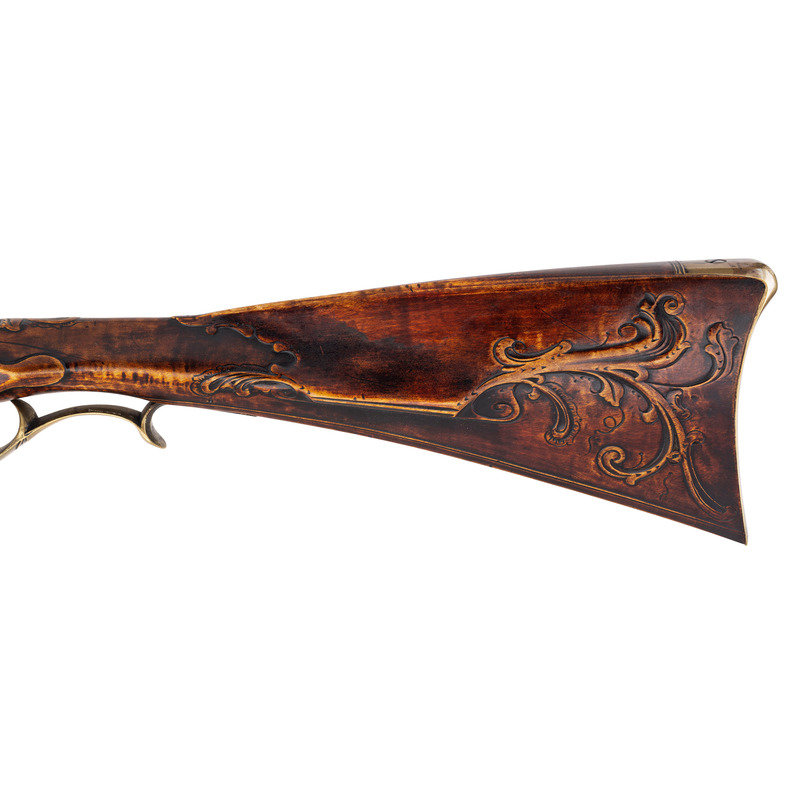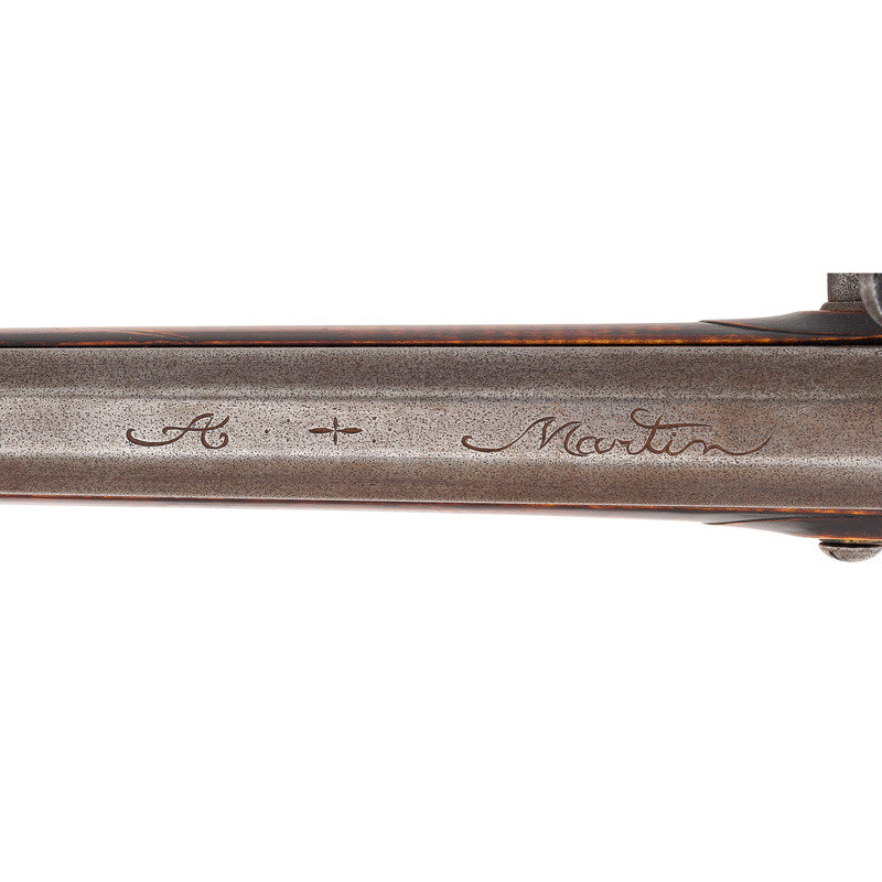.50 caliber. 44" pinned octagonal swamped barrel. SN: NSN. Dull brownish-gray patina on barrel, brass furniture, raised carved maple stock with sliding wood patchbox. Unmarked stepped flint lock with faceted and fenced, bridled iron pan and faceted flat swan neck cock. Top flat of barrels signed "A + Martin" in script. Attractive, neatly executed raised carving around breech plug tang, at the front and rear of the raised cheek rest and around the entry pipe. Allen Martin became a full-time rifle maker in 1989 and is a well known maker in the Contemporary Longrifle Association. From Martin's website, this appears to be what he refers to as a "Colonial Transitional SE PA Rifle".