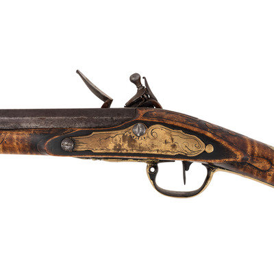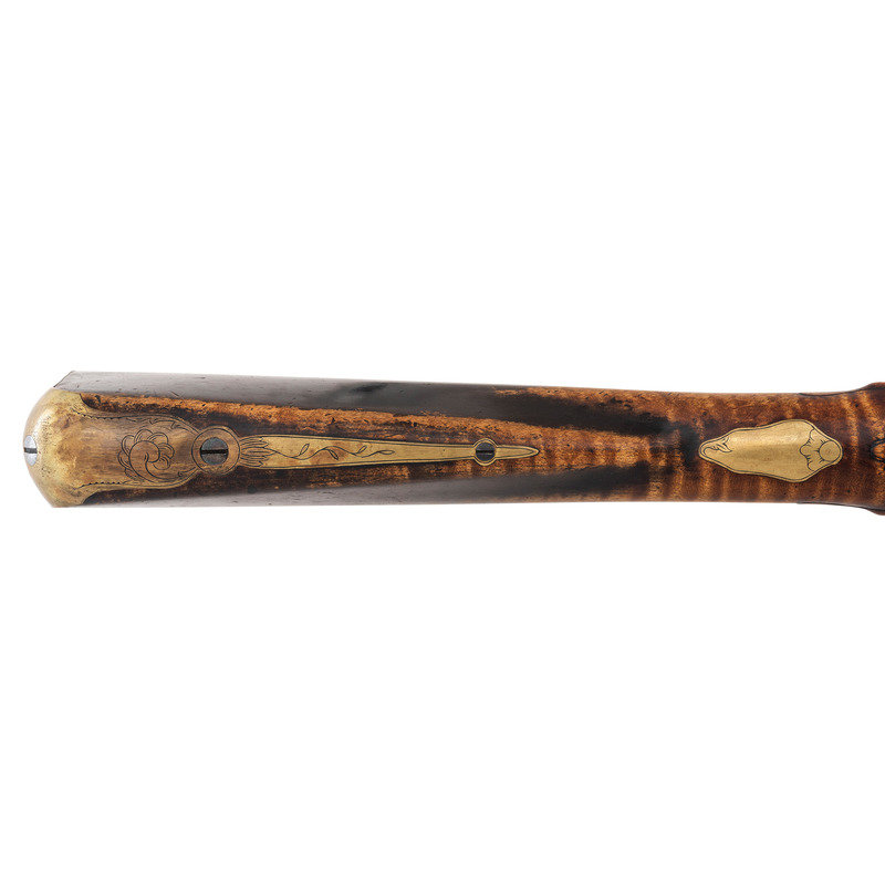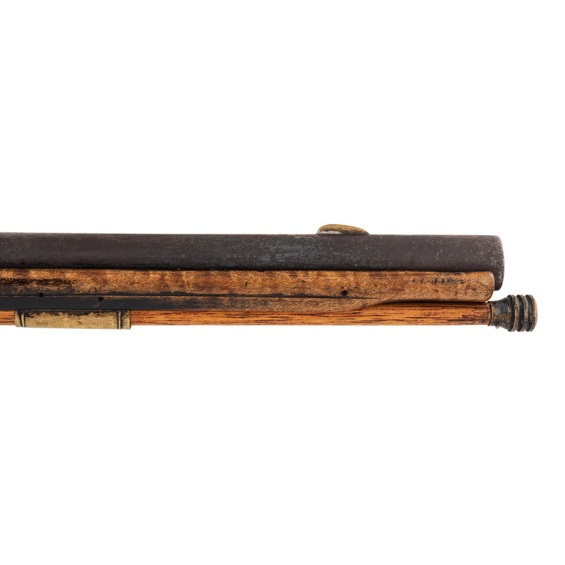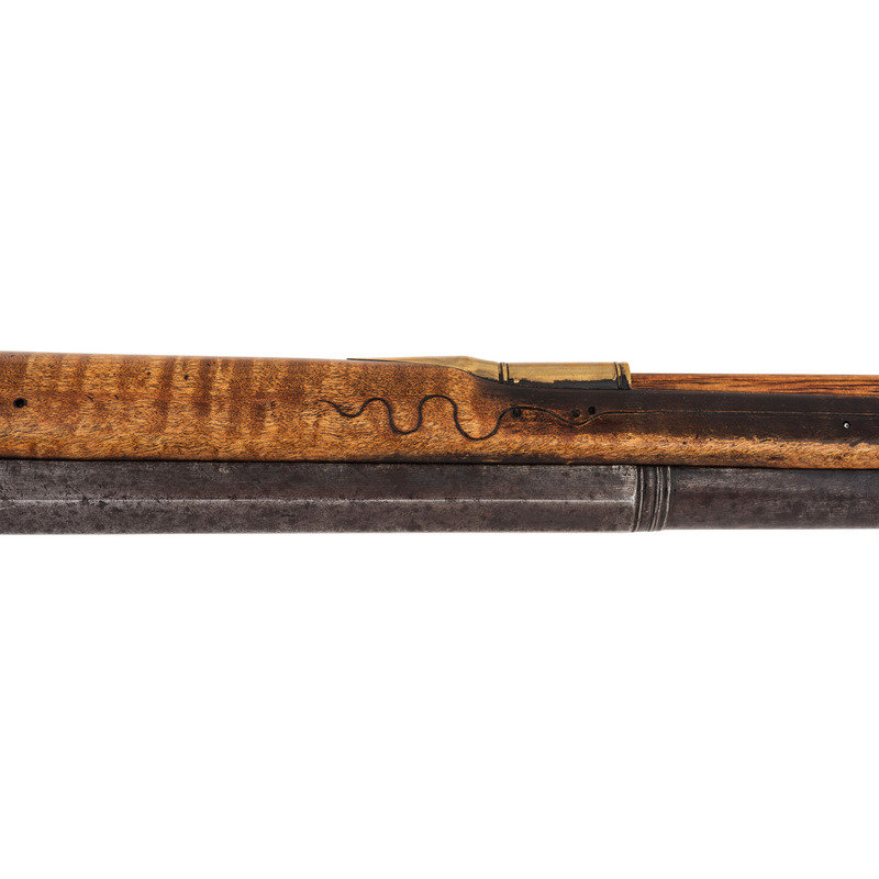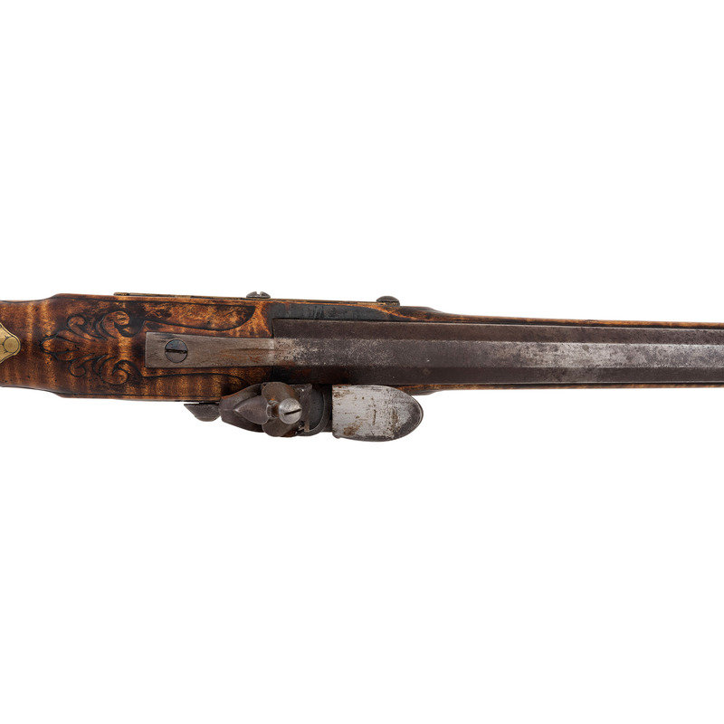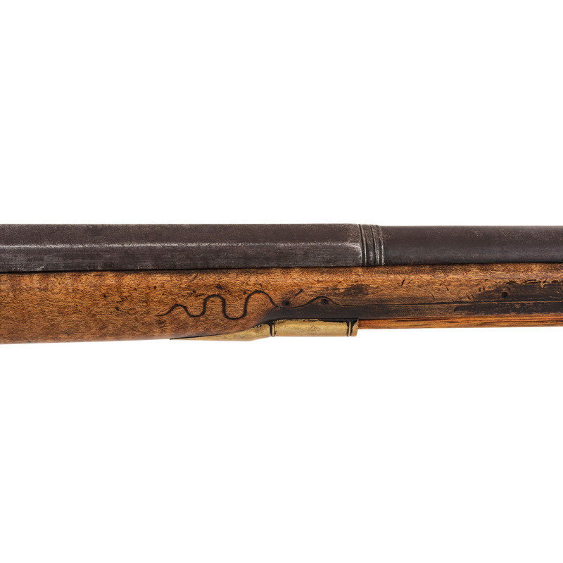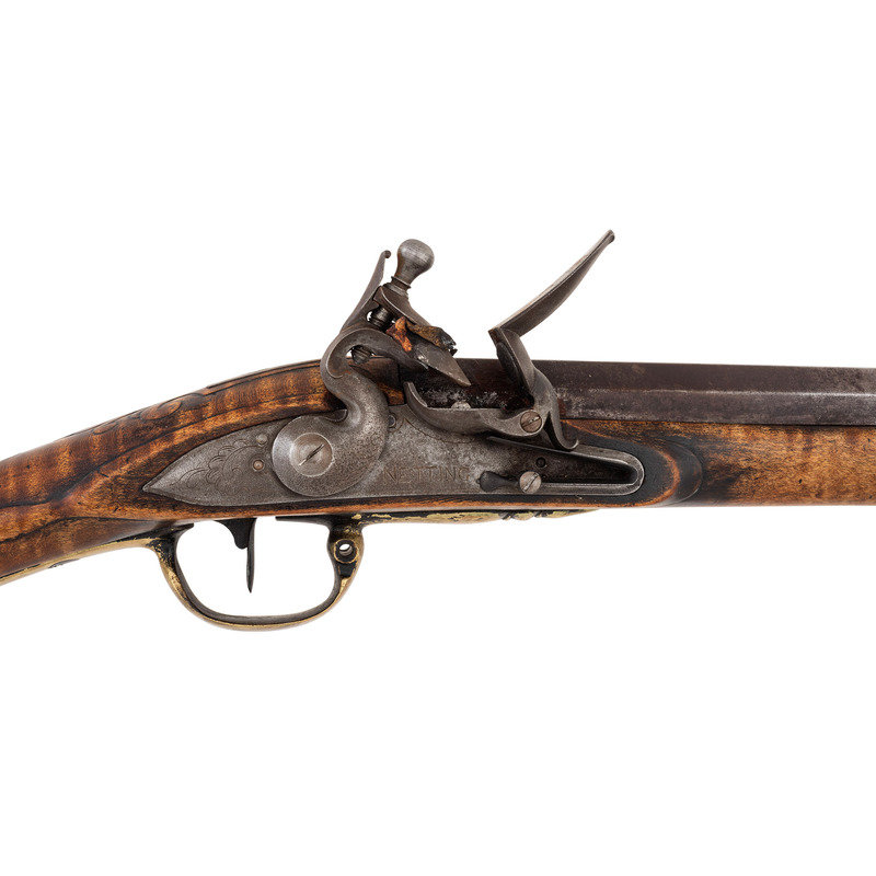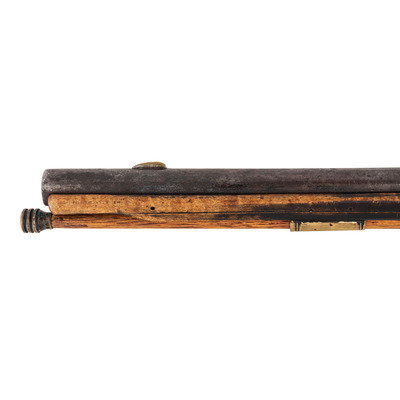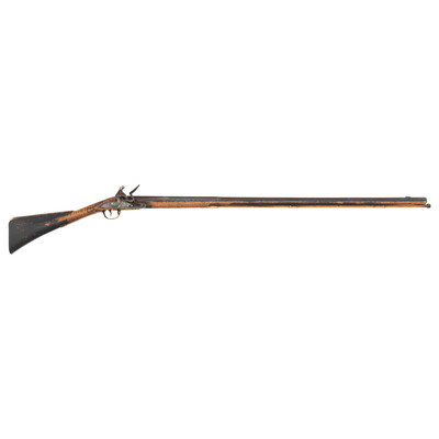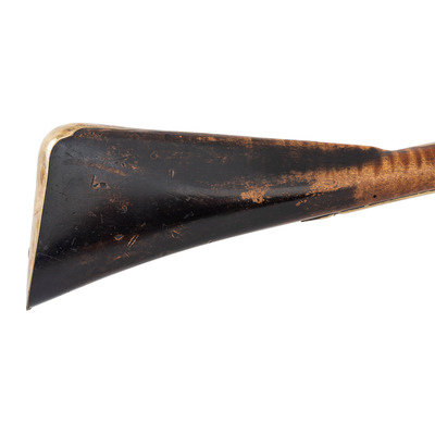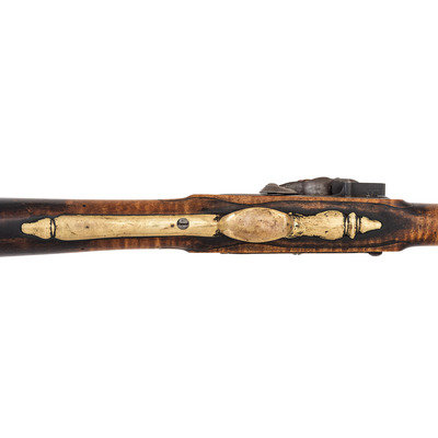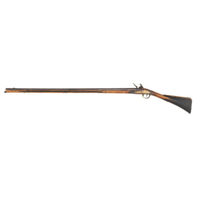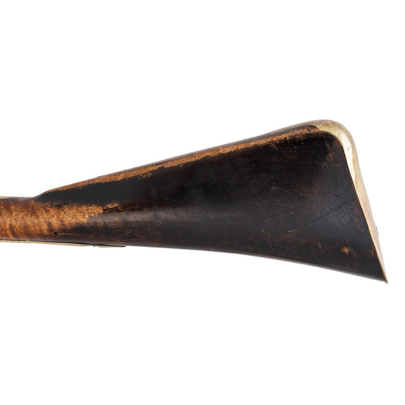.62 caliber. 41" pinned octagon to round barrel with baluster turned rings at the transition. SN: NSN. Bright finish, brass furniture, hardwood stock. Single screw flint lock marked "NETTING". No other markings. Produced in the from of a middle 18th century musket fowler with wide 2.25" butt and shield shaped wrist escutcheon but otherwise of with the furniture and appearance of a more traditional fowler. Barrel and stock with applied patina to recreate the use typical of these dual purpose guns, this is a very nicely executed example that could pass for an authentic period piece at more than a few feet of distance.