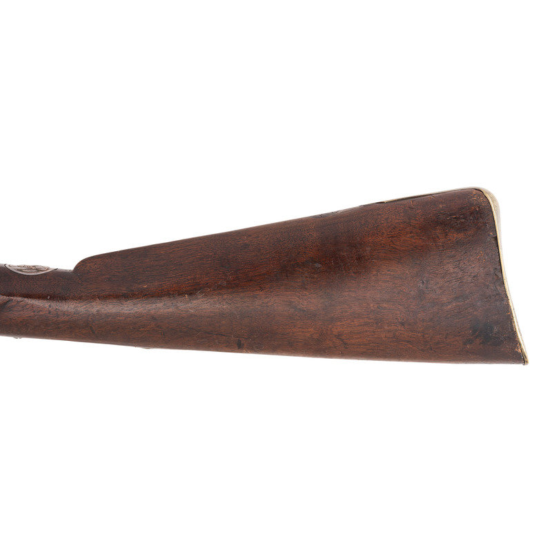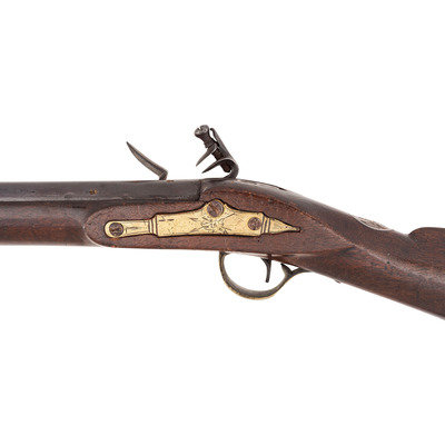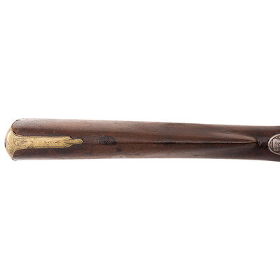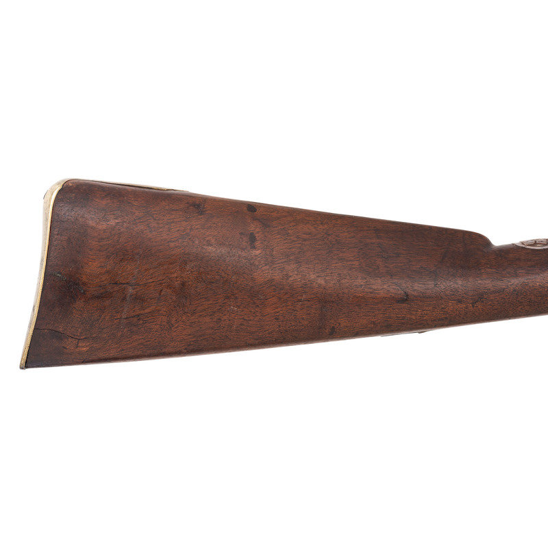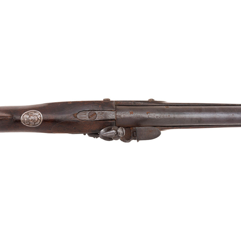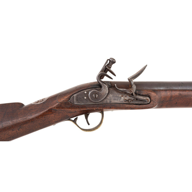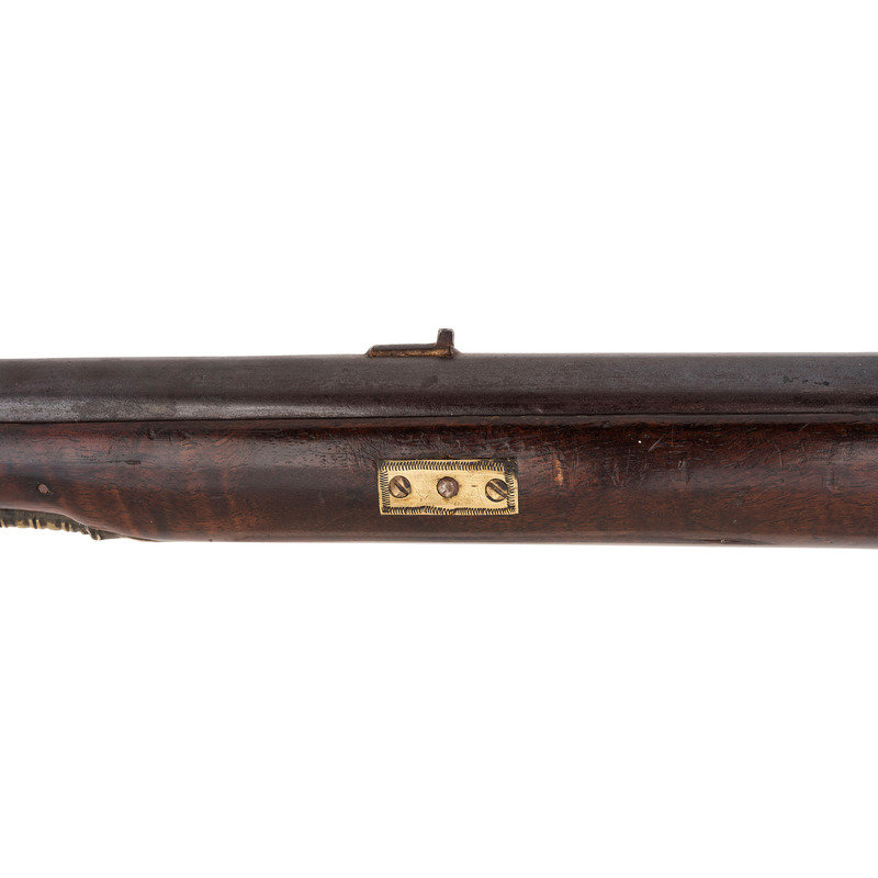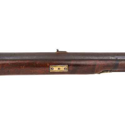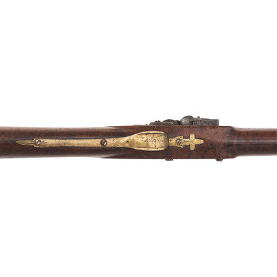 .66 caliber. 37" pinned round barrel. SN: NSN. Browned barrel, brass furniture, walnut stock. Flat stepped lock in original flint with bridled and fenced rounded iron pan and flat faceted swan neck cock. Lock marked "G. MORLEY" under the pan and with a "{Wild Boar}" surrounded by a hunting horn at the tail. Barrel weakly marked "LONDON" on top and with post-1813 Birmingham commercial proof marks as well as a deeply stamped set of maker's initials that read "T?". Breech plug tang lightly engraved, as are the flat brass side plate, buttplate tang and escutcheons around the lower pin. Typical German silver "Indian Chief" thumb piece at wrist. Fixed notch rear sight and German silver front. Corrugated ramrod pipes retain an old wooden ramrod. Only two gunmakers named "Morley" are listed in either Bailey or Blackmore, with the only one appropriate to this gun being John Morley who worked in London during the first quarter of the 19th century. This suggests that the mark may be a retailer or sales agent mark rather than a maker's mark. A solid example of an early 19th century Chief's Grade trade gun by a rarely encountered lock marking.