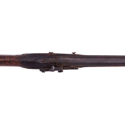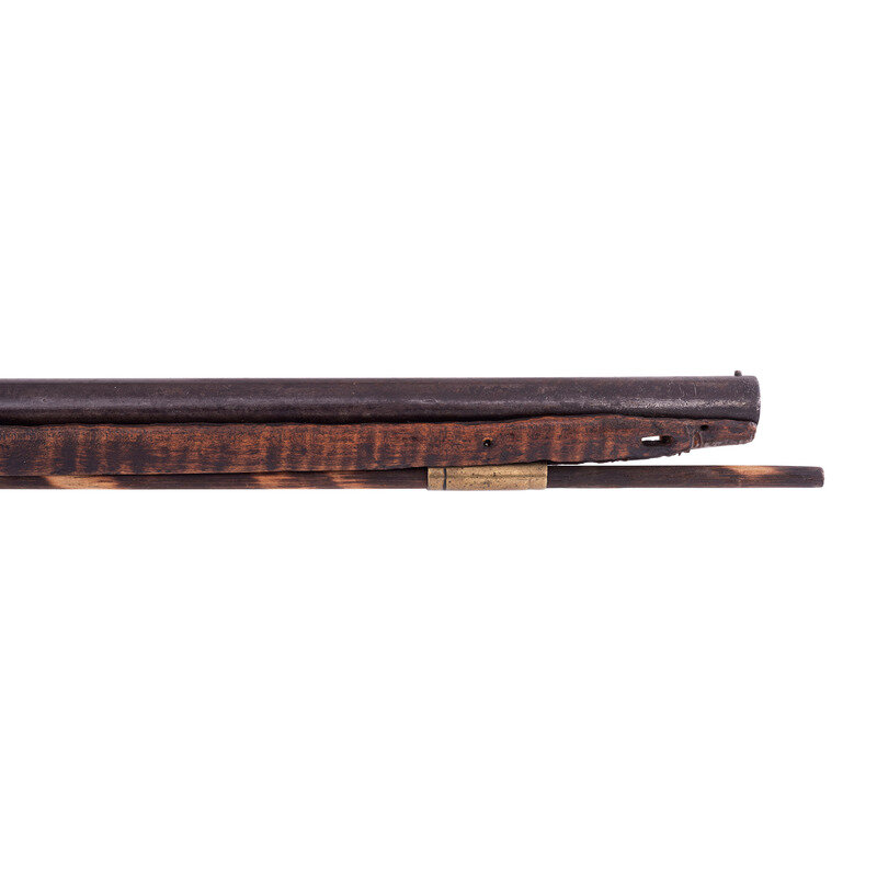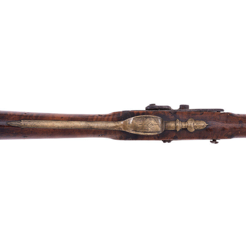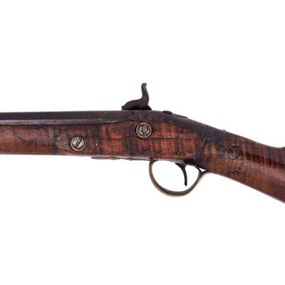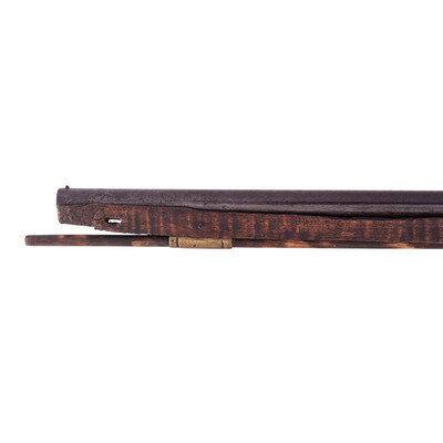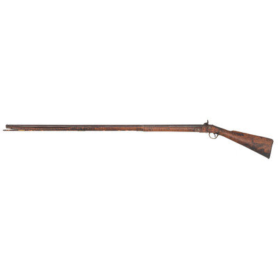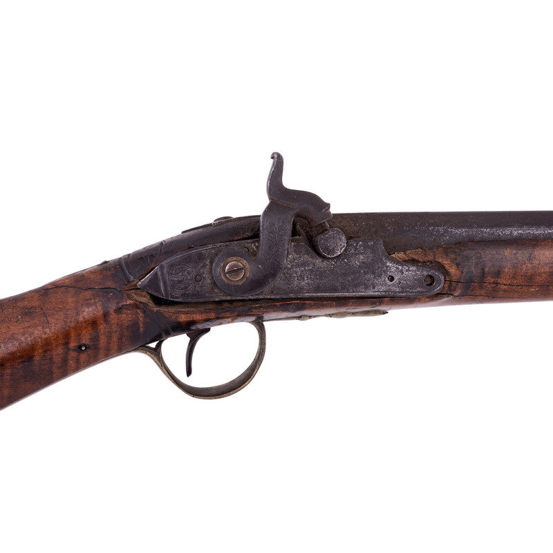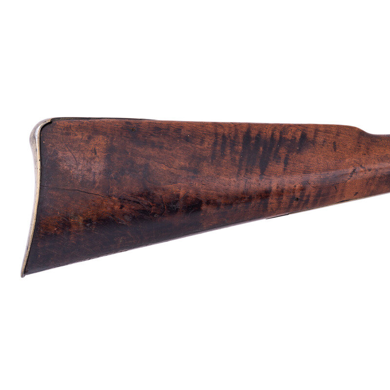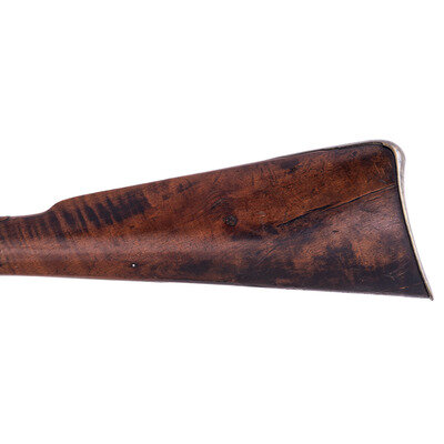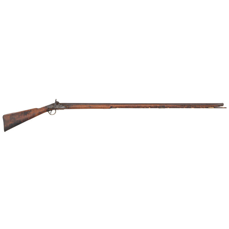 .54 caliber. 44.5" wedge retained octagon to round barrel with baluster turned rings at the transition. SN: NSN. Blued finish, brass furniture, walnut stock. Percussion altered flint lock marked "MOXHAM" under the bolster and with a "{Wild Boar}" in a circle with arrows and feathers at the tail of the lock. A small British Board of Ordnance "{CROWN-Broad Arrow}" is stamped below the bolster. Barrel marked with pre-1813 Birmingham proofs on the left angled flat and "LONDON" on the top flat. Lock secured with two screws with round brass escutcheons and no side plate, lightly engraved brass triggerguard with acorn finial and lightly engraved brass commercial buttplate. Sheet brass ramrod thimbles with baluster turned rings at the ends, wood ramrod. Thomas Moxham was a Birmingham based "Gunmaker & Victualler" who worked circa 1799 to 1837 and regularly marked his guns "London". He was one of the 16 contractors to the Board of Ordnance to produce arms for the Natives allied to the British during the War of 1812 and delivered 1,532 guns under that contract between 1813 and 1816. Notes from Mr. Ness indicate that this gun was collected from an Indian Reservation in Traverse Bay, MI. He further notes that it is "Chief's Grade" with a question mark, as is it is better quality than the typical Northwest Trade Guns, but does not have some of the decorative features that would be expected on a true "Chief's Grade" gun.