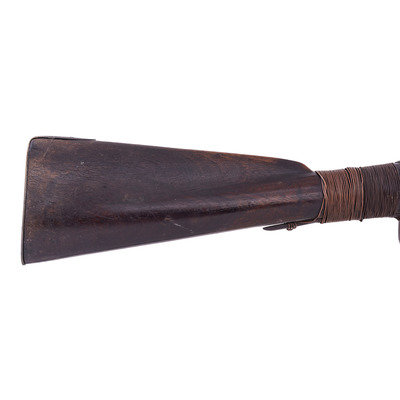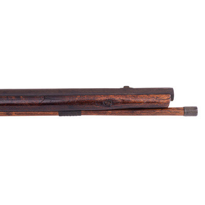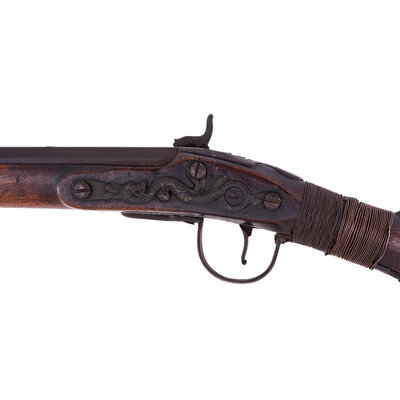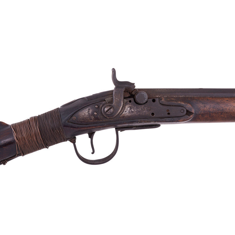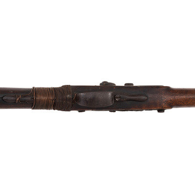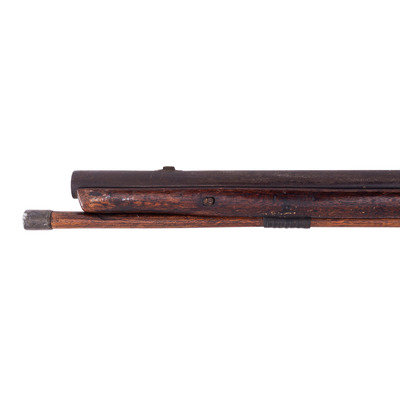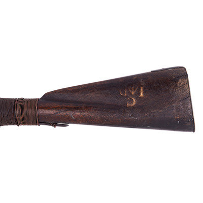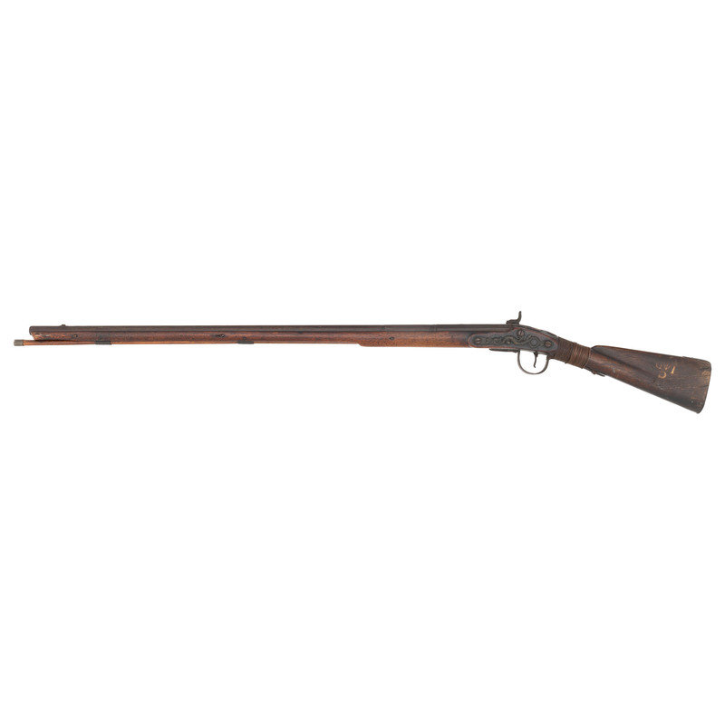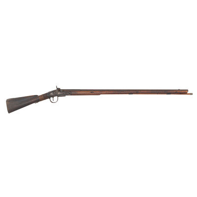 .60 caliber. 36.75" pinned three-stage octagon to round barrel with baluster turned rings at transitions. SN: NSN. Heavily oxidized brown barrel, brass and iron furniture, walnut stock. Three screw percussion altered flint lock marked with the "{Fox in a Circle}" trademark under the bolster, along with a Board of Ordnance "{CROWN-Broad Arrow}" acceptance mark and "GALTON" at the tail in a vertical arc. Top flat of barrel marked "LONDON" with British Board of Ordnance proofs on the left angled flat. Reverse butt branded upside down in two lines "C/I {Broad Arrow} D" most likely indicating "Canadian Indian Department". Typical Northwest gun features include the serpent side plate, oversized iron triggerguard, nailed brass buttplate, and raised carved moldings around the tang and at the tail of the lock and counterpane. Wrist wrapped with copper wire to effect an old repair. Standard ribbed brass ramrod thimbles with metal tipped wood ramrod that appears to be period. Two generations of Galtons worked as gunmakers in Birmingham, initially as Farmer & Galton with Samuel Sr making his son Samuel Jr a partner in the firm in 1774 after the death of James Farmer. The firm continued under the name Galton and then Galton & Son though the early 19th century. Their primary products were inexpensive trade guns for the African slave trade and the East India Company but they were also one of the 16 contractors to produce guns for the Board of Ordnance to distribute to the Native allies of the British during the War of 1812. Between 1813 and 1816 Galton delivered 2,557 such guns for the use of North American Natives and this is one of those scarce guns.