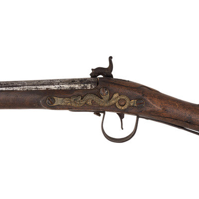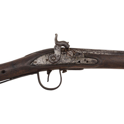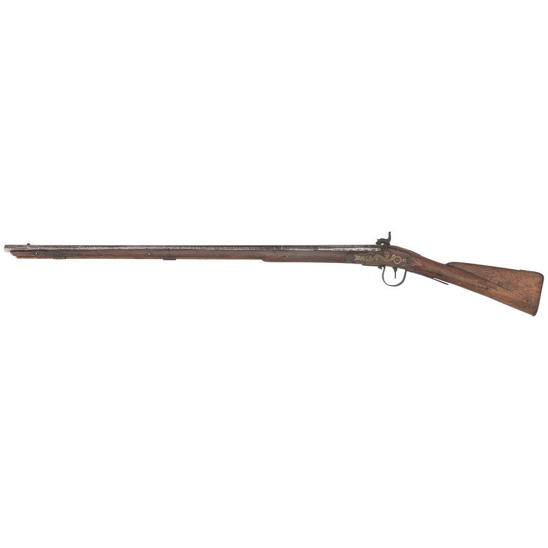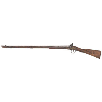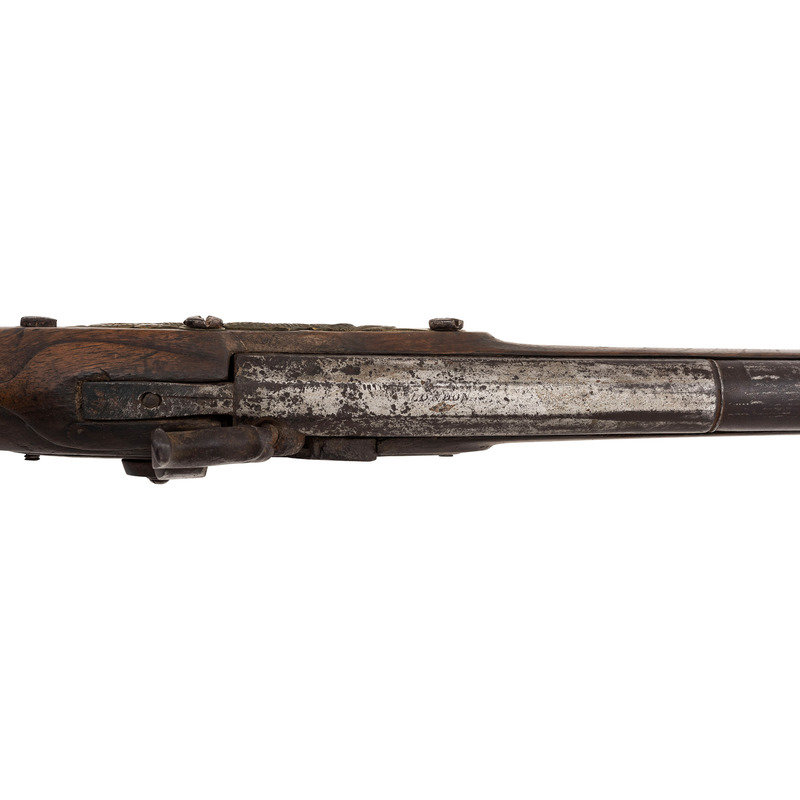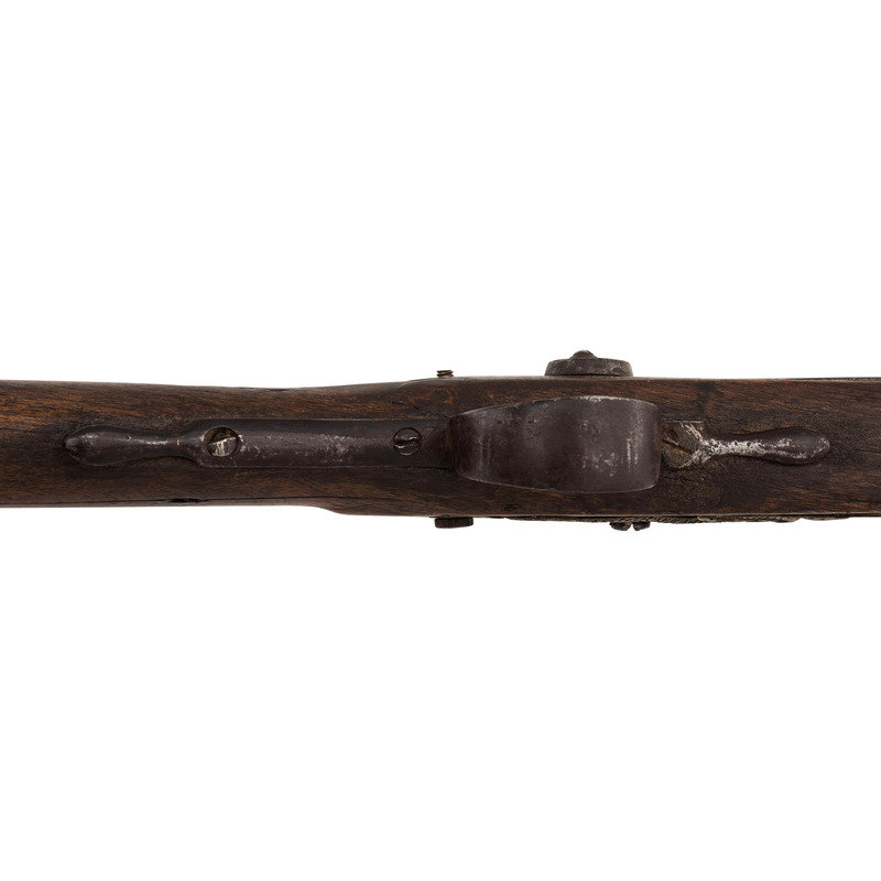 .58 caliber. 36.25" pinned three-stage octagon to round barrel. SN: NSN. Bright finish, iron and brass furniture, full-length walnut stock. Crudely percussion altered flint lock is marked "MORRIS" in an arc at the tail and appears to have the remnants of a "{Circle-Fox}" logo forward of the hammer, which has been partially cut away to make room for the crude brazed percussion bolster applied at the time of alteration. Lock with commercial percussion hammer added as part of the alteration, screw holes for the flint battery were not filled during the conversion. Barrel marked "LONDON" on the top flat and with British Board of Ordnance proof marks indicating that this gun was produced at part of the 1813 contract to provide arms to the Native Allies of the British during the War of 1812. Barrel with brass blade front sight. Standard Northwest gun features include the ubiquitous brass three-screw serpentine side plate, large iron triggerguard and raised carved apron around the tang. The flat brass buttplate is retained in the early style with nails and the tang screw enters from the plate in front of the triggerguard. Two corrugated pipes secure a wood ramrod. Henry Morris was a Birmingham gunmaker circa 1802-1813, with his wife taking over the business from 1814-1817. While Morris did not appear to directly contract with Ordnance he was a partner with William Grice who was a long time Birmingham maker and Board of Ordnance contractor. Thus the partnership of Grice & Morris (ca1799-1817) did receive part of the 1813 trade gun contract from Ordnance and delivered 1,821 guns between 1813 and 1816 for the use of Native Allies. A scarce, crudely altered Board of Ordnance gun from the War of 1812 with an uncommon contractor's name on the lock.