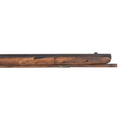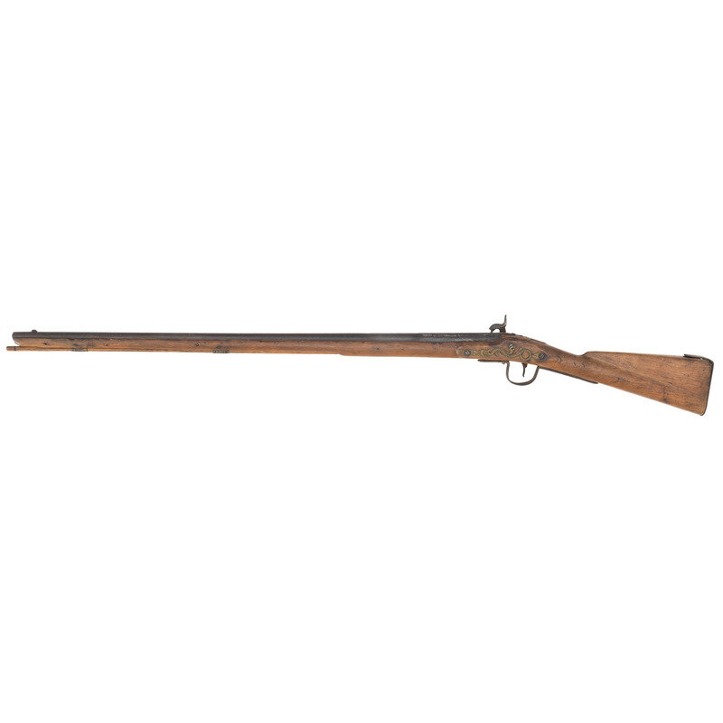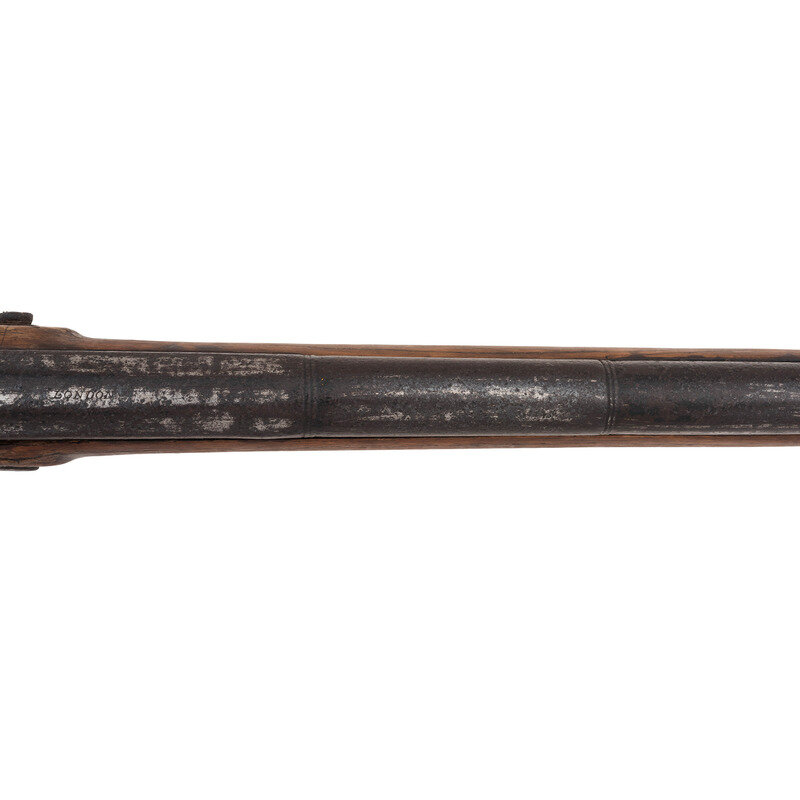 .58 caliber. 35.75" pinned three-stage octagon to round barrel. SN: NSN. Heavily oxidized metal, brass and iron furniture, full-length walnut stock. Percussion altered early form flint lock marked with the "{Circle-Fox}" logo forward of the hammer and marked in an arched vertical line at the tail "ROLFE". Top flat of barrel with "{Circle-Fox}" logo and with British Board of Ordnance proofs on the left angled flat, including the expected "{Crown}/GR/{Broad Arrow}" and "{Crossed Scepters}". No visible Ordnance mark on the lock. Crude percussion alteration without the flint battery holes filled, crudely made percussion hammer and typical "blacksmith" style drum bolster. Typical 3-screw brass serpent side plate, nailed flat brass buttplate, oversized iron triggerguard and two corrugated brass ramrod pipes securing an old wood ramrod.