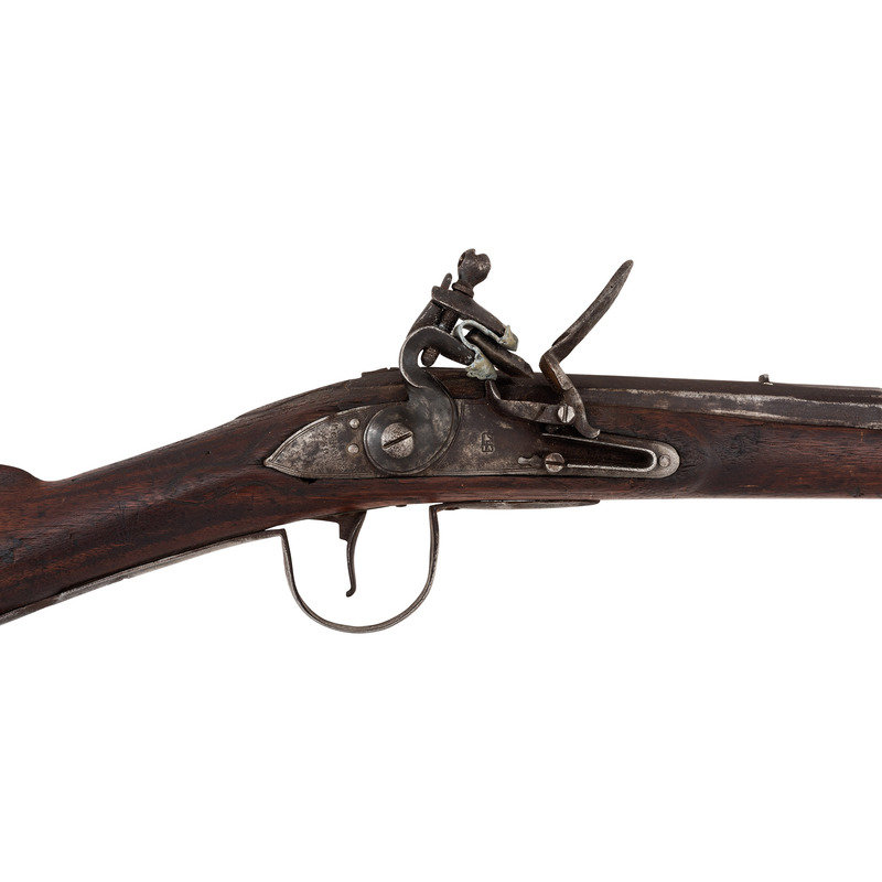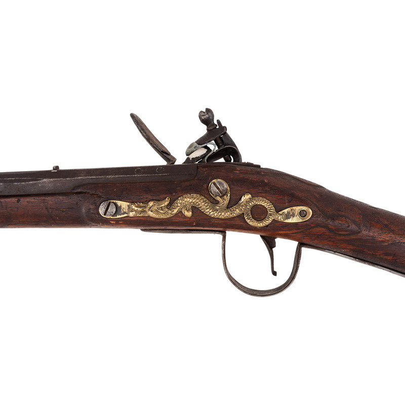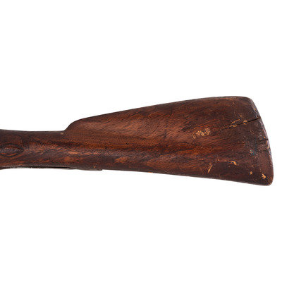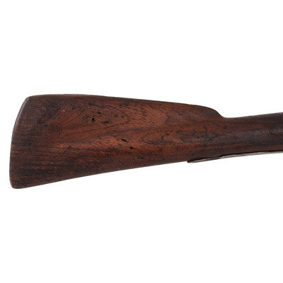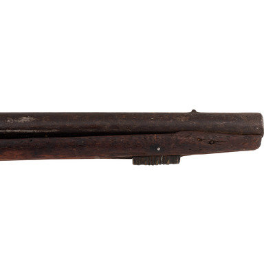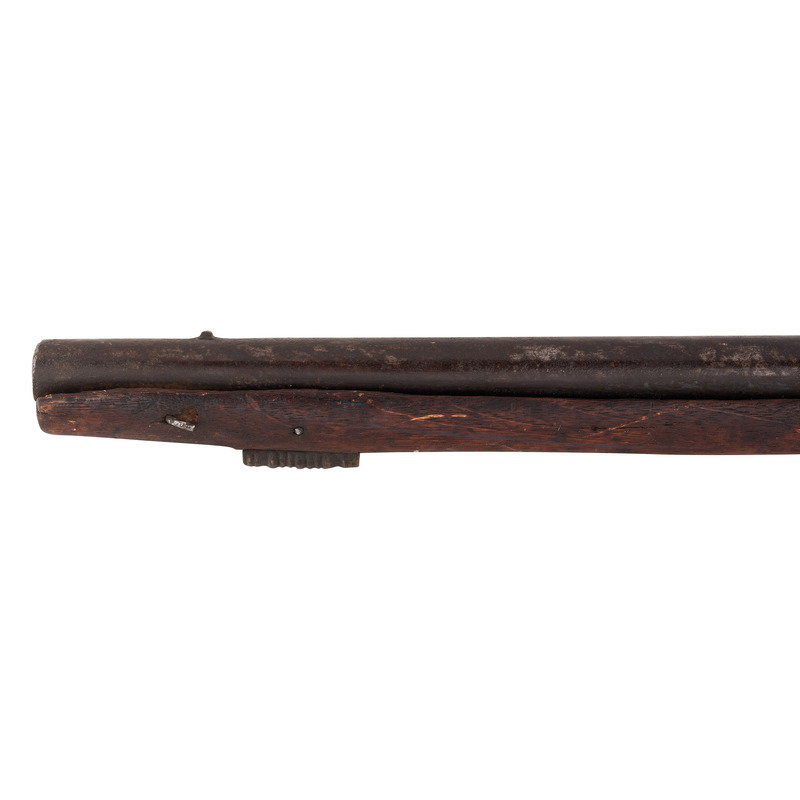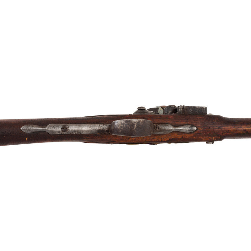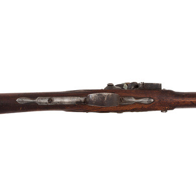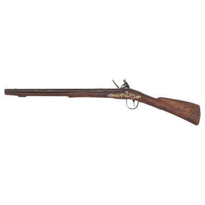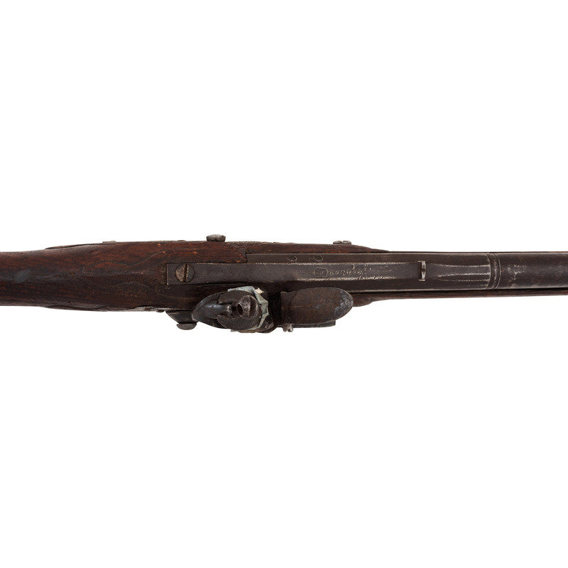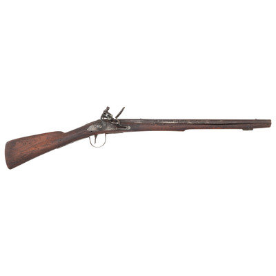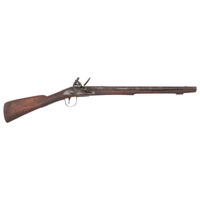 .58 caliber. 22.25" three-stage pinned octagon to round barrel with baluster turned rings at the transitions. SN: NSN. Bright finish now heavily oxidized, iron and brass furniture, walnut stock. Lock marked in two vertical arcs at the tail "W. CHANCE/& SON" and with the sunken "tombstone" "{FOX}/IA" mark of the American Fur Company under the pan. Top flat of barrel marked "LONDON" with another American Fur Company mark and a pair of pre-1813 Birmingham proof marks. Obverse butt with weak "fox in a circle" mark. Pointed-tail lock remains in original flint configuration with a rounded swan-neck cock, bridled and fenced rounded iron pan and wonderfully period re-faced frizzen. Typical trade gun features of the period include the oversized iron triggerguard, serpentine brass side plate in the form of a dragon and raised carved moldings around the breech plug tang, the rear of the lock mortise and the counterpane. The gun was shortened during the period of use to carbine length, with the barrel somewhat crudely cut back between 10" and 15" from its original full length and all but one ramrod pipe removed. The buttplate was removed as well, with the butt now slightly rounded and showing moderate wear due to long use without the buttplate in place. A small number of old, square shanked holes in the obverse butt suggest that at one time the gun was decorated with a few tacks. William Chance was listed as a "merchant" in Birmingham from 1777 through 1780, then doing business as Chance & Homer and finally as William Chance & Son(s) from 1812-1821. The pre-1813 Birmingham proofs, combined with the lock markings date this gun rather narrowly to about 1812-1813 production. A really attractive, if hard used, Native trade gun from the American Fur Company that is well worn and completely honest and that dates from the period of the War of 1812.