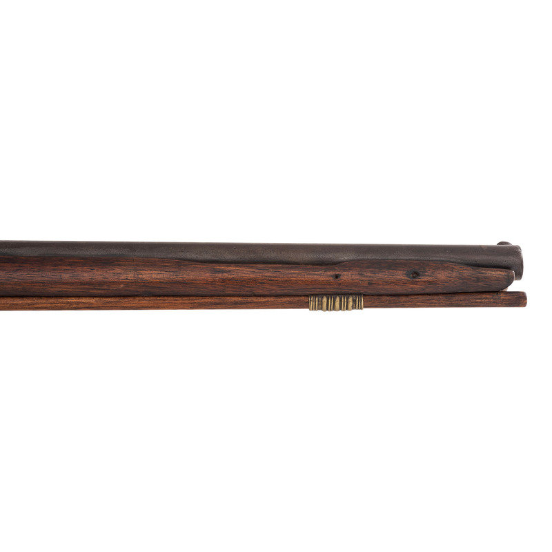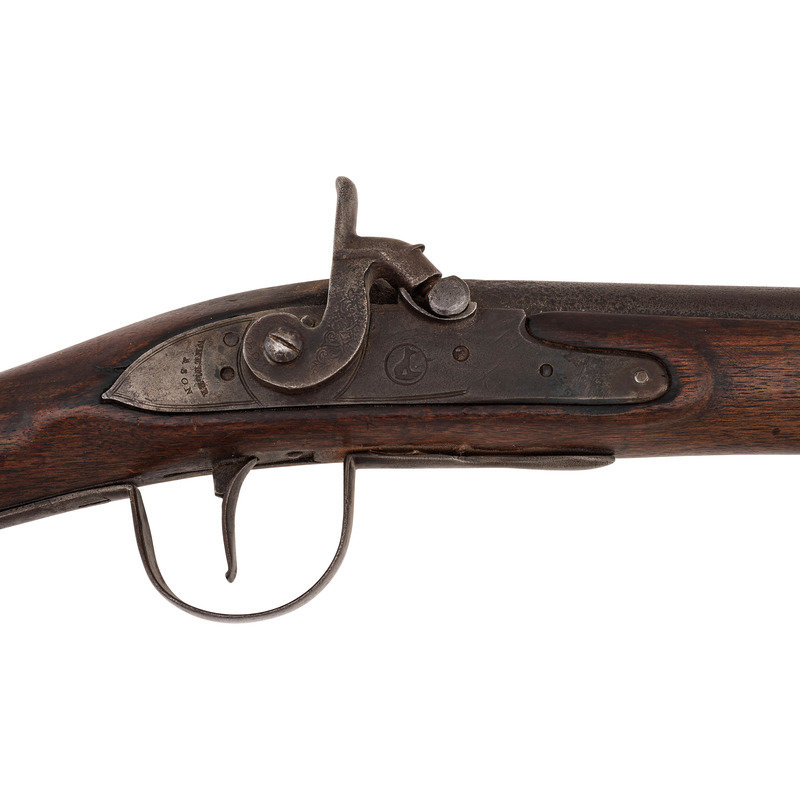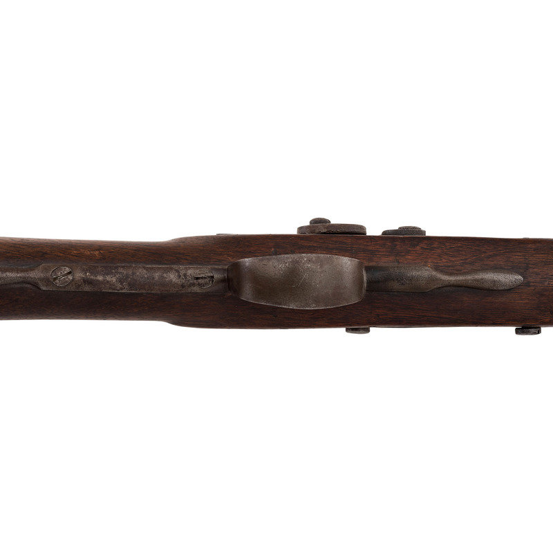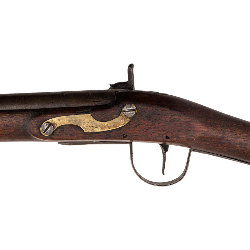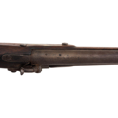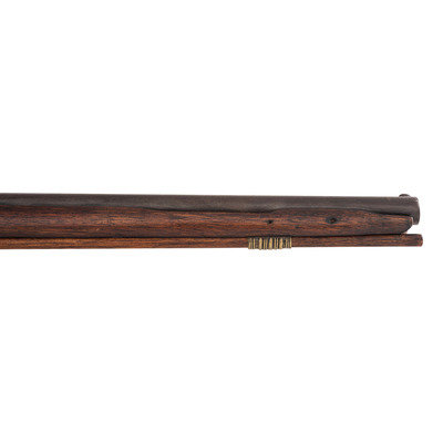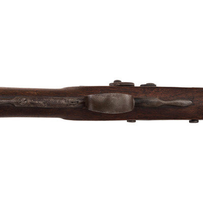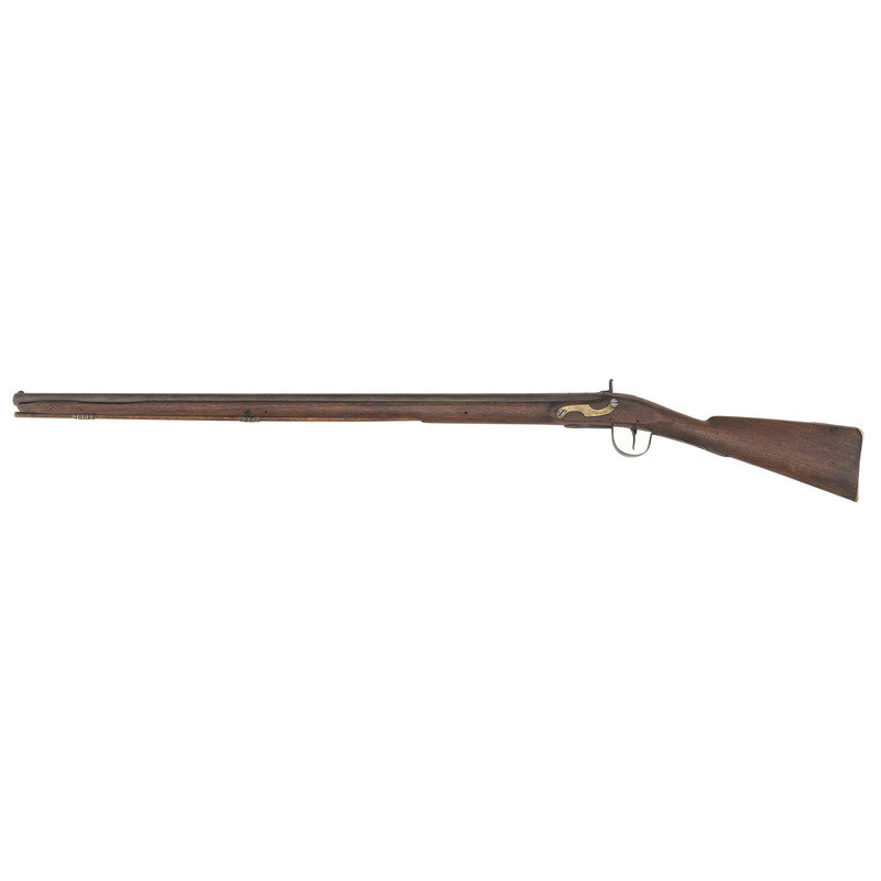 .68 caliber. 36" pinned round barrel. SN: NSN. Bright finish, brass furniture, full-length walnut stock. Percussion altered flint lock marked with the "{Circle-Fox}" motif under the bolster and in marked in two vertical arcs "WHEELER/& SON" at the tail. Drum bolster alteration, with lightly engraved civilian-style percussion hammer. Barrel with post-1813 Birmingham commercial proof marks. Flat geometric S-shaped military style side plate, flat brass buttplate, large iron triggerguard. Two corrugated brass pipes secure an old wood ramrod. The firm of Wheeler & Son was the continuation of a Birmingham business established by Robert Wheeler (3) circa 1799, adding "& Son" circa 1814 and continuing operation until about 1843. While Wheeler did deliver British Board of Ordnance trade guns under the 1813 contract during the War of 1812, he never appears to have contracted with the Hudson's Bay Company or the American Fur Company and the majority of the Wheeler trade guns appear to have reached Native hands through the old Northwest Company of Montreal. Interestingly Wheeler guns do not follow the prototypical Northwest, particularly in terms of caliber, which was larger than the standard trade gun.