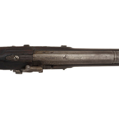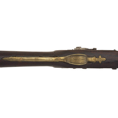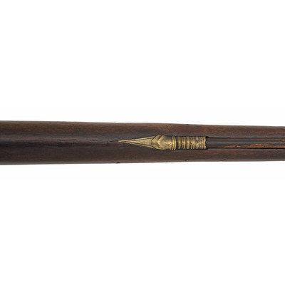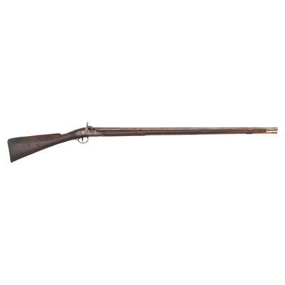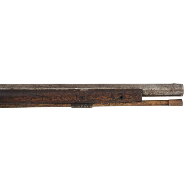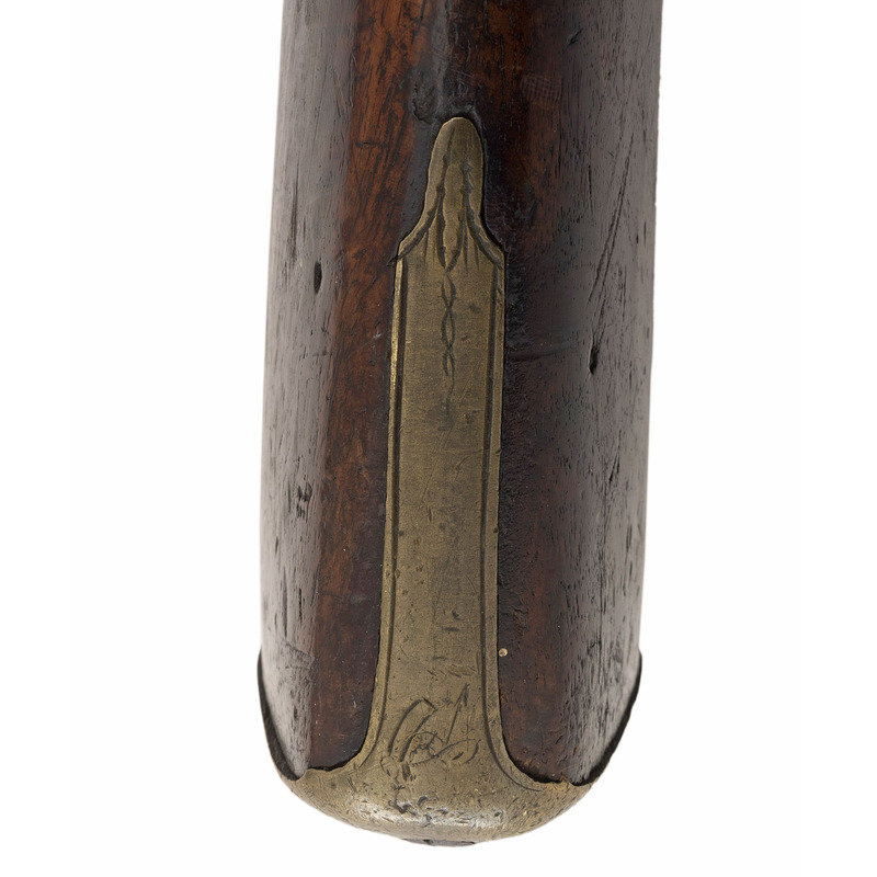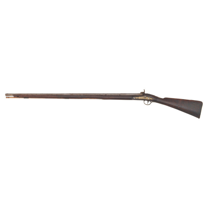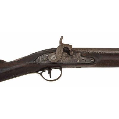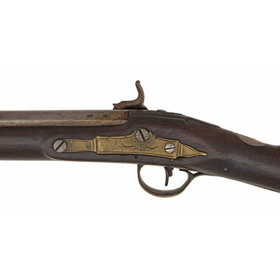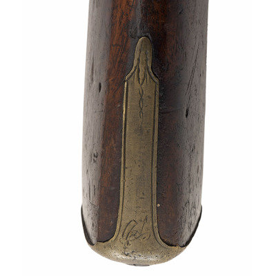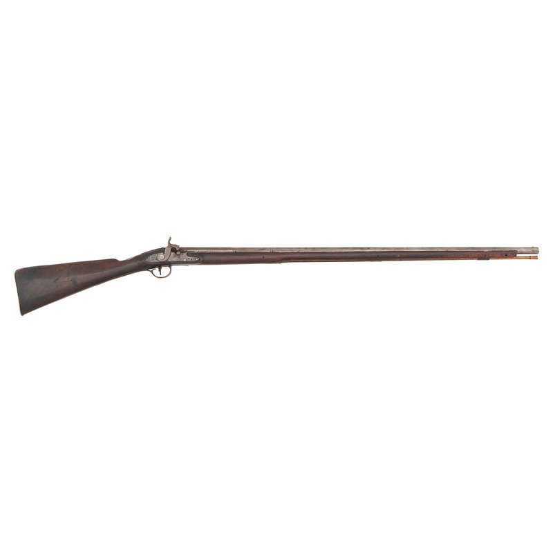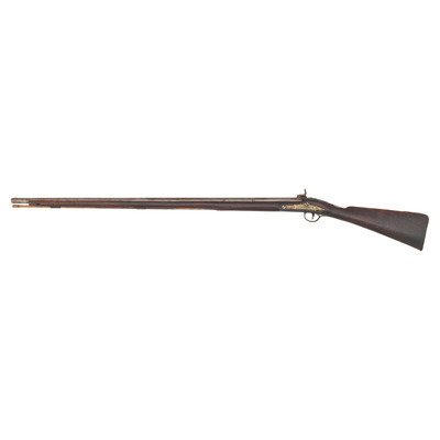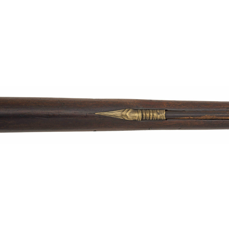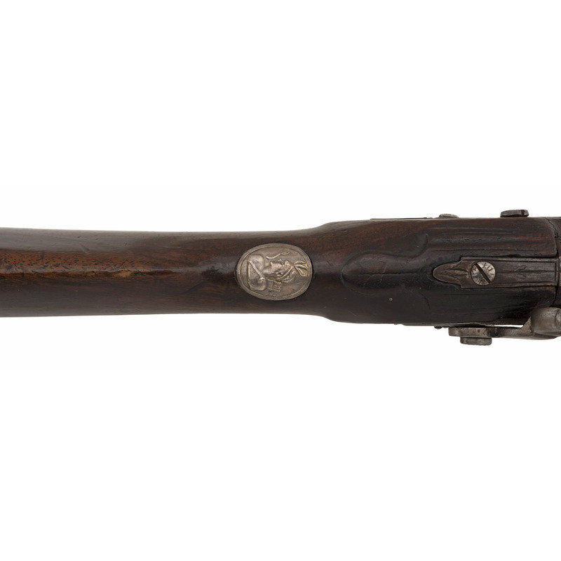 .60 caliber. 36.625" three-stage octagon to round barrel. SN: NSN. Bright finish, brass furniture, full-length walnut stock. Lightly engraved flint lock altered to percussion with a commercial hammer and a drum bolster. Lock with weak "{Crown-Broad Arrow}" Board of Ordnance mark, left angled breech with Board of Ordnance proofs. Traditional "Chief's Grade" furniture includes a lightly engraved flat brass three-screw side plate and triggerguard, both decorated with arrow motifs. Wrist with German silver "Indian Chief" motif thumb plate. Buttplate with simple boarder engraving, typical corrugated brass ramrod pipes secure an older wood ramrod with copper tip. The presence of the British Board of Ordnance markings on the gun indicate it was part of the 1813 British military contract for arms to supply to the British Native Allies in North America during the War of 1812.