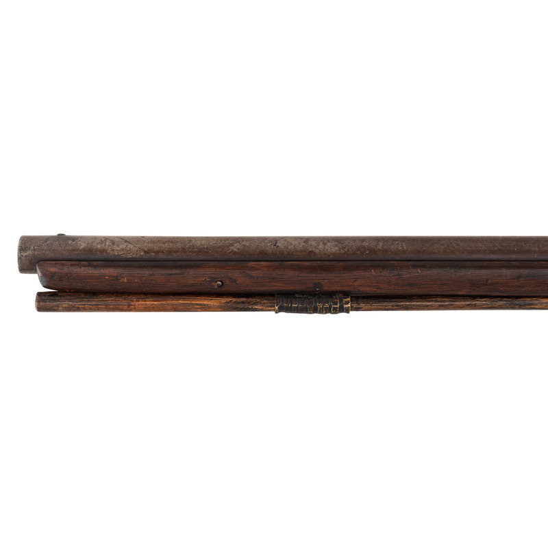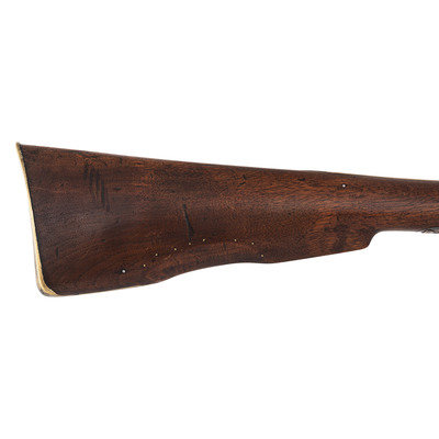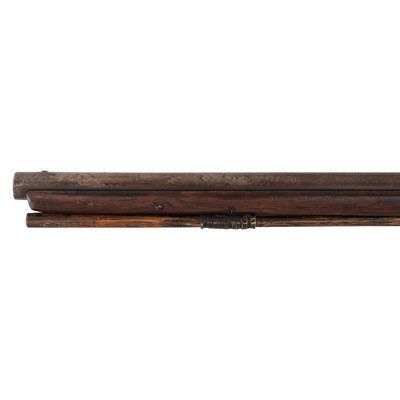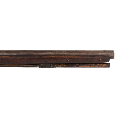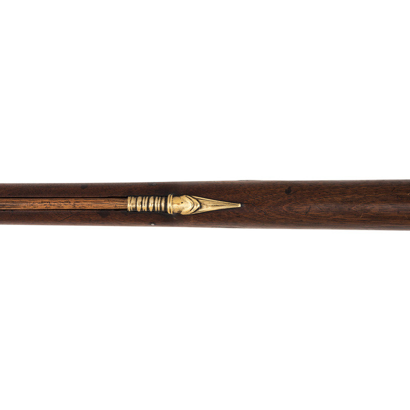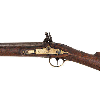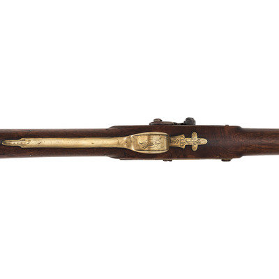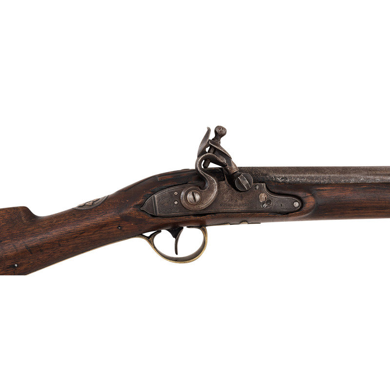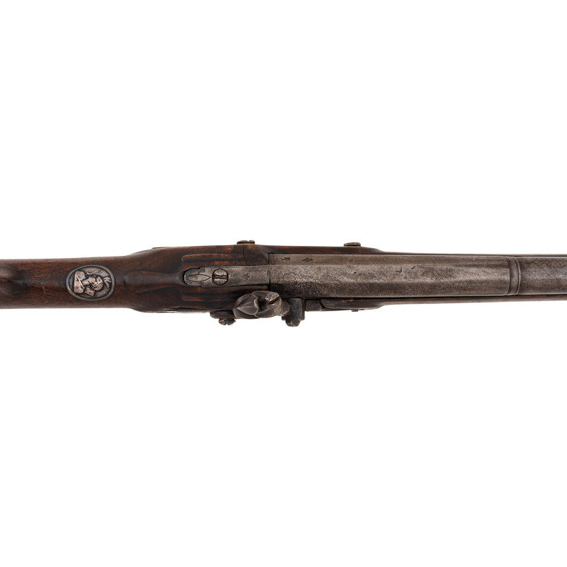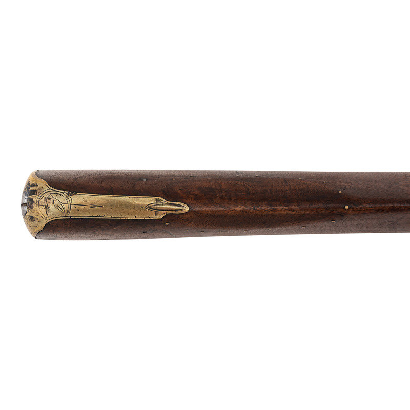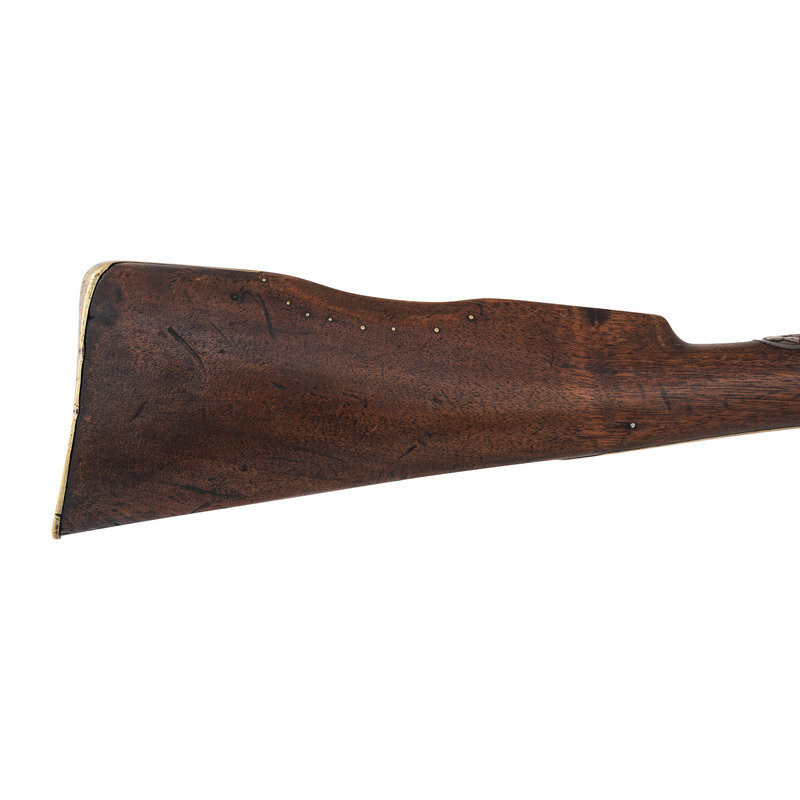 .60 caliber. 36.75" pinned three-stage octagon to round barrel with baluster turned rings at the transitions. SN: NSN. Damascus patterned finish on barrel, brass furniture, walnut stock. Flint lock is percussion altered with a striker in the jaws of the flat faceted swan neck cock and a percussion bolster screwed into the touchhole. The lock is marked with a wild boar in a hunting horn at the tail and "SUTHERLANDS" forward of the cock. Barrel with Board of Ordnance proofs including a "{CROWN}/GR/{BROAD ARROW}". Chief's Grade gun with German silver Indian Chief motif thumb plate at wrist and lightly engraved brass furniture. Comb of stock dished with small finishing nails around the periphery suggesting that a cheek pad of some sort was added to the comb during the period of use. The firm of R&R Sutherlands was a partnership between Richard and Ramsay Sutherland that worked in Birmingham circa 1800-1827. They received a contract from the British Board of Ordnance to produced trade guns for the Native Americans that were allied with the British during the War of 1812 and during the period of 1813-1816 the firm delivered 2,587 guns (Gordon). This percussion altered Chief's Grade gun with Board of Ordnance proofs was likely part of the War of 1812 contract deliveries.