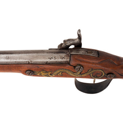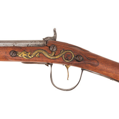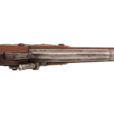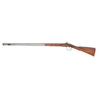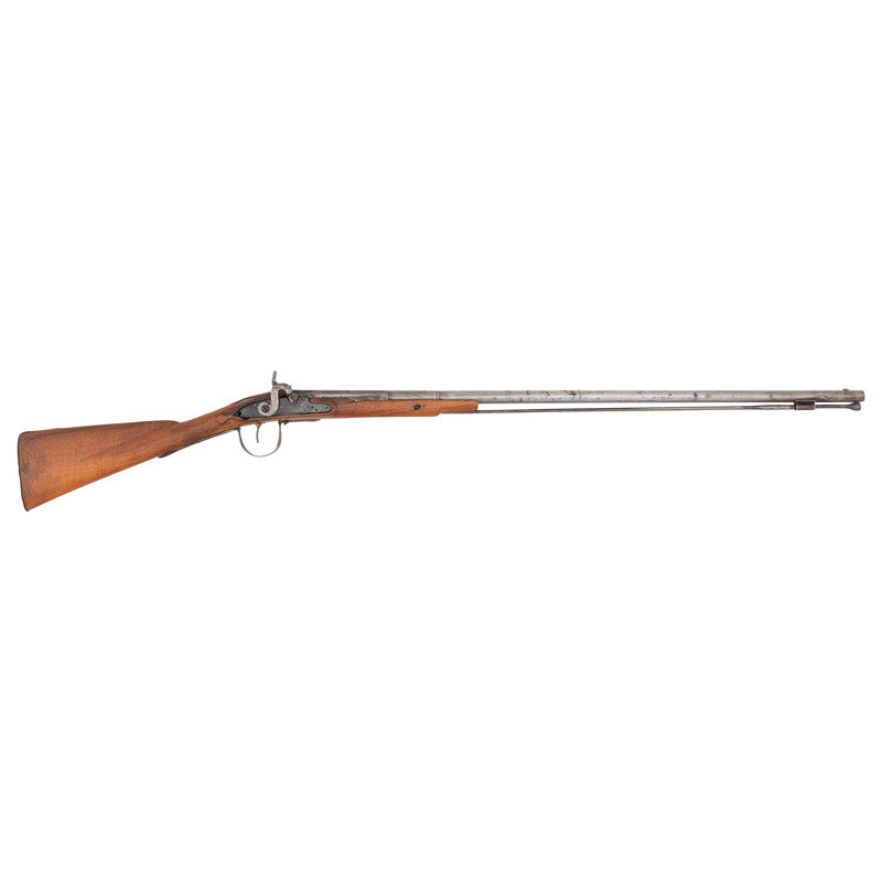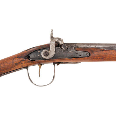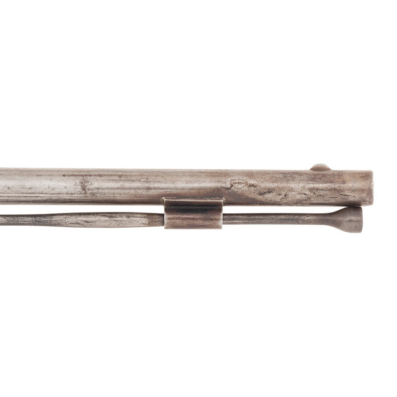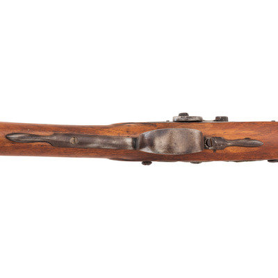 .58 caliber. 34.5" pinned three-stage octagon to round barrel. SN: NSN. Bright finish, brass and iron furniture, period shortened walnut stock. Percussion altered flint lock marked with the "{Tombstone-Fox}/IB" mark and marked at the tail in two lines "BARNETT/1802". Barrel with drum bolster conversion, crude percussion hammer, Tower private proofs and the "*/RB" mark of Robert Barnett. Typical trade gun features include the three-screw brass serpent side plate, oversized iron triggerguard, raised carved aprons around the tang and at the tails of the lock and counterpane and nailed brass buttplate. Stock shortened to "half-stock" length with an added iron pipe brazed to the bottom of the barrel, which secures a swelled shank tulip head ramrod of the U.S. Model 1855 or Model 1861 pattern.