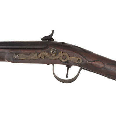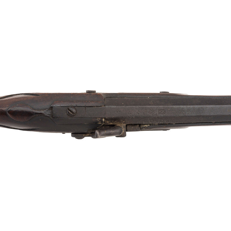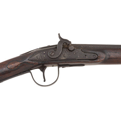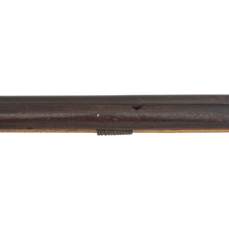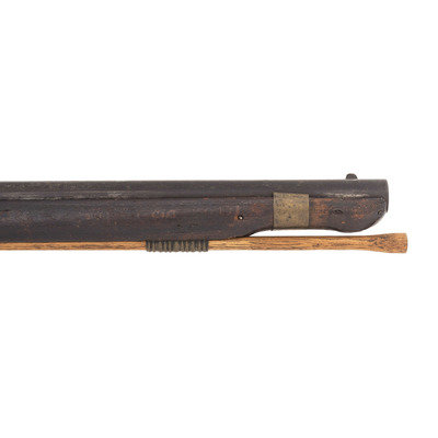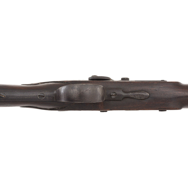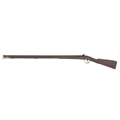 .66 caliber. 40" pinned 3-stage octagon to round barrel. SN: NSN. Browned finish, brass and iron furniture, full-length beech stock. Slightly rounded flint lock altered to percussion with a drum bolster and somewhat crudely executed percussion hammer. Lock marked "IA" for John Jacob Astor and with the "{Tombstone Fox/IA}" mark of his American Fur Company forward of the hammer. Tail of lock marked "J.A. PETRY" in a vertical arc and dated "1854". Top flat of barrel marked with the "E/LG/*" in an oval Liege proof house mark, another "{Tombstone Fox/IA}" and "LONDON". The left angled breech flat has a pair of Birmingham commercial proof marks. Traditional trade gun furniture includes the ubiquitous three-screw brass "serpent" sideplate, oversized iron triggerguard, screwed flat brass buttplate and two corrugated brass ramrod pipes. Beech stock with traditional raised carved apron around the tang and at the tails of the lock mortise and counterpane and is equipped with sheet brass reinforcement 2" from the tip to reduce spitting of the forend. A classic example of a Belgian-made interpretation of the classic English Northwest trade gun. This gun was produced by Belgian maker J. Auguste Petry who worked in Liege circa 1842-1867 (Stockel). The presence of the Birmingham proofs indicates that this gun was imported to England prior to being sold. Interestingly although the gun is marked to the American Fur Company, that company failed some dozen years prior to the date on the lock, thus presenting an interesting conundrum to the collector. The use of beech rather than walnut as the stock wood is a good example of some of the minor differences often found between English-made and Continental-made trade guns and military arms of the period.