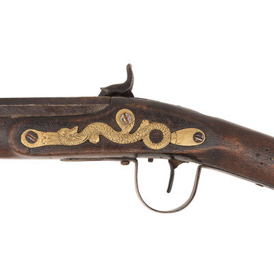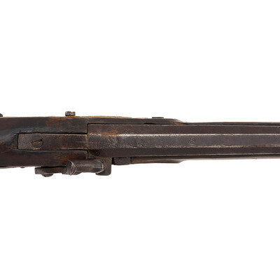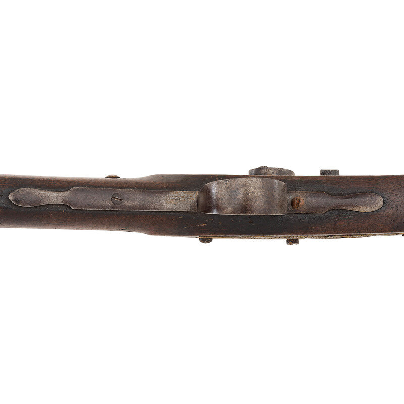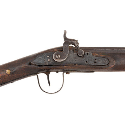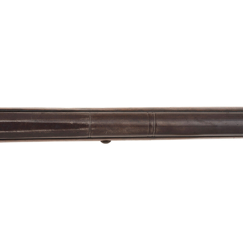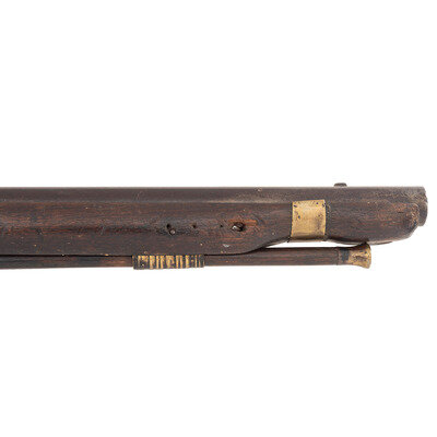 .62 caliber. 42.5" three-stage octagon to round pinned barrel. SN: NSN. Moderately oxidized metal, brass furniture, walnut stock. Percussion altered flint lock marked with the "{Circle-Fox}" under the bolster and "BARNETT" in a vertical arc at the tail. Barrel with Liege proof mark on top flat. Simple drum bolster alteration using an ill-fitting commercial percussion hammer. Three-screw brass serpent side plate, flat brass screw-retained buttplate, oversized iron triggerguard. No apron around the tang, missing thumb piece. Simple sheet brass forend reinforcement. Stock decorated with tacks, many of them missing. Corrugated brass ramrod pipes, brass tipped wood ramrod.