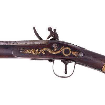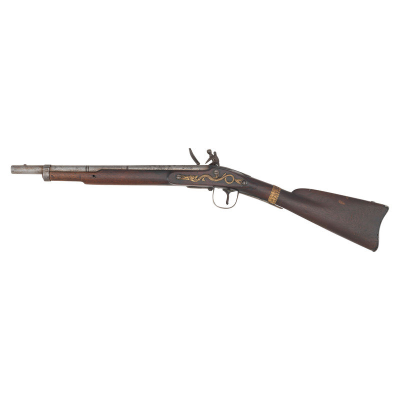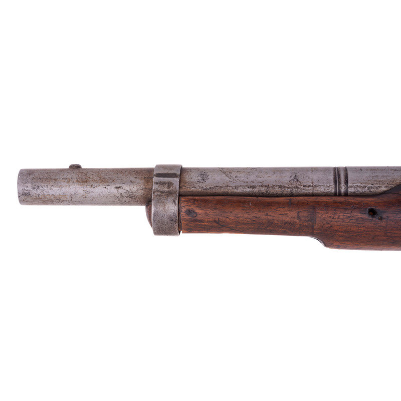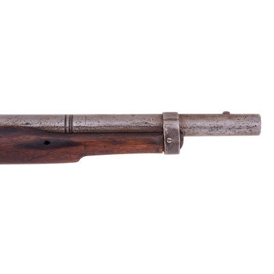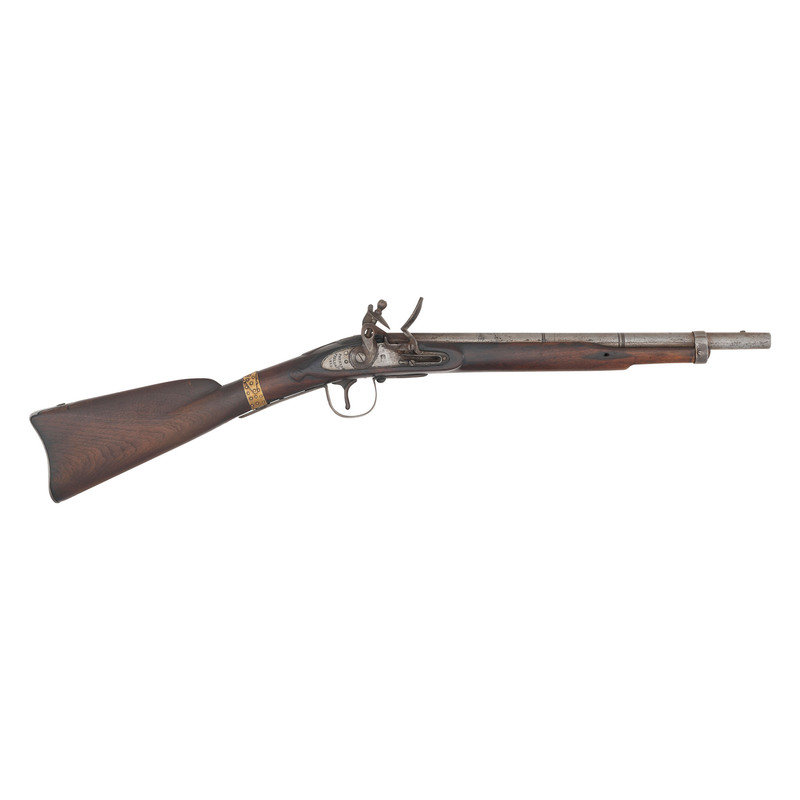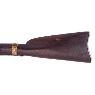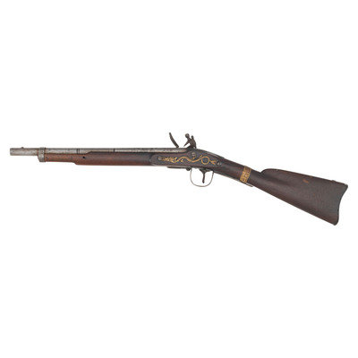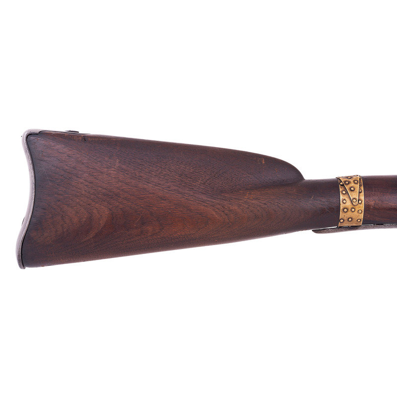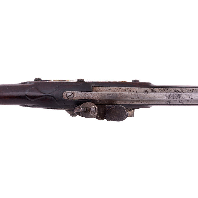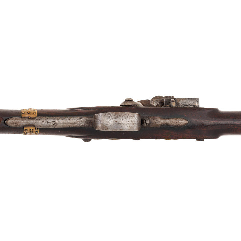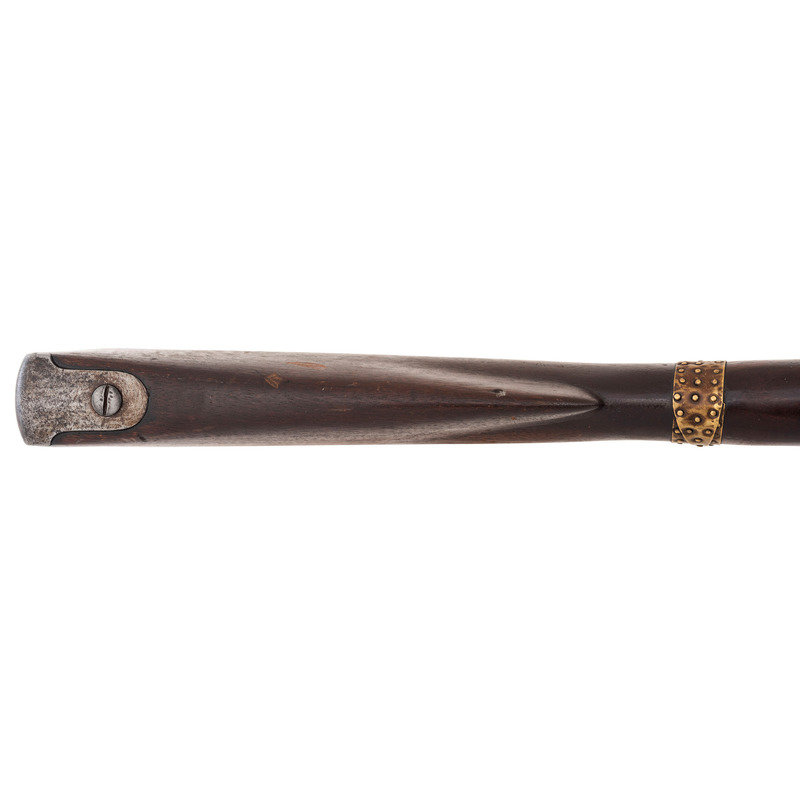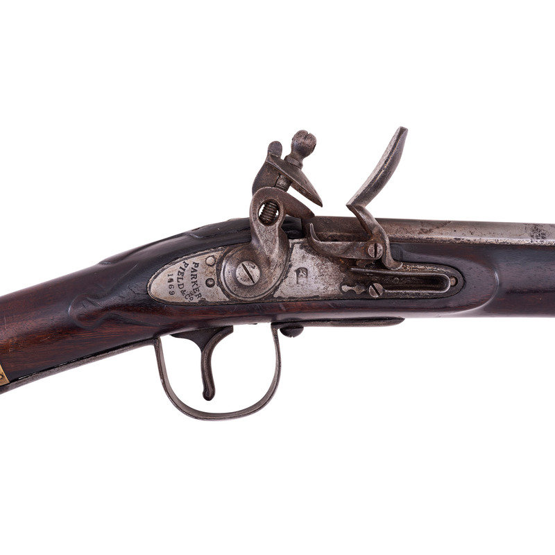 .58 caliber. 18" three-stage octagon to round barrel with baluster turned rings at the transitions, shortened from full length with added barrel band. SN: NSN. Bright finish, brass and iron furniture, walnut stock. Round-tailed lock remains in original flint with a bridled and fenced, rounded iron pan and rounded, reinforced cock. Lock marked in a three-line arc at the tail "PARKER/FIELD & Co/1869" and with the "{Tombstone Fox/EB}" Hudson's Bay Company trademark under the pan. Barrel with weak London commercial proof marks on the breech and another HBC mark on the top flat. The barrel was shortened with a narrow barrel band added during the period of use and the buttstock was replaced with a military musket butt during the period of use as well. Mr. Ness notes that guns shortened in this manner for use in "Buffalo Running" and suggests the butt was broken and replaced at some point. It is equally possible that the gun was shorted and the butt remove for concealed use as a "blanket gun" and a butt was later reattached for more conventional use. The added musket butt appears to be from a European gun and is neatly attached with a an old riveted brass band at the junction. An interesting and attractive Native-modified Northwest Trade Gun with a really great "been there, done that" look. Parker, Field & Sons started to produce arms for the Hudson's Bay Company under contract in 1837 and continued to do so until 1883. In 1875, the HBC contracts show the name changed to Parker, Field & Co, although arms bering that marking were produced by the late 1860s.