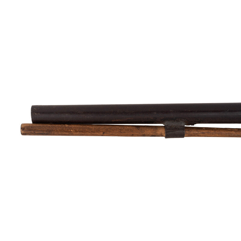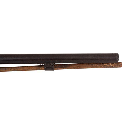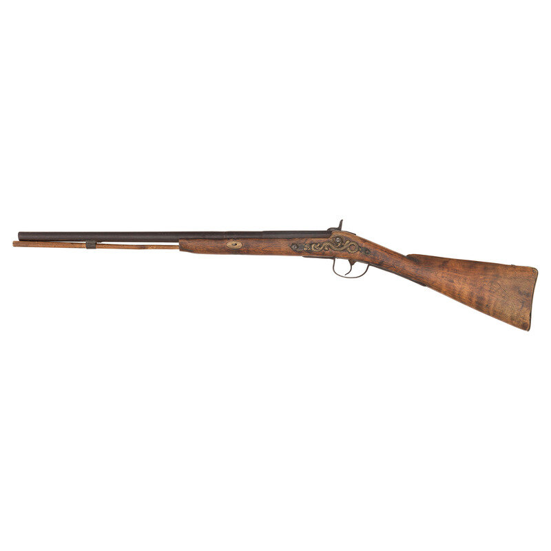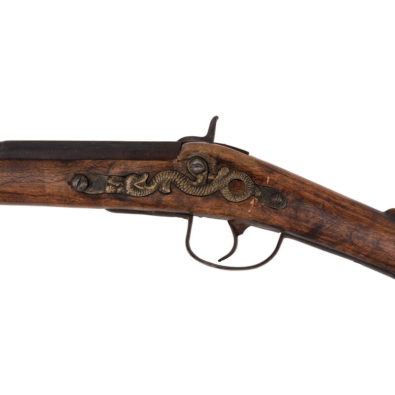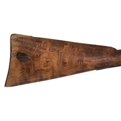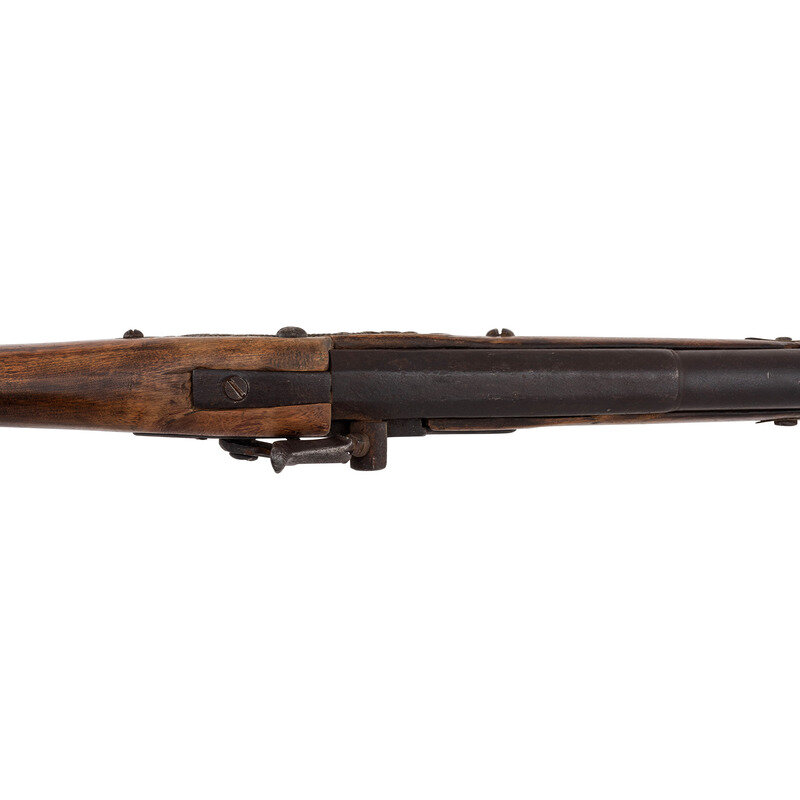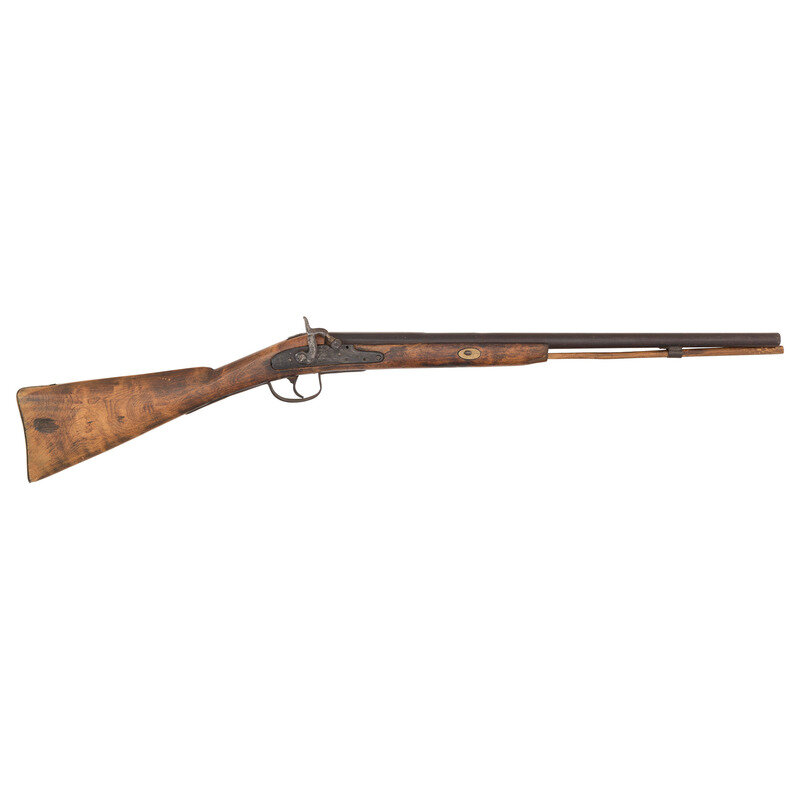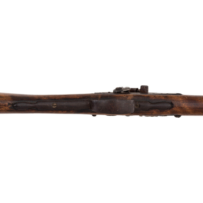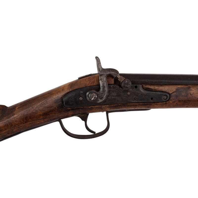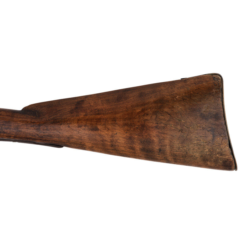 .58 caliber. 23.5" wedge-retained three-stage octagon to round barrel. SN: NSN. Moderately oxidized metal, brass and iron mountings, period of use replaced hardwood stock. Percussion altered flint lock with drum bolster and crude percussion hammer is marked "PARKER" over "1839" in two arcs at the tail. Breech with London commercial proof marks. Gun shortened during the period of use, barrel cut at least 12"-13". Gun restocked during there period as well with a replacement buttplate, but retains the serpent side plate and large iron triggerguard. Barrel secured by a crude iron wedge with brass escutcheon plates. Shortened gun is nominally 29" in overall length, making it more handy for use on horse back or in dense brush. A single iron thimble retains a wood ramrod.