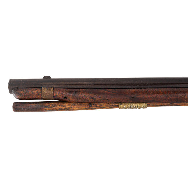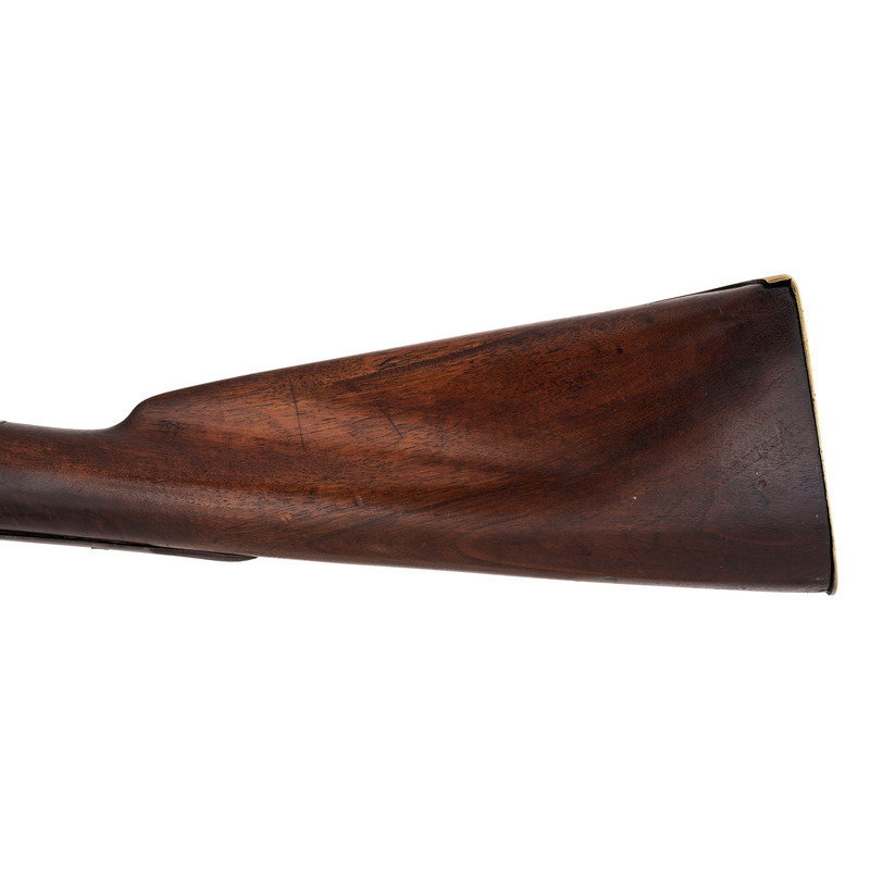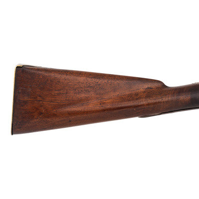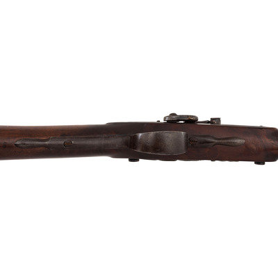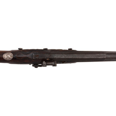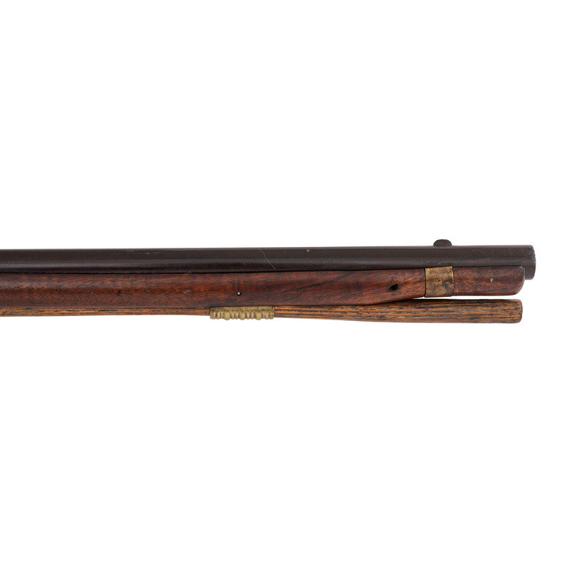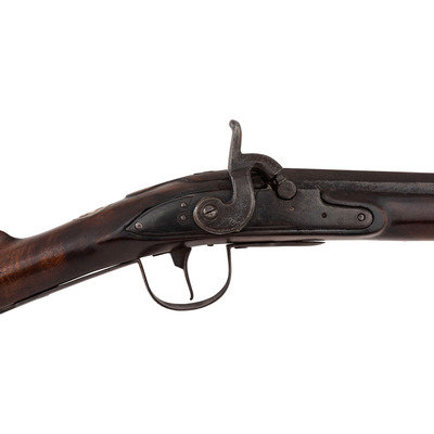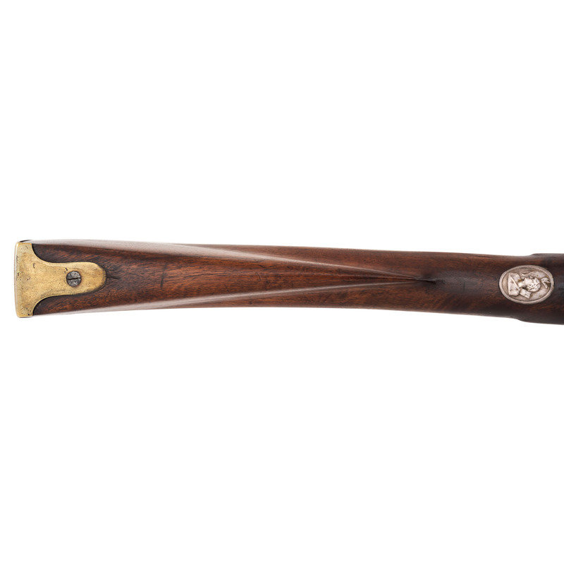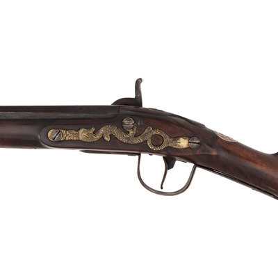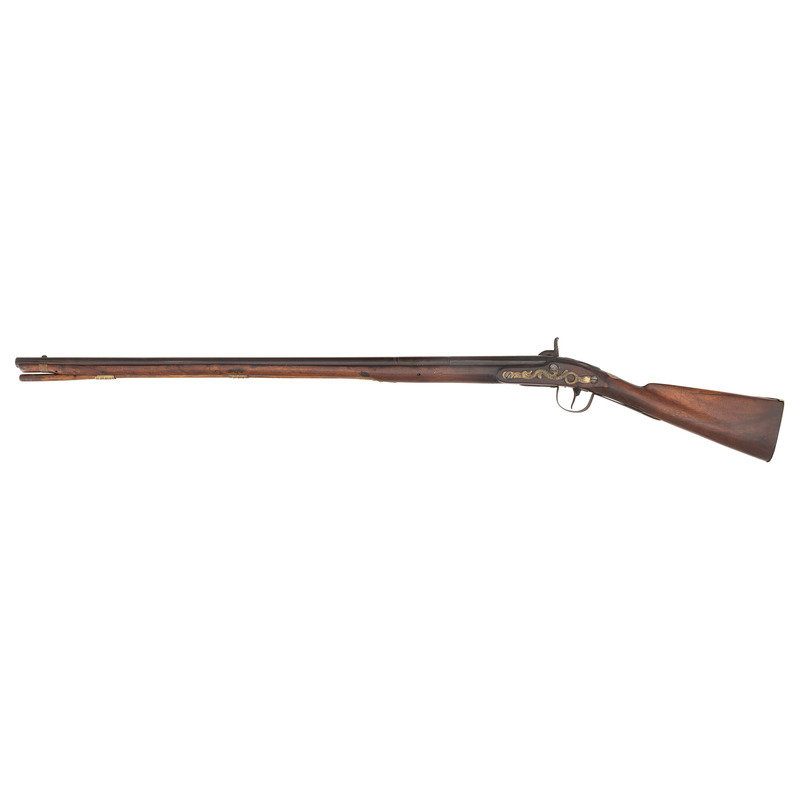 .60 caliber. 36" pinned three-stage octagon to round barrel. SN: NSN. Oxidized metal, brass and iron furniture, full-length walnut stock. Percussion altered flint lock with commercial percussion hammer and drum bolster. Lock marked with the "{Circle-Fox}" trademarks, as is the top flat of the barrel. Breech with post-1813 Birmingham commercial proof marks. Mounted with a German silver "Indian Chief" wrist escutcheon, three-screw brass dragon motif serpentine side plate, screwed flat brass buttplate, oversized iron triggerguard and a sheet brass reinforcement band near the forend tip. Corrugated brass pipes secure an old wood ramrod. Raised carved apron around the breech plug tang. A nice example of a 1st half of the 19th century "Chief's" trade gun that had its working life extending into the percussion era.