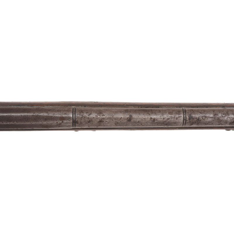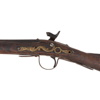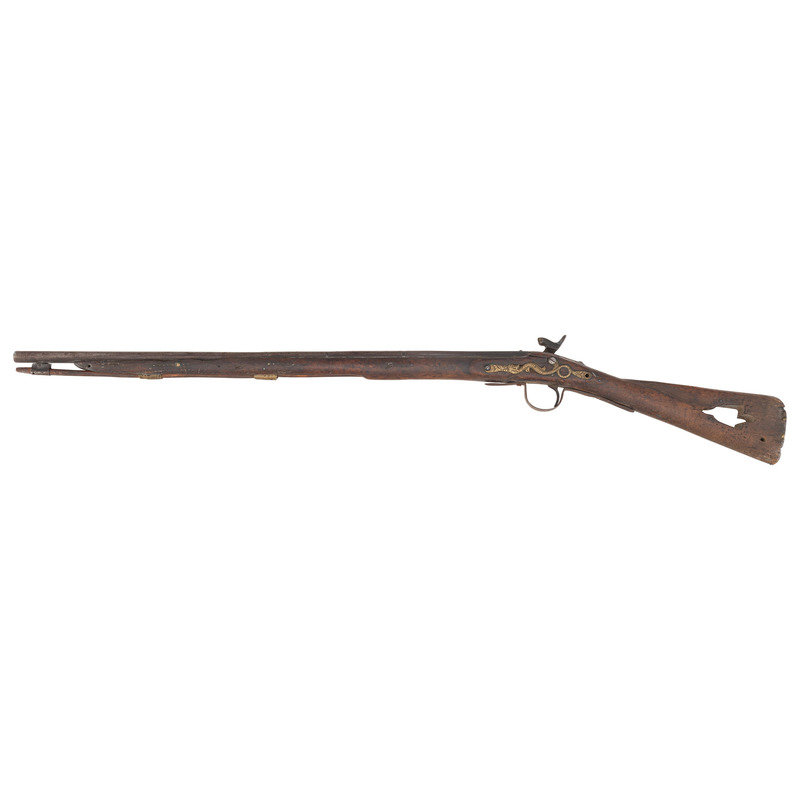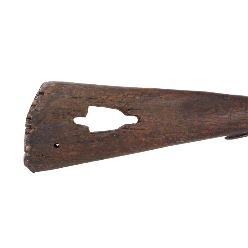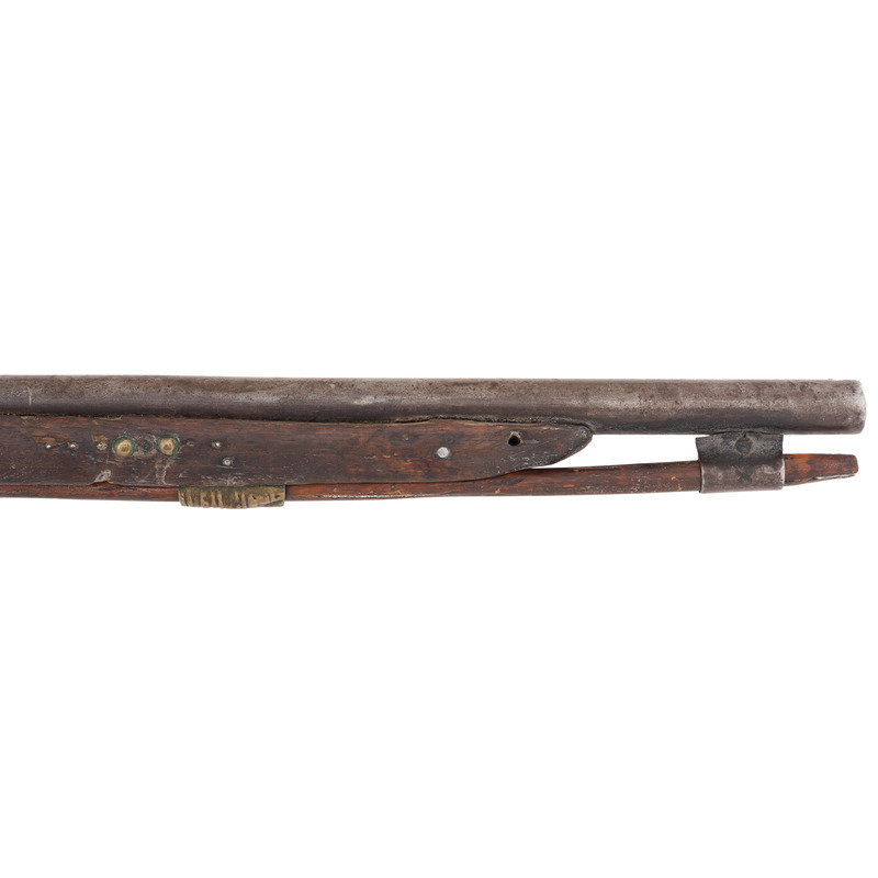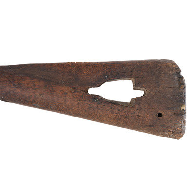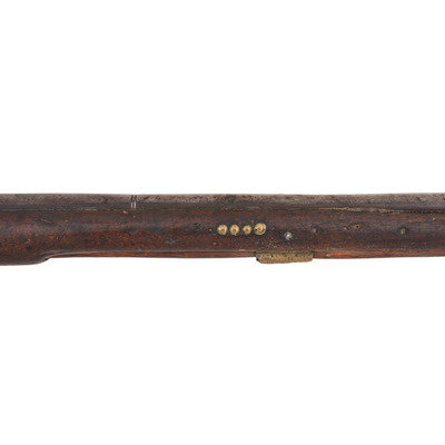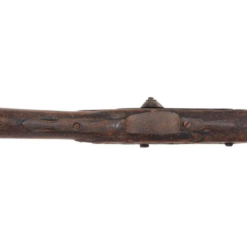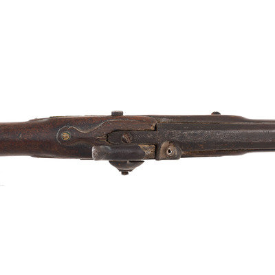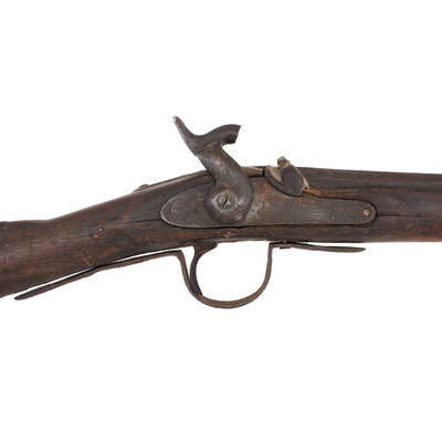 .58 caliber. 31.5" pinned three-stage octagon to round barrel. SN: NSN. Browned finish, brass and iron furniture, walnut stock. Flat, Enfield style percussion lock marked with the usual Isaac & Hollis trademark at the tail and "I HOLLIS & SONS/LONDON" forward of the hammer. Left angled barrel flat with Birmingham commercial proofs and "24" gauge mark, indicating .58 caliber. Near relic condition shortened and modified stock with buttplate removed, an arrow design cut through the buttstock, the barrel shortened around 6" and forend shortened similarly. Three screw serpent side plate with rear screw missing, oversized iron triggerguard, two corrugated brass ramrod pipes with an additional sheet iron pipe added near the muzzle secured through a barrel tenon with an old nail. Pipes secure an old wooden ramrod. Stock with typical raised carved aprons around the breech plug tang and at the tail of the lock and counterpane. Stock with numerous added old tacks and many more missing leaving old iron shanks without heads in the forend and butt as well as some tack holes. A great looking, unmolested Native used and modified trade gun.