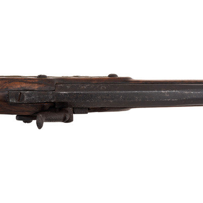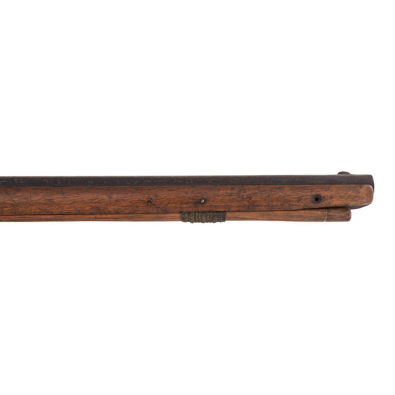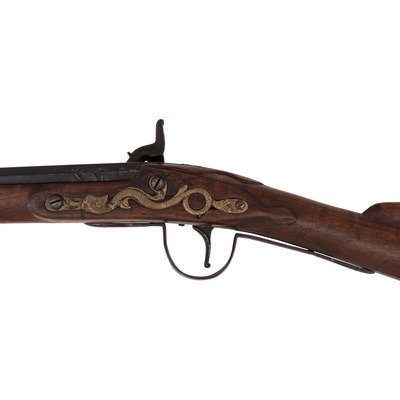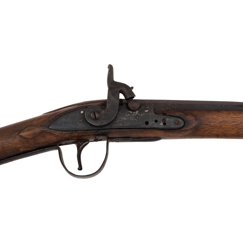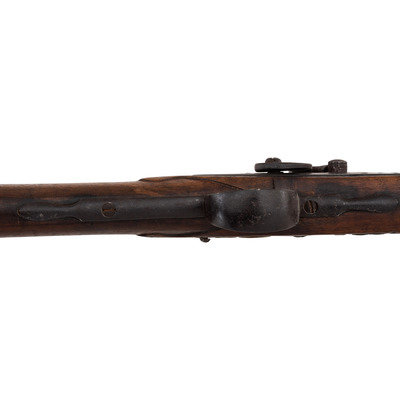 .60 caliber. 40" pinned three-stage octagon to round barrel. SN: NSN. Oxidized metal, brass and iron furniture, full-length walnut stock. Percussion altered flint lock marked with the American Fur Company "{Tombstone/Fox}/IA" mark of John Jacob Astor forward of the hammer and marked in a two line arc at the tail "W. CHANCE/& SON". Barrel with drum bolster alteration to percussion and marked with post-1813 Birmingham proofs and "LONDON" on the top flat. Stock with the "{Circle-Fox}" logo on the obverse butt. Typical trade gun features including a 3-screw brass "serpent" side plate and an oversized iron triggerguard. Flat brass screwed buttplate, corrugated brass pipes secure a wood ramrod.