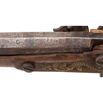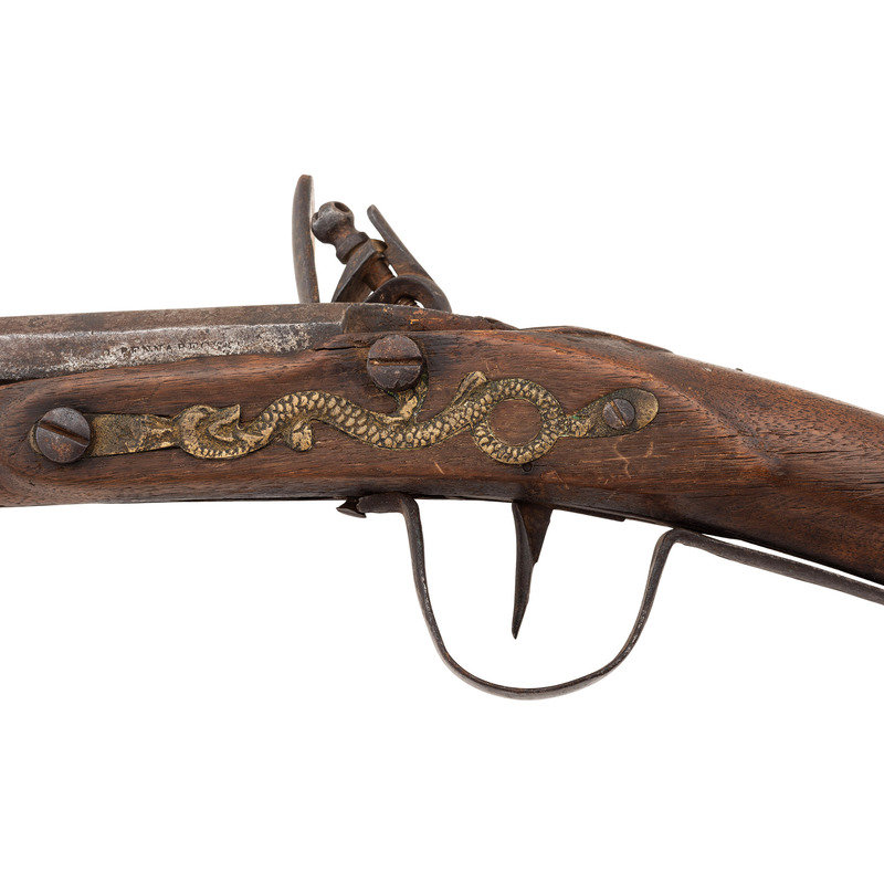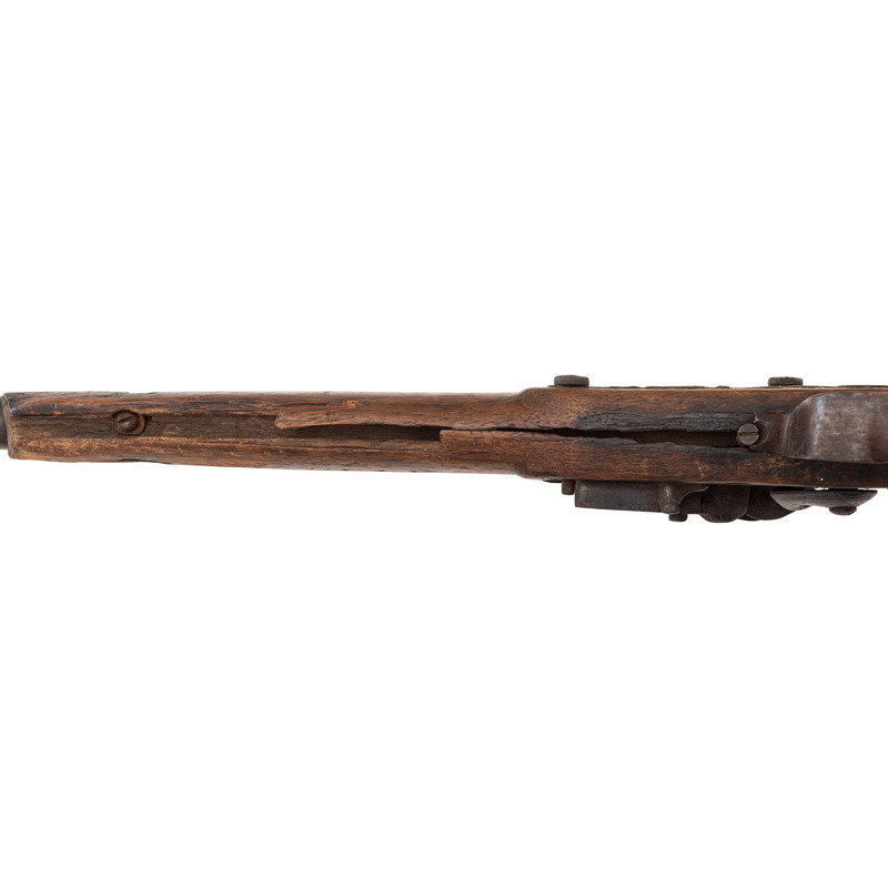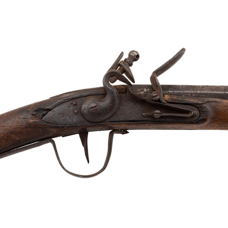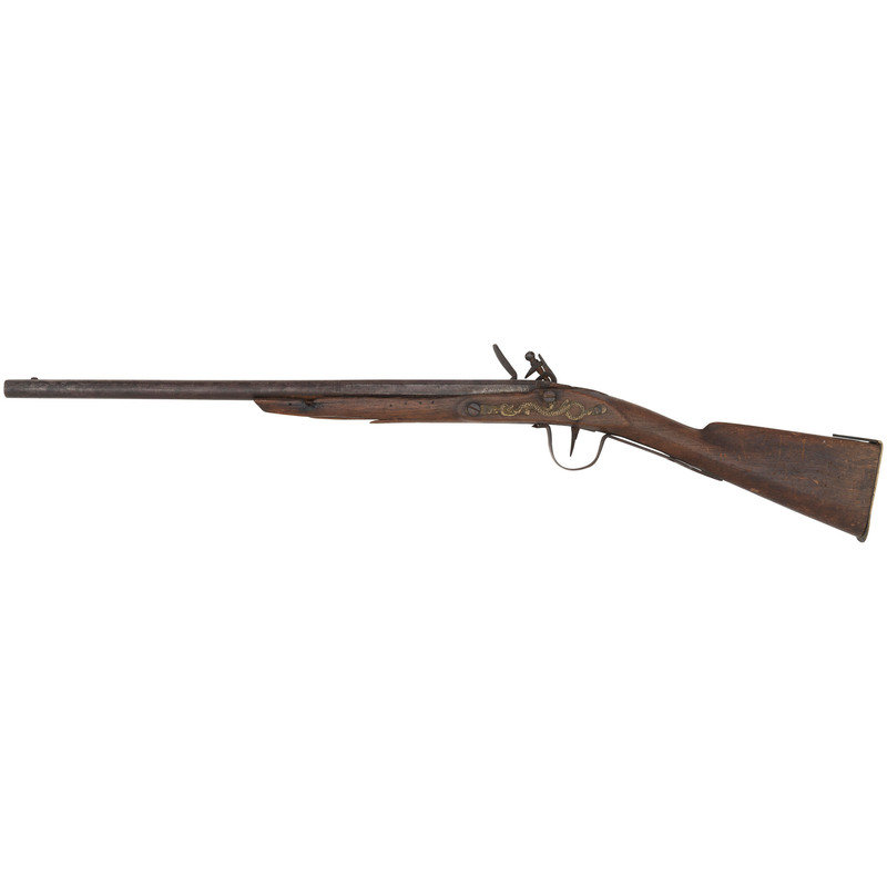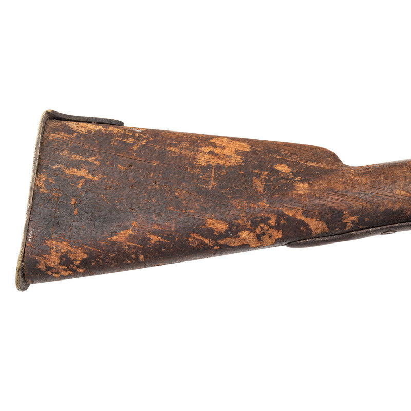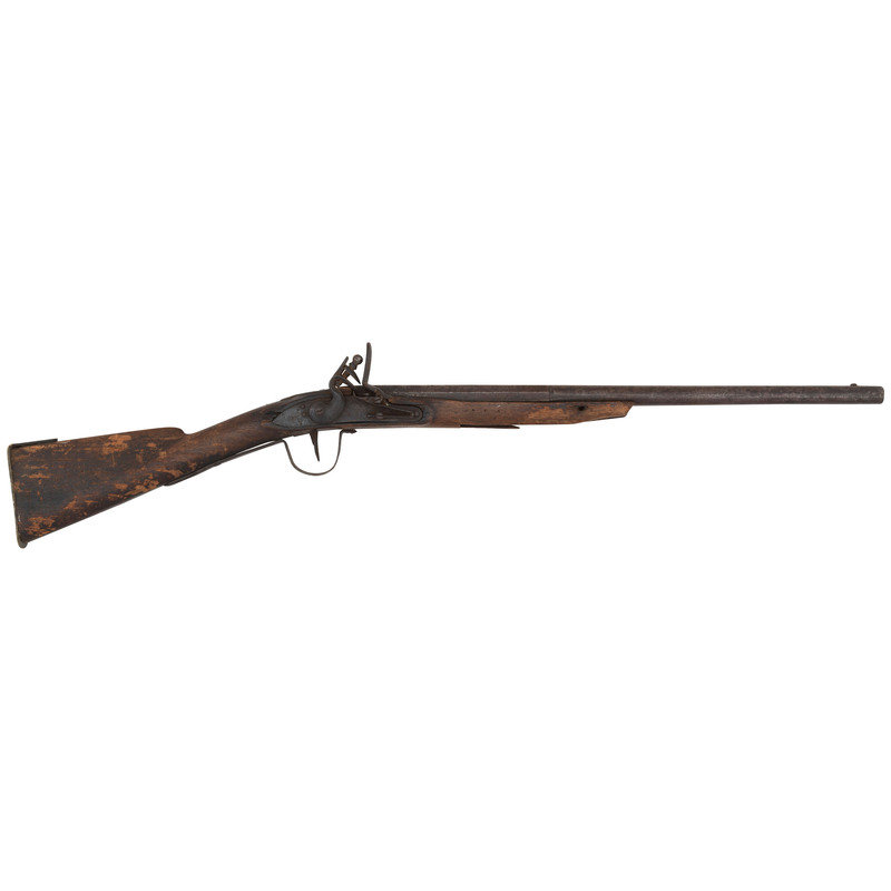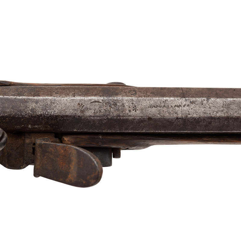 .54 caliber. 21.875" pinned three-stage octagon to round barrel with baluster turned rings at the transition. SN: NSN. Heavily oxidized brown metal, brass and iron furniture, walnut stock. Flat pointed flint lock marked "H.E. LEMAN" in a vertical act at the tail and with the "{Tombstone Fox/PA}" mark typical of Leman's Northwest Trade Guns. Barrel with Birmingham proofs on the left angled flat and marked "H.E. LEMAN" in an arc and "LANCASTER, PA" on the top flat. The gun appears to have been cut down during the period of use to a much handier length with about 14" of barrel and probably 24" of stock removed, and a brass blade sight added near the muzzle. Butt shortened about 1" and buttplate reattached. Shortening trade guns to "carbine" length was quite popular with the Native Americans, making the guns easier to use on horseback or carry in dense brush. This gun is well worn with heavy period use and damage and also shows a number of old tack holes in the butt and forend where brass tacks were in place at one point in time. A salty and completely honest, well-used Native trade gun.