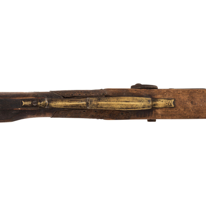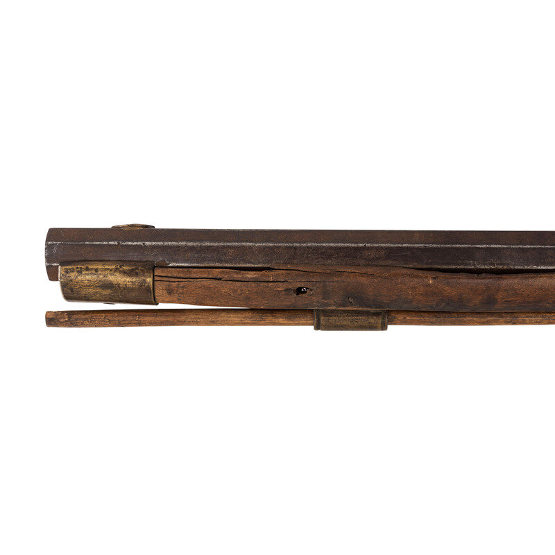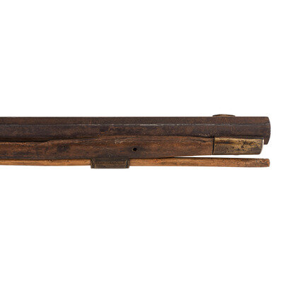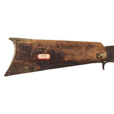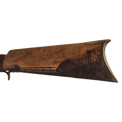 .45 caliber. 34" pin-retained octagonal barrel. SN: NSN. Attic brown patina, brass furniture, walnut stock. Percussion lock marked in two lines "CONGESTOGA/RIFLE WORKS", top flat of barrel marked "P.A." Double-set triggers, dovetailed buckhorn rear sight, dovetailed blade front sight. Brass furniture includes buttplate, spur triggerguard, two faceted thimbles and the entry pipe and the nose cap. Stock with an old iron wrapped and brass reinforced repair at wrist and brass plate repaired crack in butt. Rifle includes a hand written tag that says the rifle was purchased from James O Aplan who acquired the rifle on the Standing Rock Reservation.