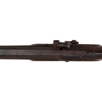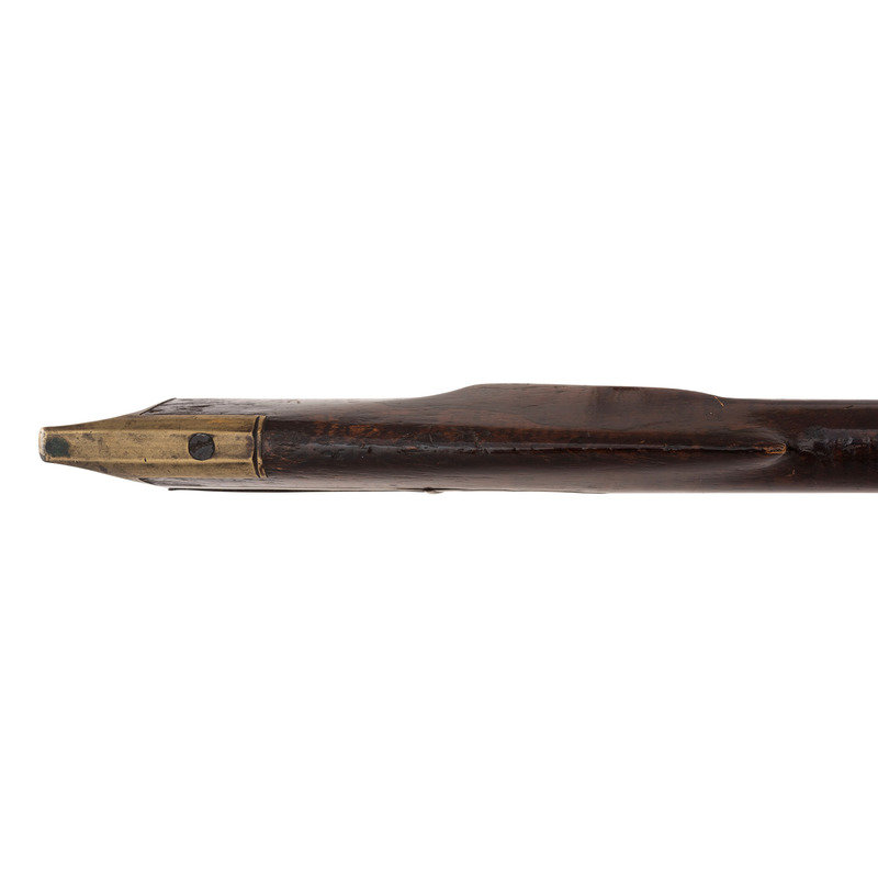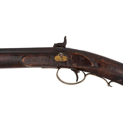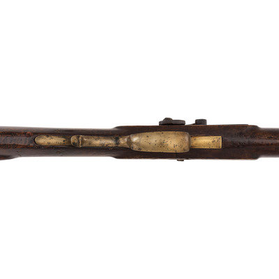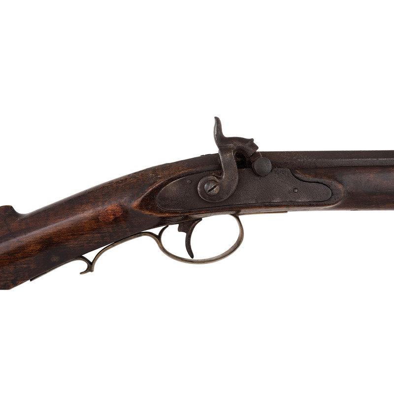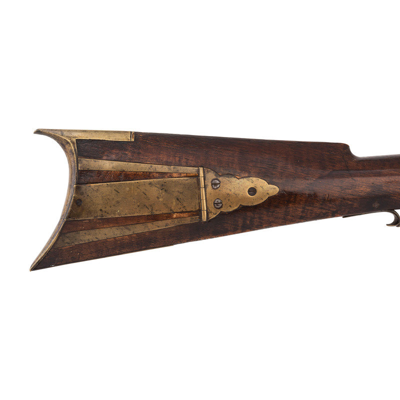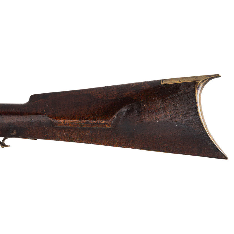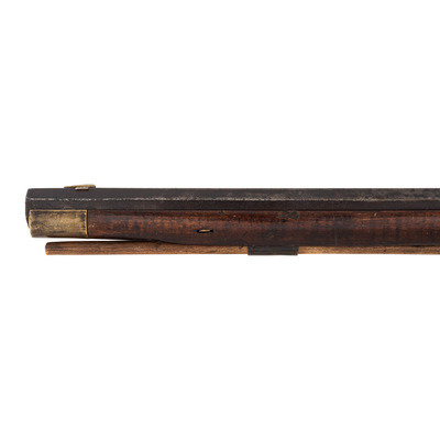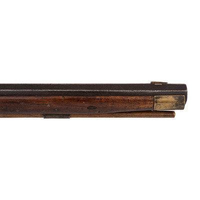 .54 caliber. 42.5" wedge-retained octagonal smoothbore barrel. SN: NSN. Browned finish, brass furniture, hardwood stock with plain wrist. Barrel marked "J FORDNEY/LANCASTER/PA" in three lines behind the rear sight. Unmarked commercial single screw percussion lock with single trigger. Fixed notch dovetailed rear sight, dovetailed German silver Rocky Mountain front sight blade. Four-piece, simple Lancaster-style patchbox is unadorned with release in toe plate, which is now missing. Other brass fixtures include rudimentary spur triggerguard, butt plate, toe plate, nose cap, three wedges without escutcheons and two ramrod thimbles and an entry pipe. Includes an old brass tipped wood ramrod. Jacob Fordney (1808-1870) was a well-known Lancaster gunsmith who produced many of the early rifles that went west with settlers during the early days of western expansion. In 1837 he contracted with the US Government to produce 250 Indian Trade Rifles. Mr. Ness' notes indicate that he feels that this is one of those rifles.