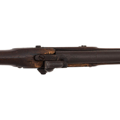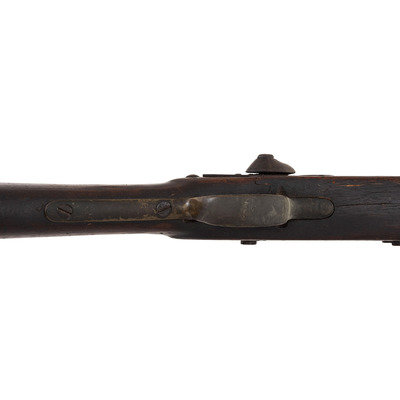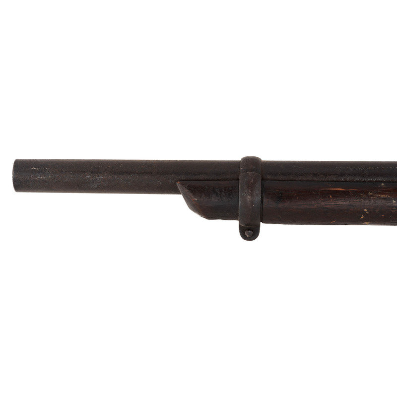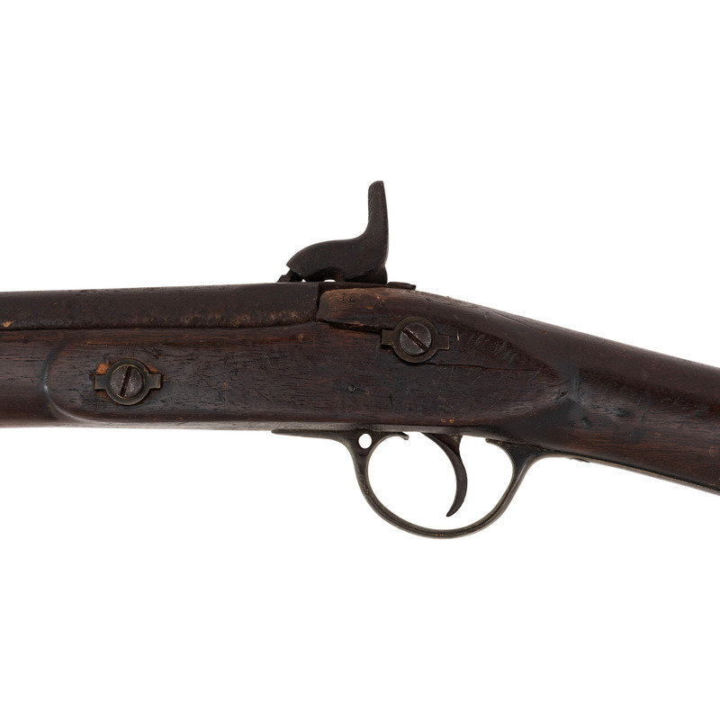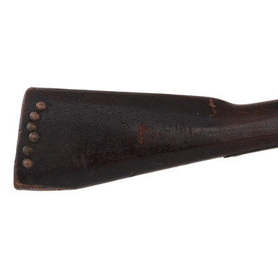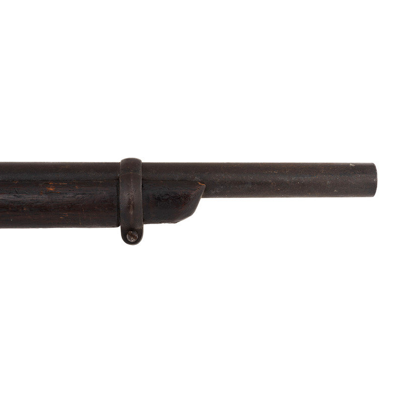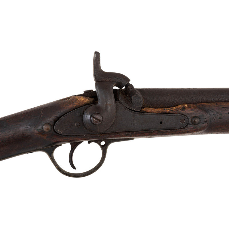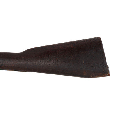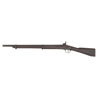 .577 caliber. 26.75" barrel retained by two clamping barrel bands. SN: NSN. Blued finish, brass furniture, walnut stock. Lock marked with usual "{CROWN}" at tail without a VR underneath and "1862/TOWER" forward of hammer. Barrel with remnants of Birmingham commercial proof marks. Period shortened with barrel cut back slightly over 12" and smooth bored, stock cut back to just in front of the middle barrel band. Butt shortened slightly more than 1" as well with buttplate removed. Stock decorated with 8 brass tacks, 6 in a line along the bottom edge of the butt and 1 each at the front and rear of the lock mortise. Rear sight removed, front sight missing, missing sling swivels. Rear barrel band retained by a two old finishing nails. Consignor's notes indicate the gun was purchased from Mel Overweeg of Wagner, SD who acquired the gun on the Yankton Sioux Reservation.