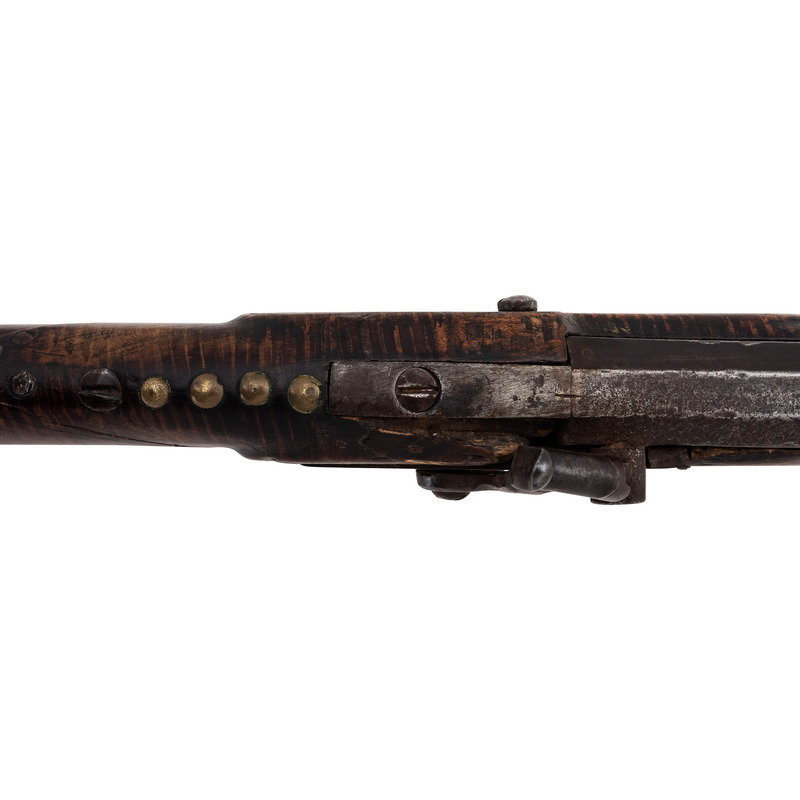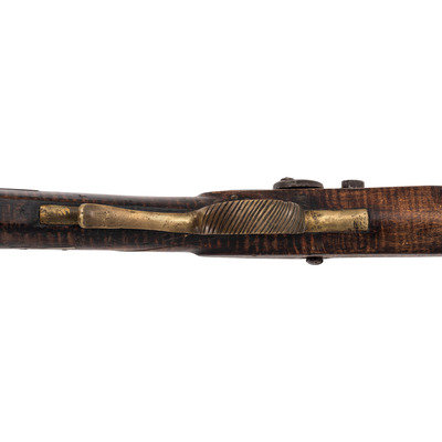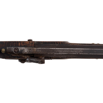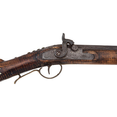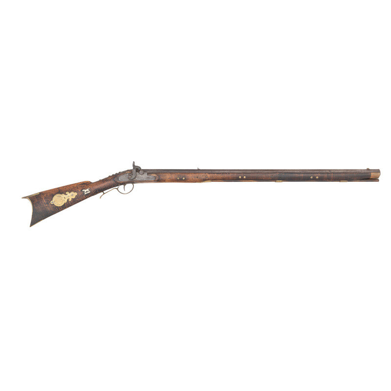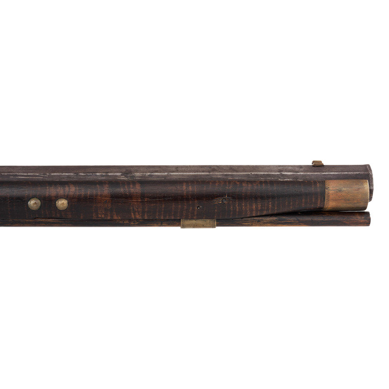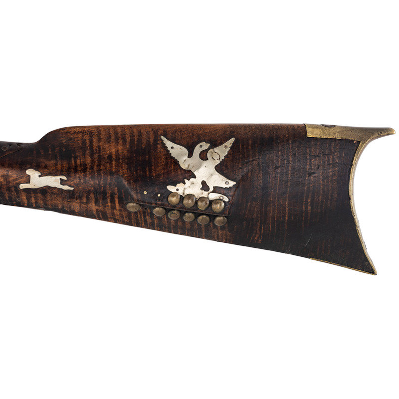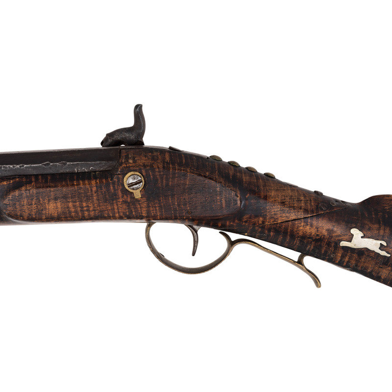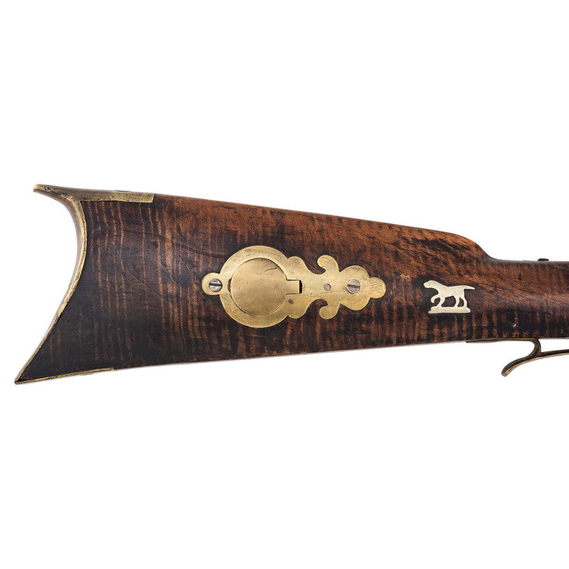 .56 smoothbore. 32.5" pinned octagonal barrel. SN: NSN. Browned barrel, brass furniture, German silver decorations, faux striped maple stock with raised cheek rest. Single screw percussion lock is lightly engraved and marked "LEMAN/LANCTR PA". Barrel with drum bolster is marked "H.E. LEMAN/LANCASTER, PA" and "WARRANTED". Simple commercial round brass patchbox with other plain brass commercial furniture consisting of butt and toe plates, finger extension triggerguard, nose cap, two thimbles and an entry pipe. The smooth rifle is decorated with German silver inlays including a dog on point in the obverse wrist, a dog on the run in the reverse wrist and a spread-winged eagle on the cheek rest. Stock is decorated with brass tacks along the forend and behind the tang on the wrist and on the cheek rest and below it. Some of the tacks are missing, leaving empty holes, while others are missing their heads revealing square brass shanks. The trriggerguard has been decorated by having numerous diagonal lines cut into it. An attractive smooth rifle with the look of some real, legitimate Native use.